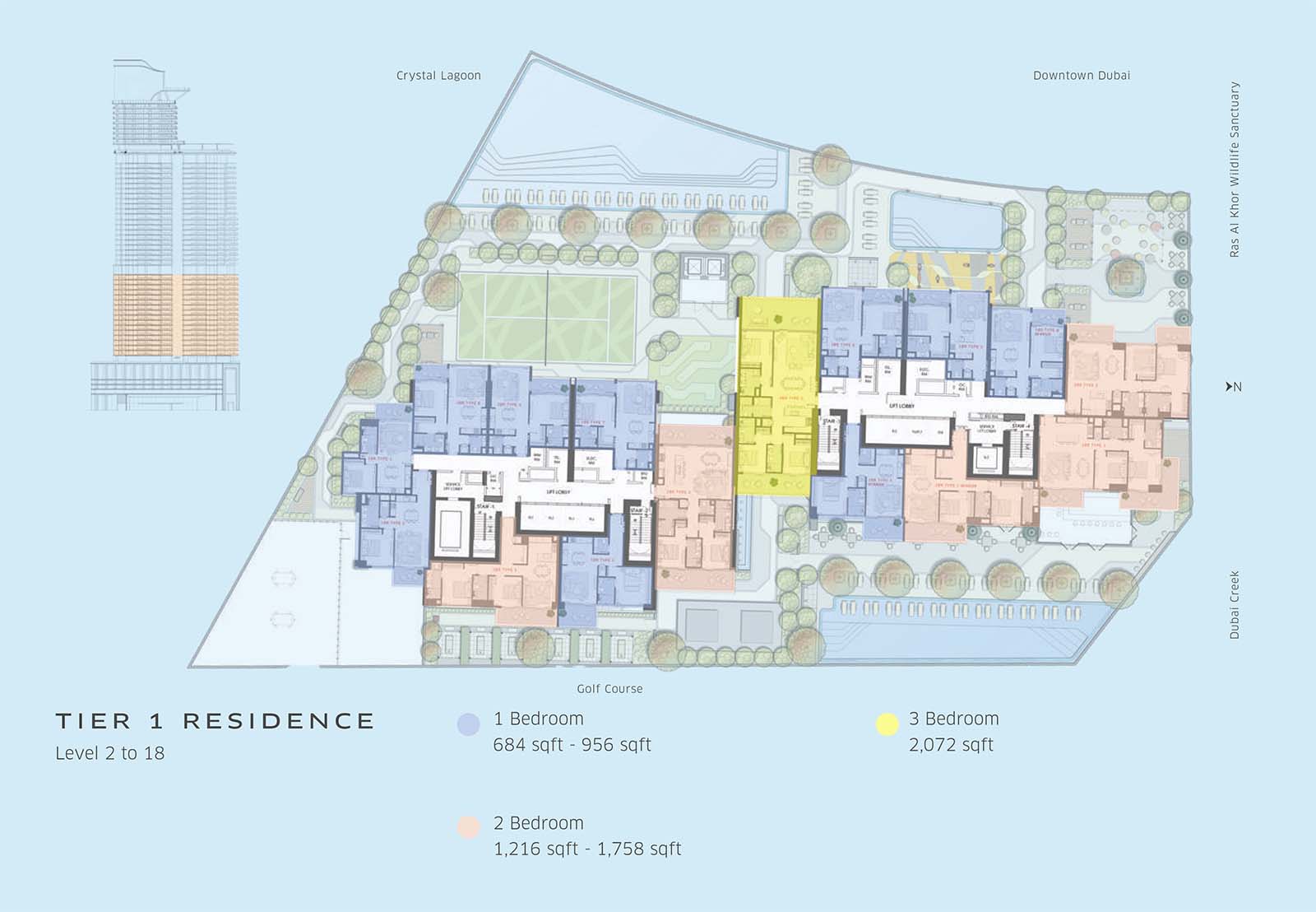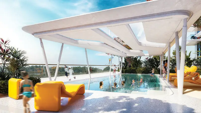 - A robust structure with a ground floor, 8 podium levels, 48 residential floors, and one rooftop.