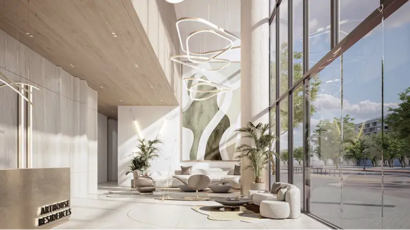 This striking, white, and pearl-like, immaculate architectural masterpiece rises as an artistic vision. Bringing the metropolitan infrastructure style of Manhattan to the UAE’s one of the finest islands, the white lines, glass exterior, and the open concept of the facade reflect the signature remark of the creativity of the Arthouse Hotel NYC brand. Framed by systematically aligned palm trees, the surroundings and the landscaped podium on which the towers are placed create the inspiring visuals and ideal spaces for the perfect resort-style lifestyle.