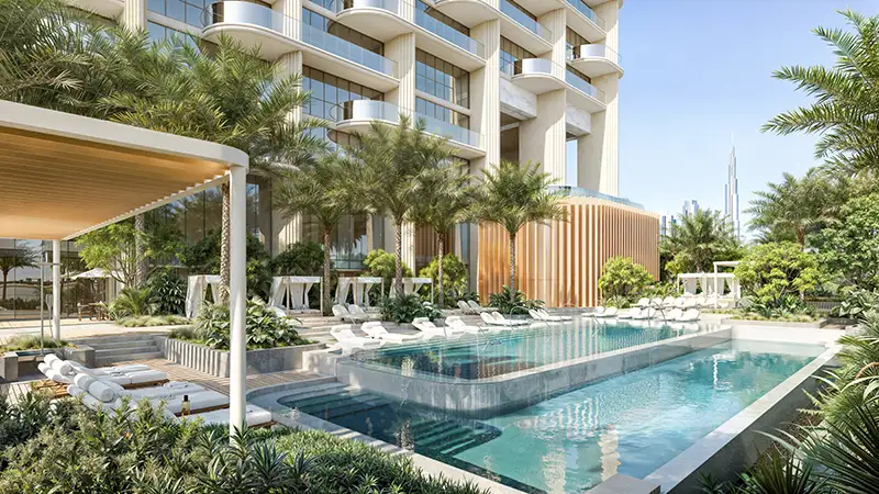 - World-class amenities of an infinity pool, poolside suites, sunken seating area, cabanas, kids’ pool, garden spaces, yoga zone