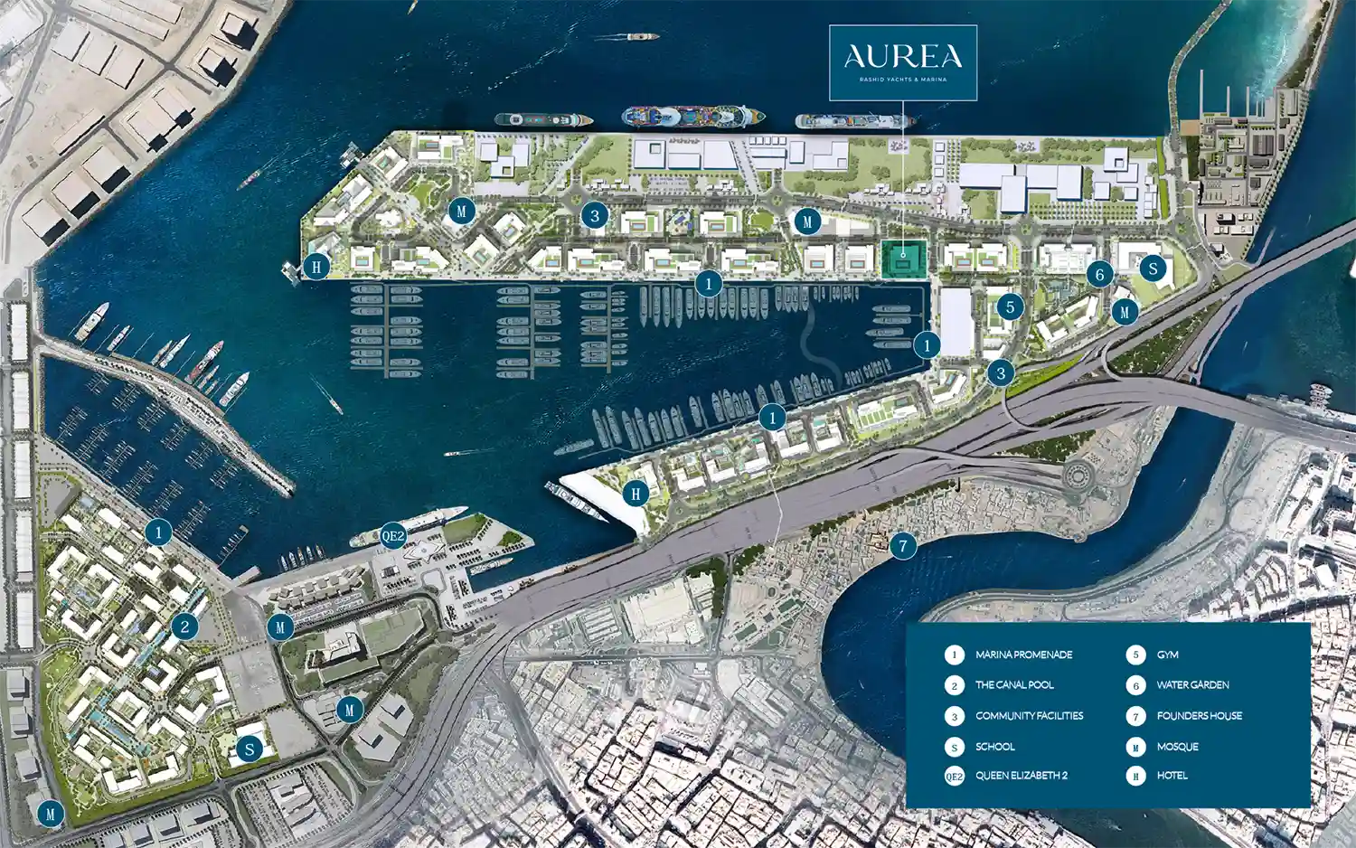 Aurea at Rashid Yachts & Marina is a remarkable residential icon by Emaar Properties, woven in the urban waterfront zone of Dubai with 1 to 3-bedroom apartments. Framed by the Gulf water, this mid-rise address is dedicated to upscale marina living. In the evolving suburban and premium lifestyle destination, each unit is crafted mindfully to capture the sweeping views of the marina with yachts, green parks, and the towering skyscape of Burj Khalifa locality. Step outside to explore a vibrant locality at the water-side promenades that offer top-tier dining, retail, and boutique-leisure experiences to ensure an extraordinary daily routine.