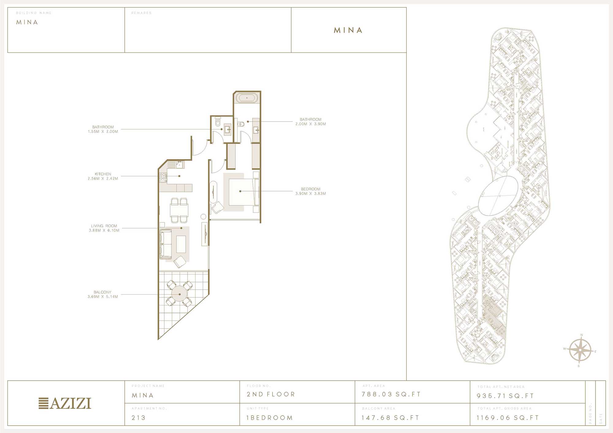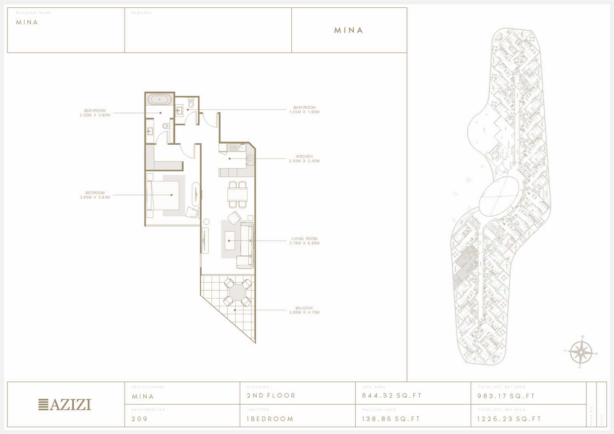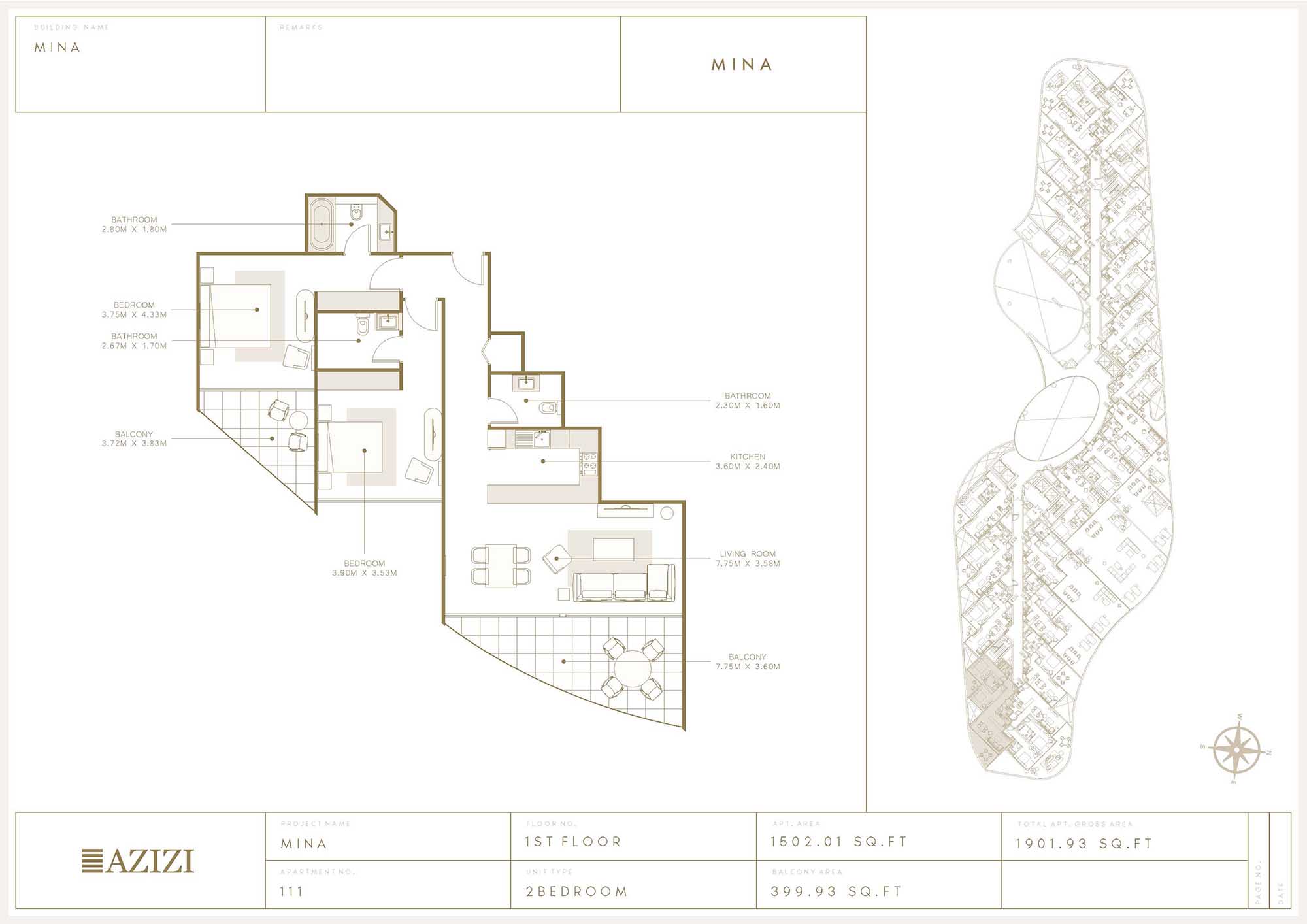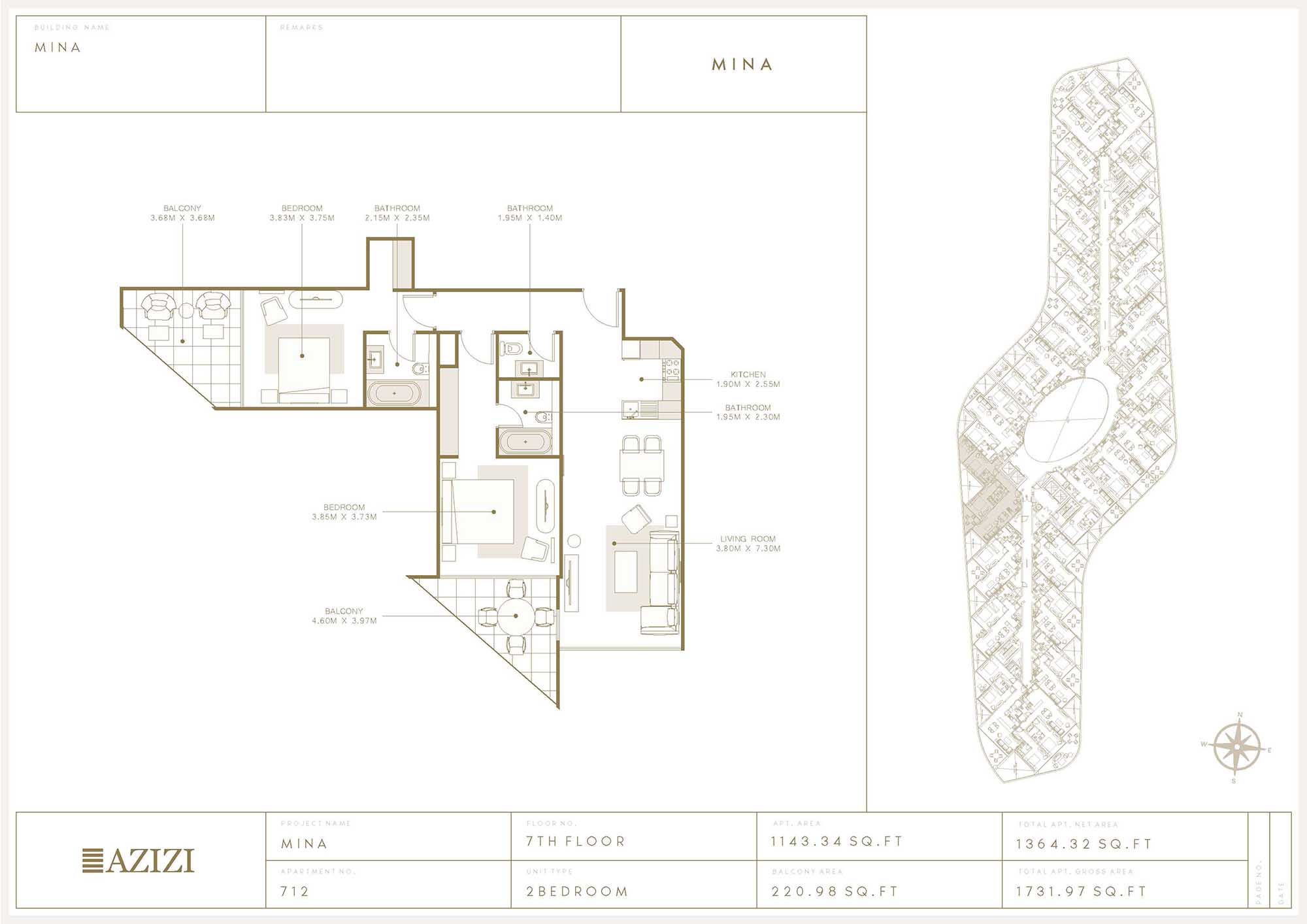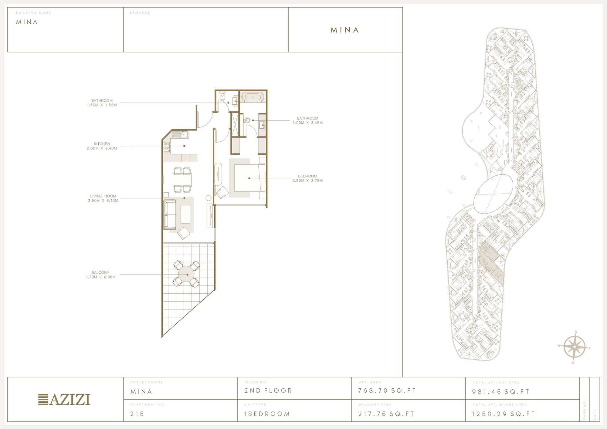 Azizi Mina provides spacious floor plan options offering waterfront designed 1 & 2-bedroom apartments and penthouses located in the serene community of the Palm Jumeirah. The development offers a total no of 178 elegant designed waterfront homes that further offers 120 one-bedroom, and 54 two-bedroom apartments along with four penthouses that are spread over an area of the total gross area of more than 2.3 hectares. While at the same time offers stunning views of the sea, deluxe amenities and interiors in a perfect backdrop of nature and style.