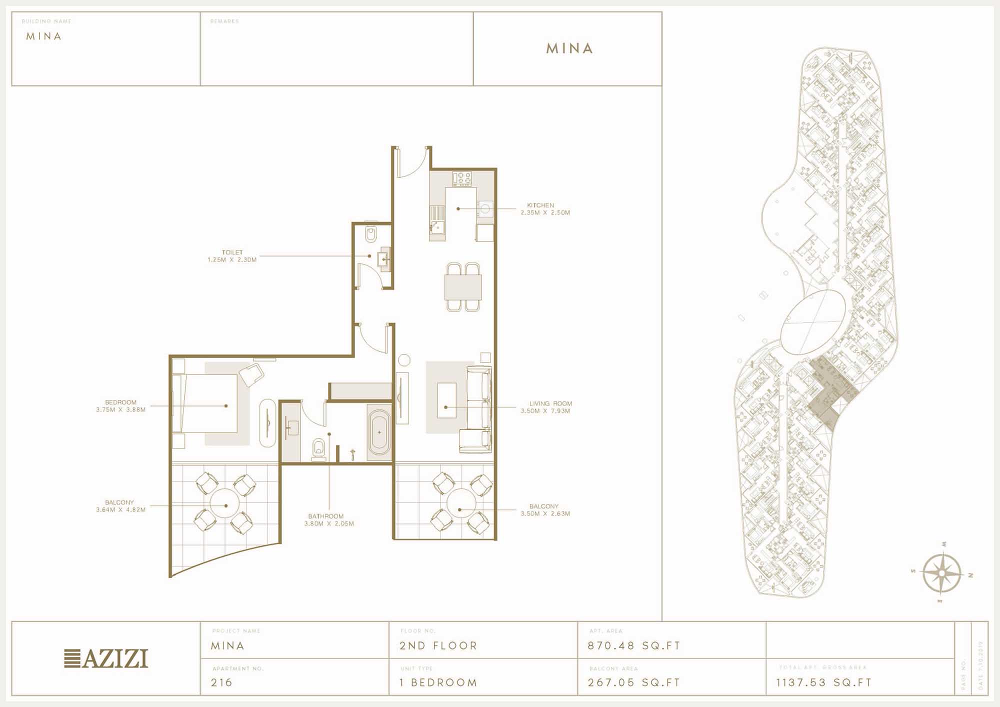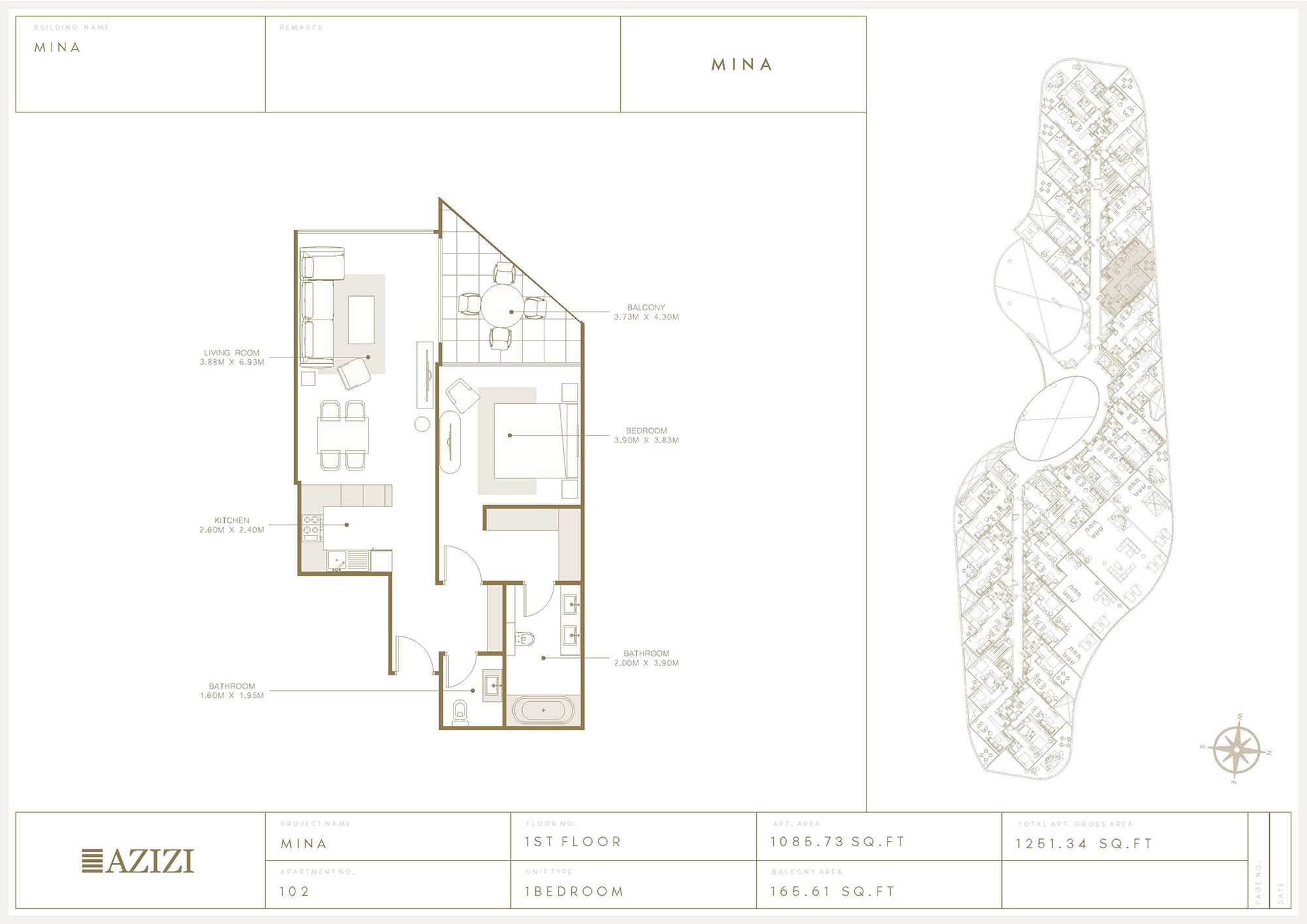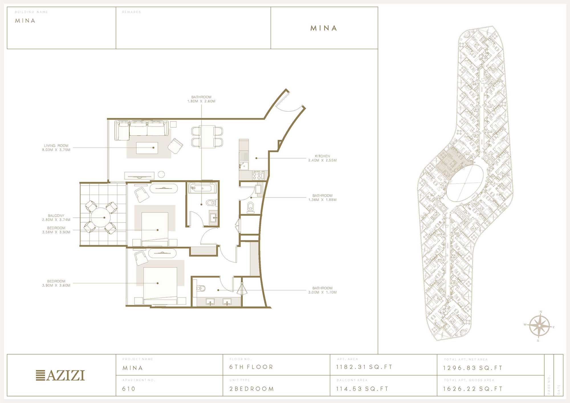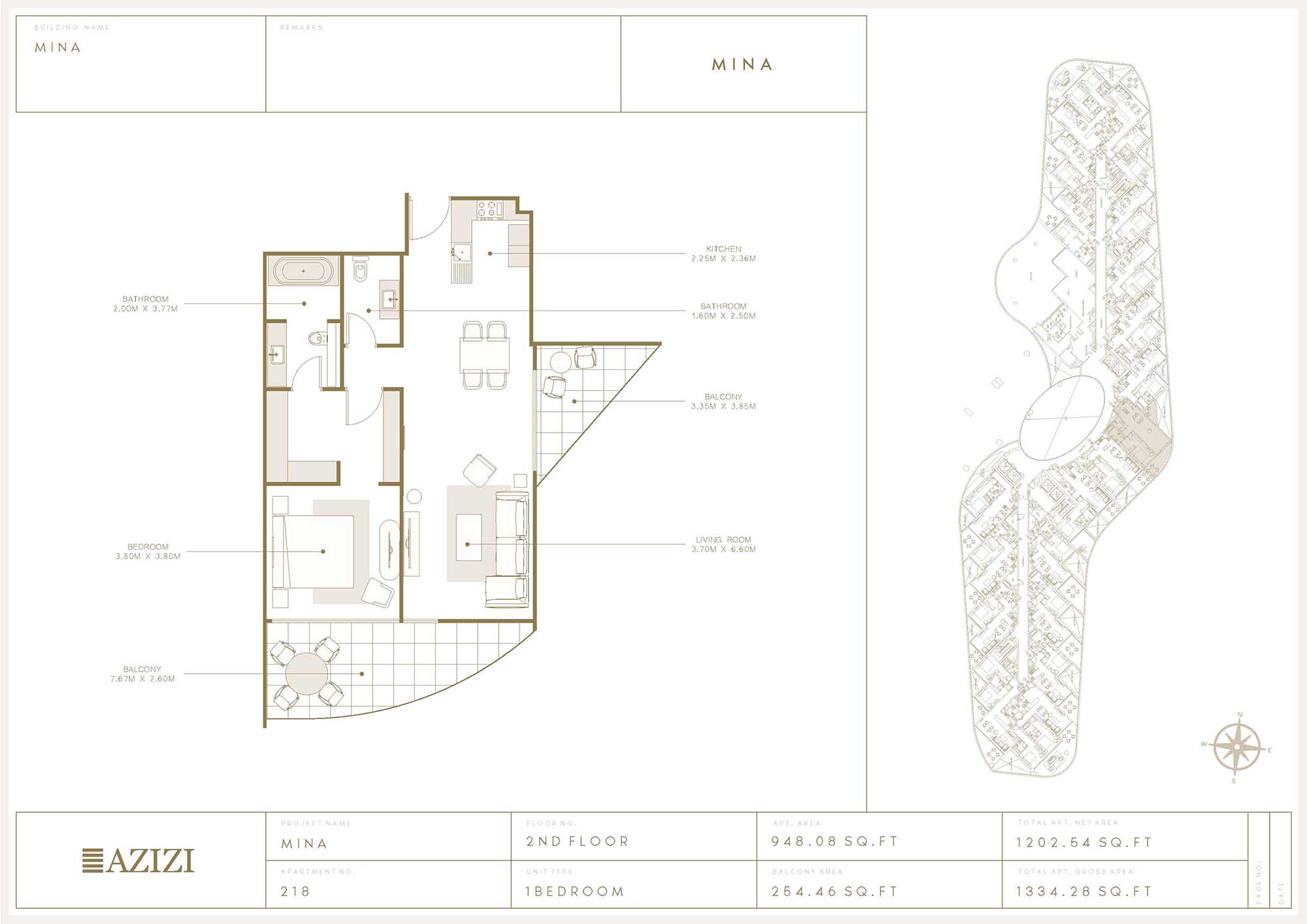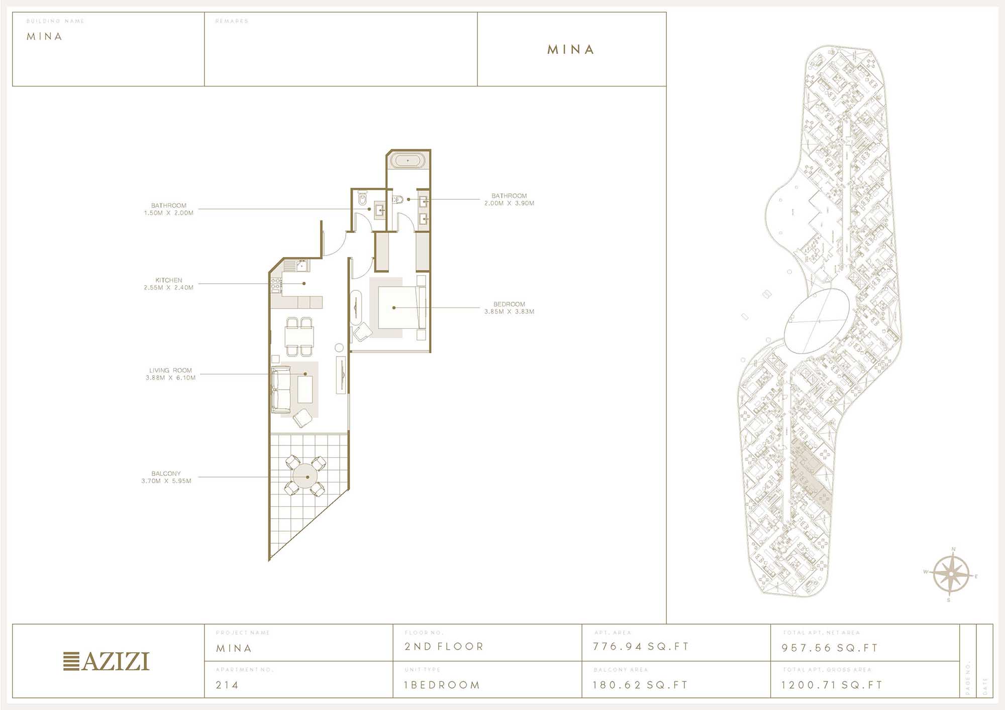 Azizi Mina provides spacious floor plan options offering waterfront designed 1 & 2-bedroom apartments and penthouses located in the serene community of the Palm Jumeirah. The development offers a total no of 178 elegant designed waterfront homes that further offers 120 one-bedroom, and 54 two-bedroom apartments along with four penthouses that are spread over an area of the total gross area of more than 2.3 hectares. While at the same time offers stunning views of the sea, deluxe amenities and interiors in a perfect backdrop of nature and style.