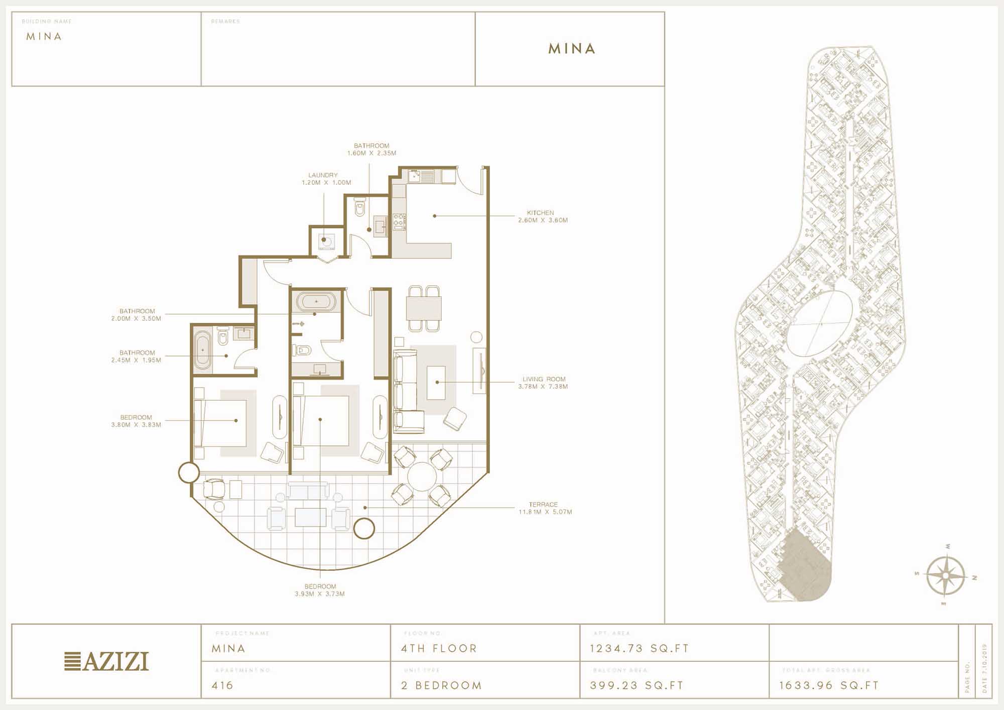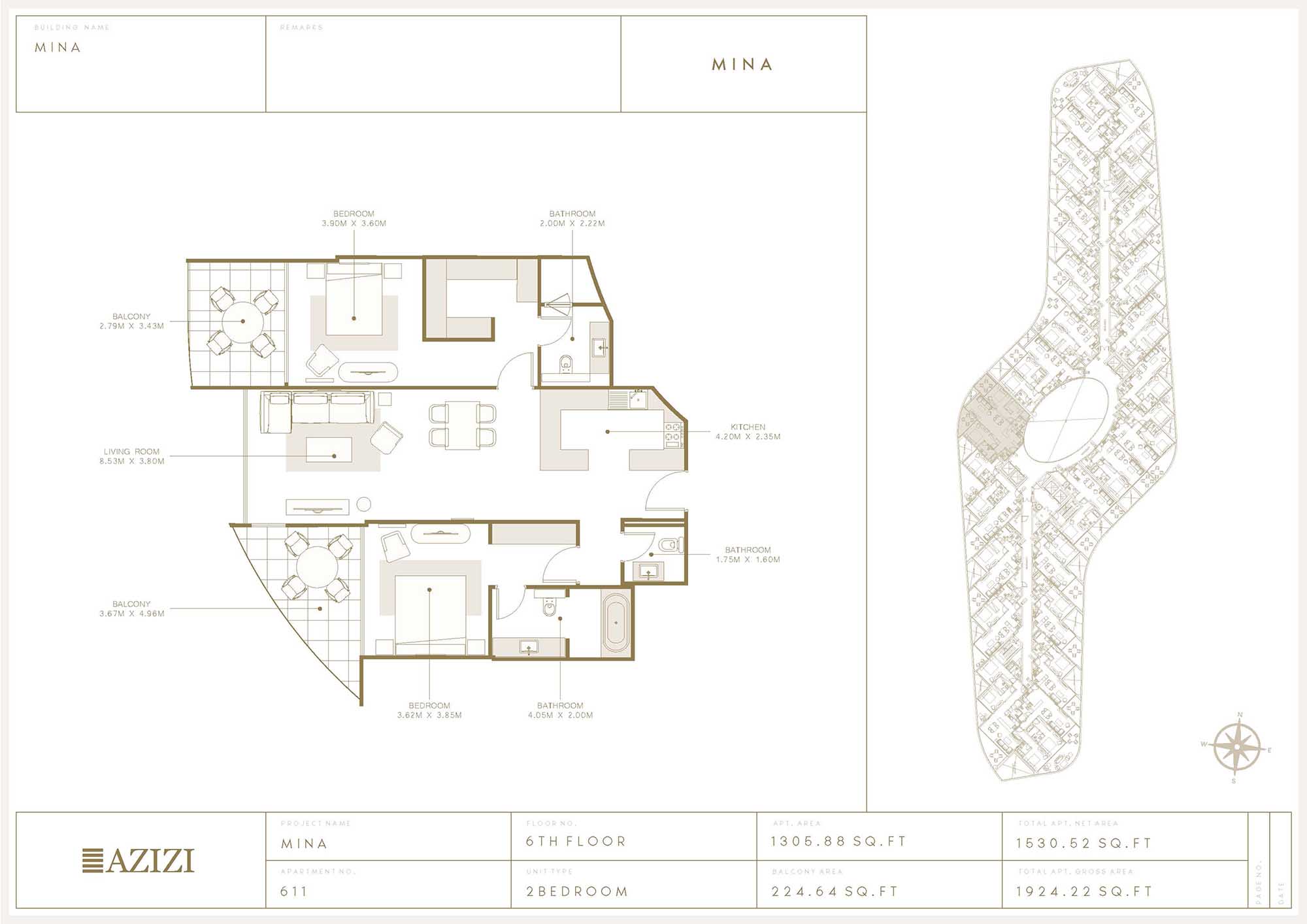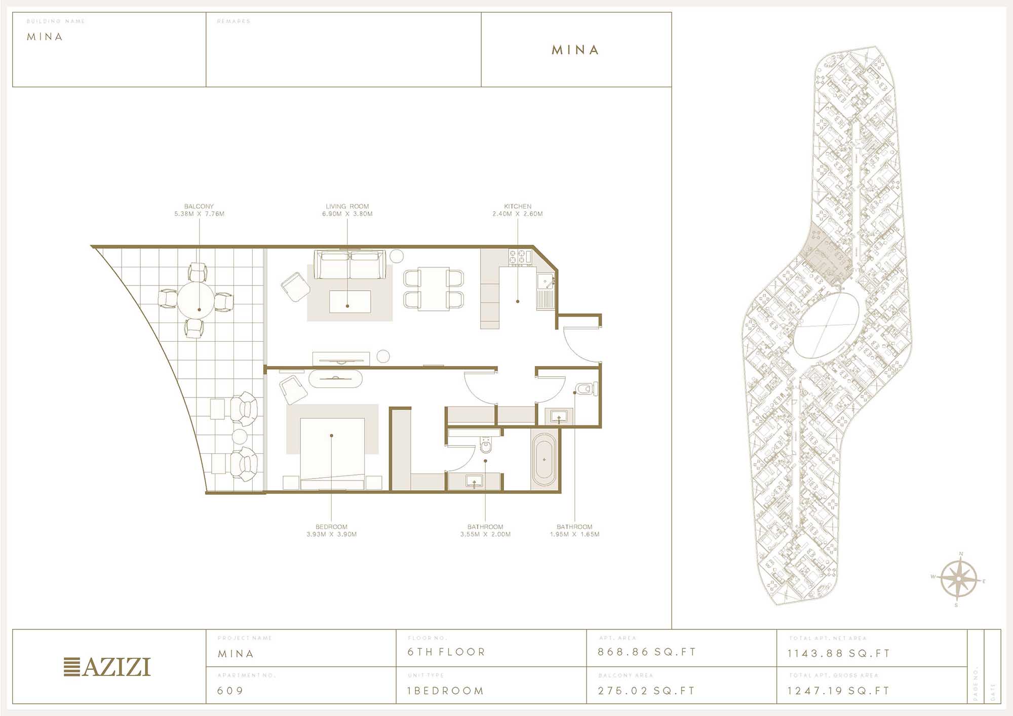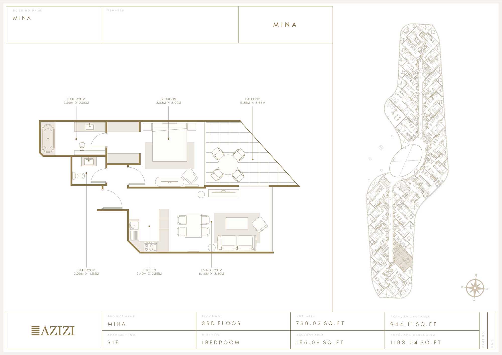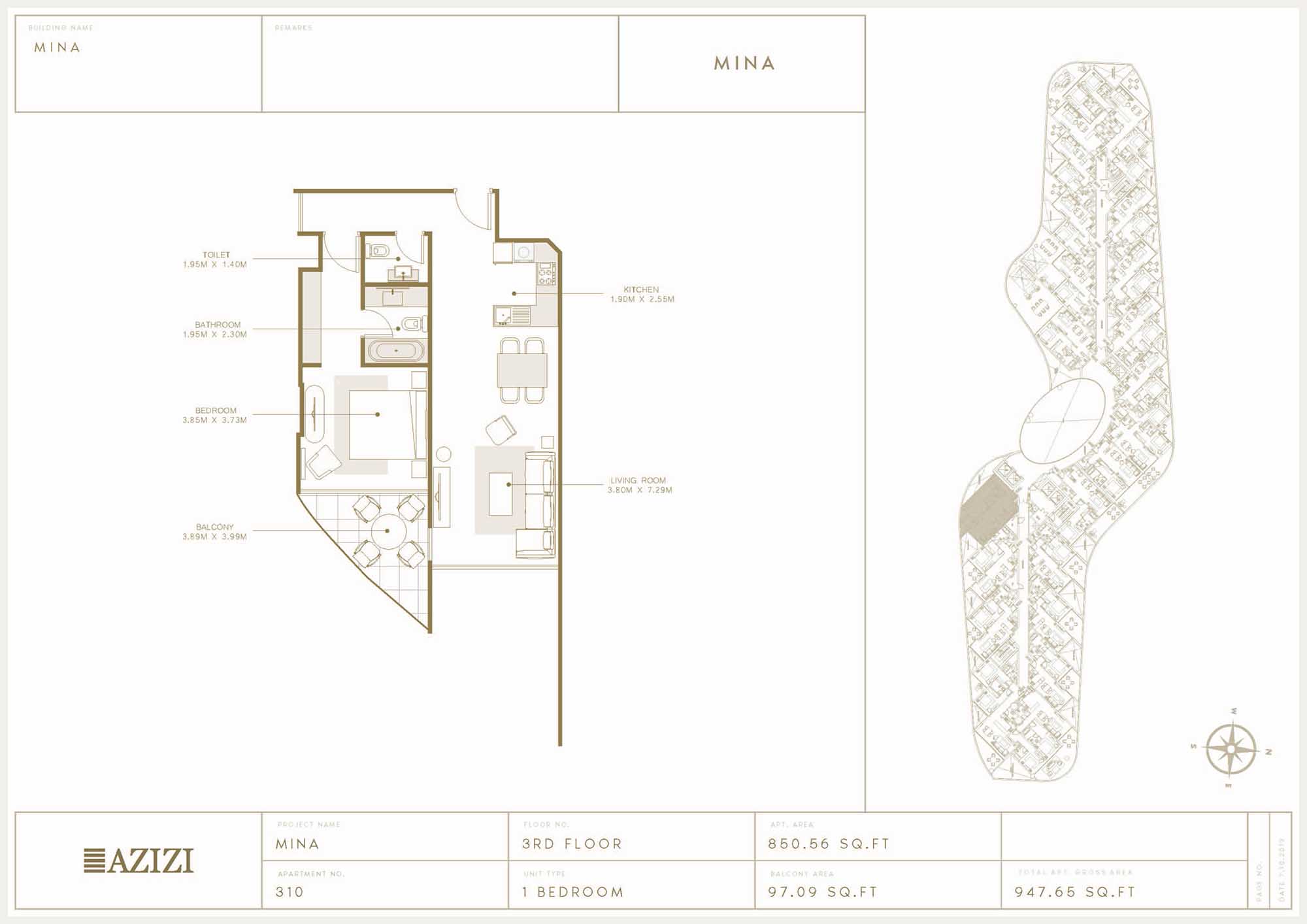 Azizi Mina provides spacious floor plan options offering waterfront designed 1 & 2-bedroom apartments and penthouses located in the serene community of the Palm Jumeirah. The development offers a total no of 178 elegant designed waterfront homes that further offers 120 one-bedroom, and 54 two-bedroom apartments along with four penthouses that are spread over an area of the total gross area of more than 2.3 hectares. While at the same time offers stunning views of the sea, deluxe amenities and interiors in a perfect backdrop of nature and style.