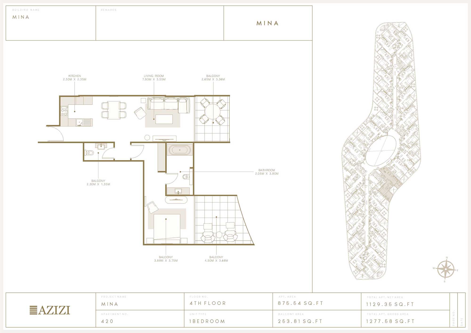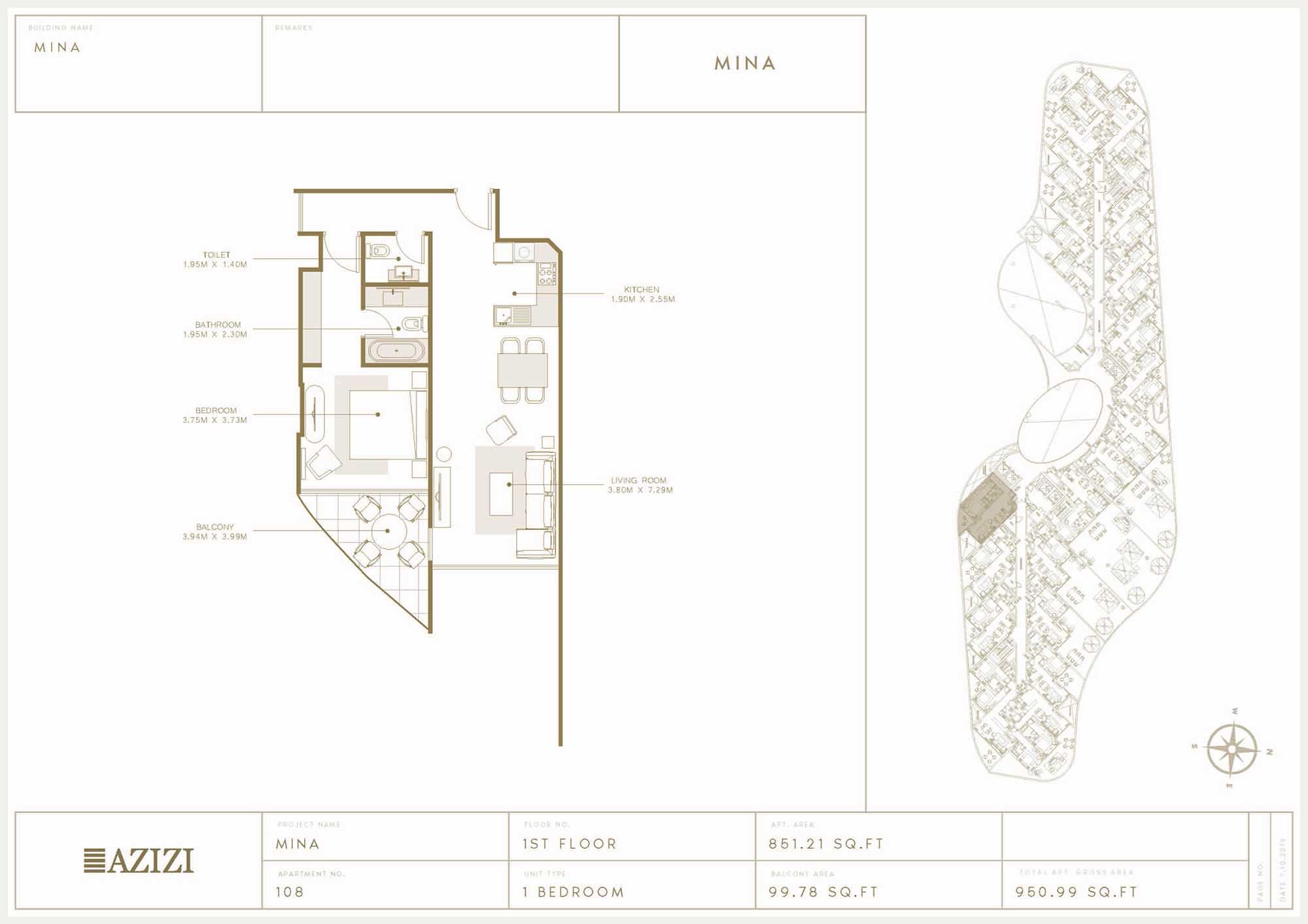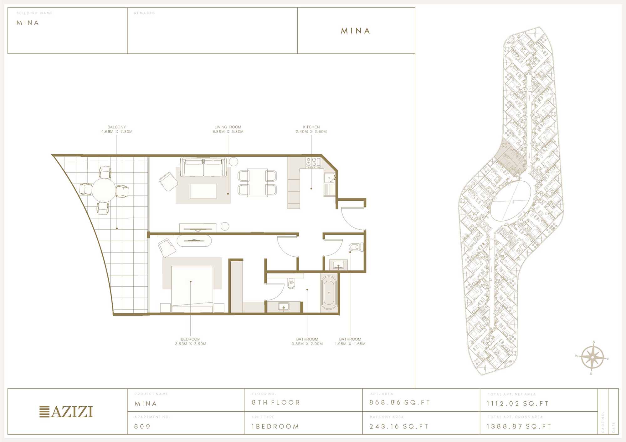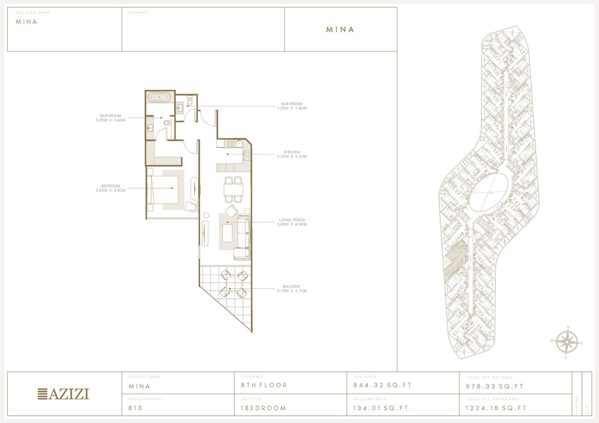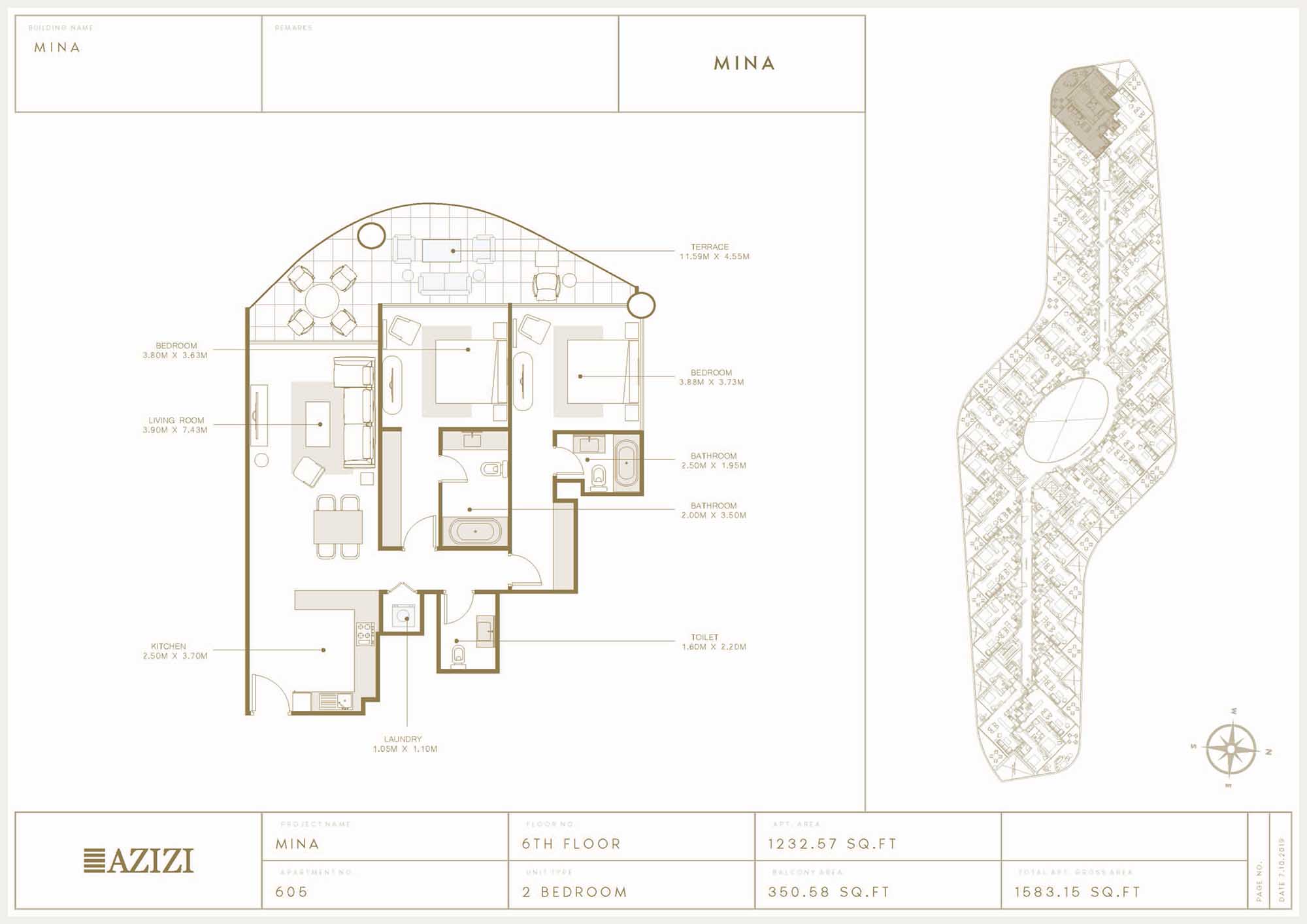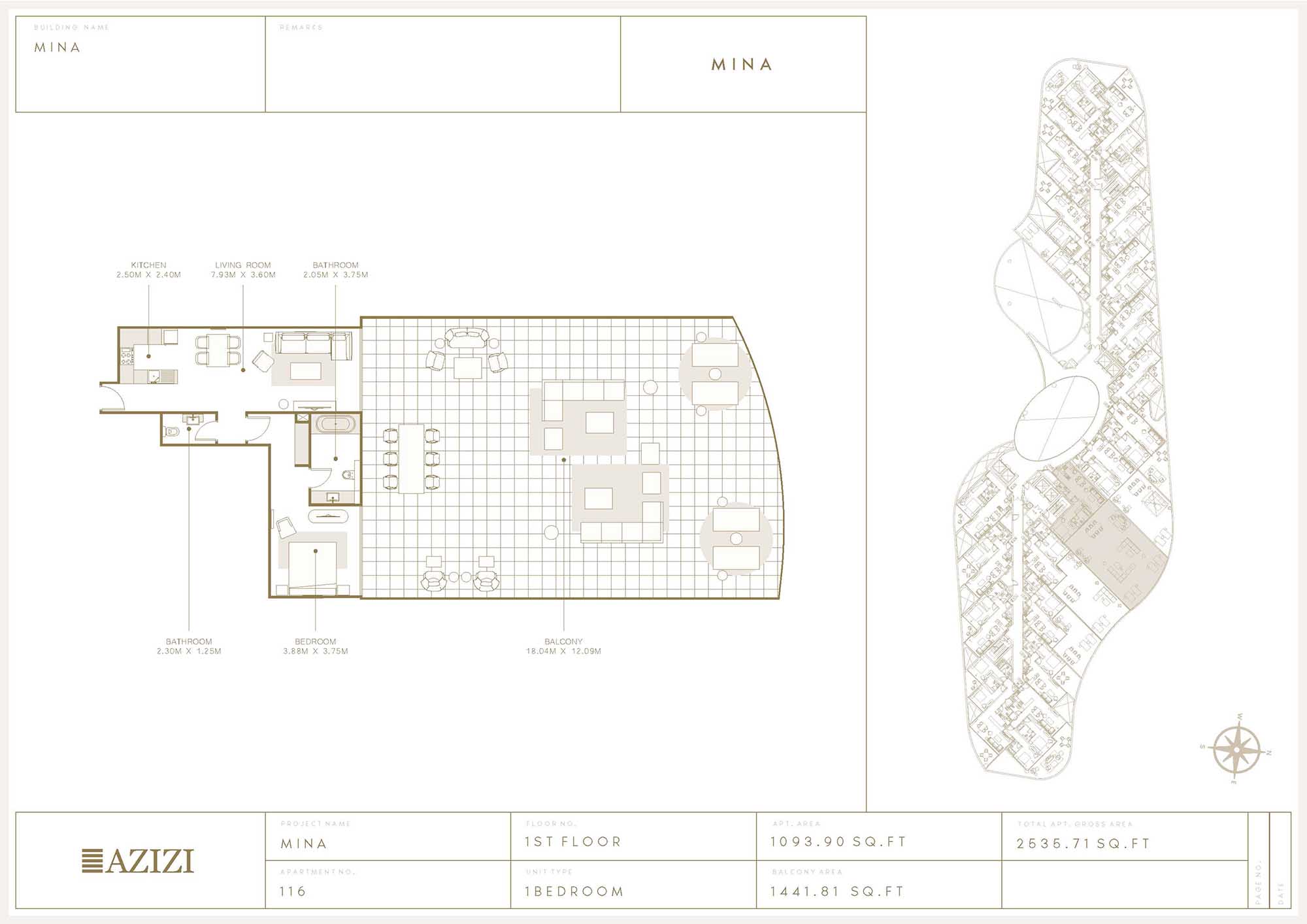 Azizi Mina provides spacious floor plan options offering waterfront designed 1 & 2-bedroom apartments and penthouses located in the serene community of the Palm Jumeirah. The development offers a total no of 178 elegant designed waterfront homes that further offers 120 one-bedroom, and 54 two-bedroom apartments along with four penthouses that are spread over an area of the total gross area of more than 2.3 hectares. While at the same time offers stunning views of the sea, deluxe amenities and interiors in a perfect backdrop of nature and style.