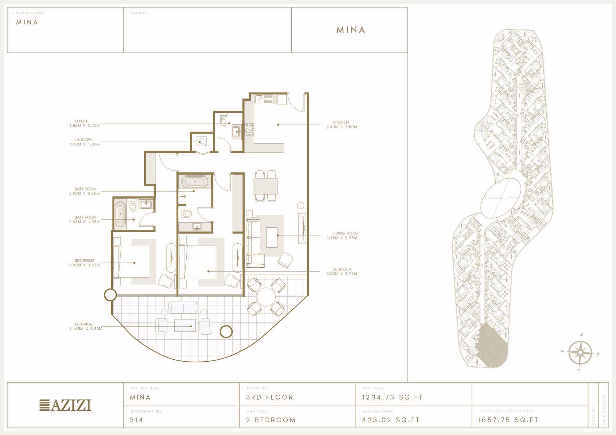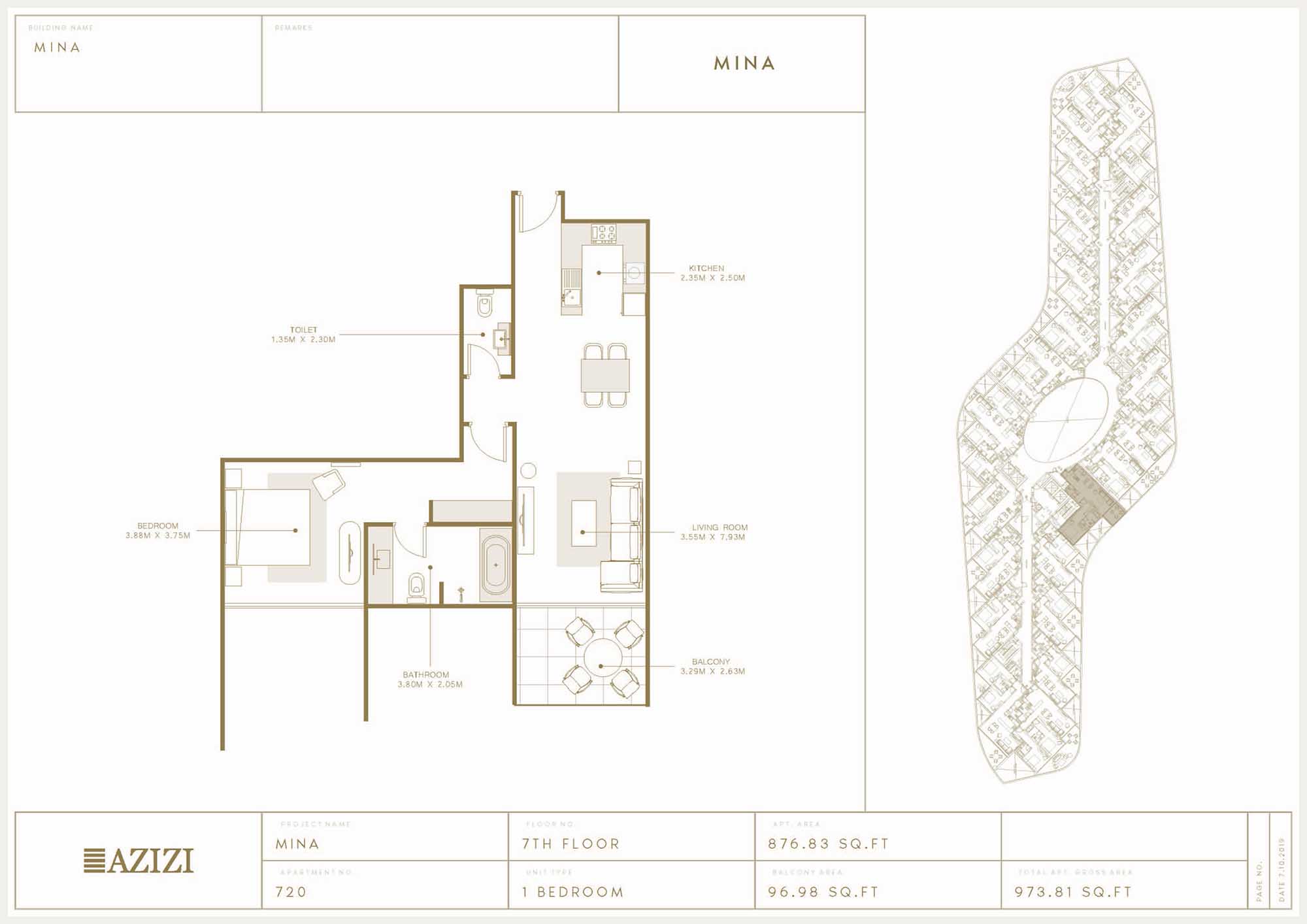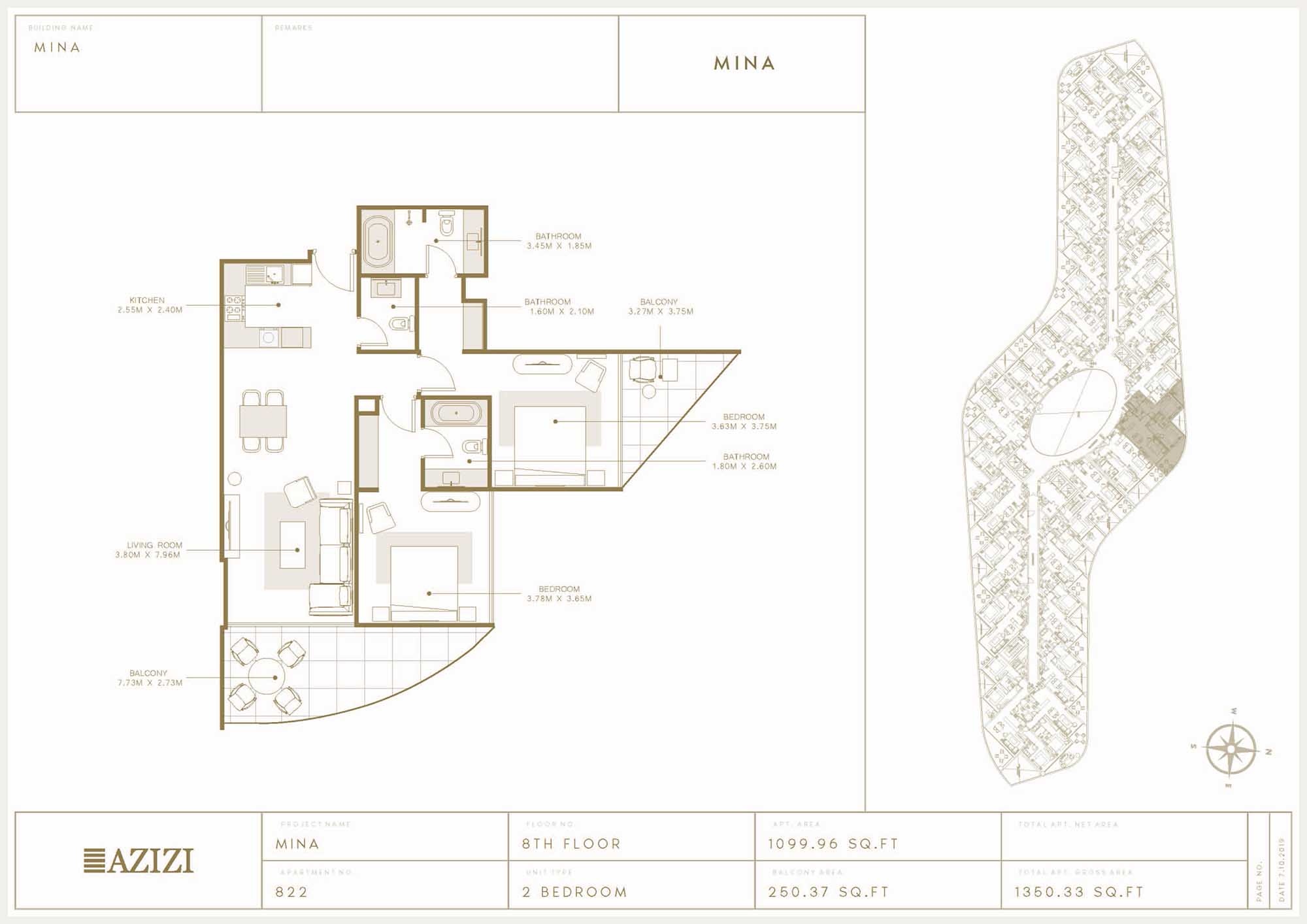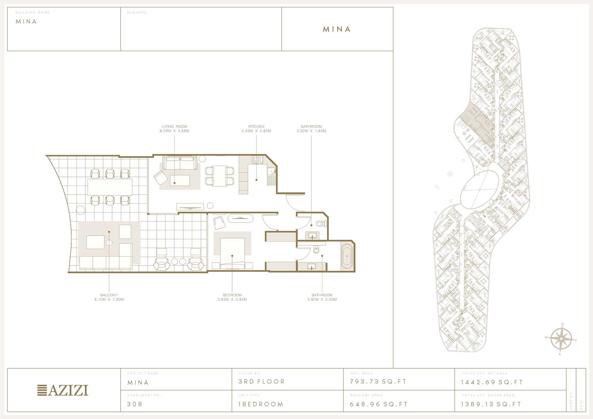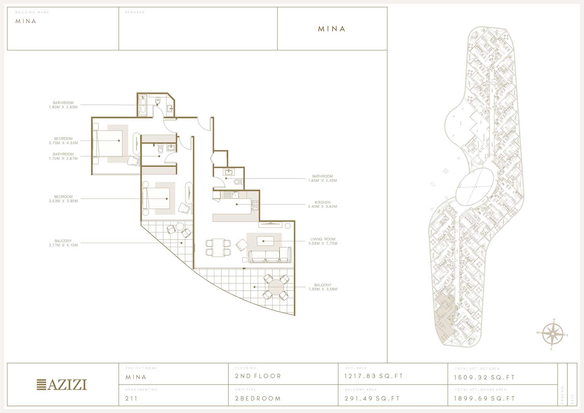 Azizi Mina provides spacious floor plan options offering waterfront designed 1 & 2-bedroom apartments and penthouses located in the serene community of the Palm Jumeirah. The development offers a total no of 178 elegant designed waterfront homes that further offers 120 one-bedroom, and 54 two-bedroom apartments along with four penthouses that are spread over an area of the total gross area of more than 2.3 hectares. While at the same time offers stunning views of the sea, deluxe amenities and interiors in a perfect backdrop of nature and style.