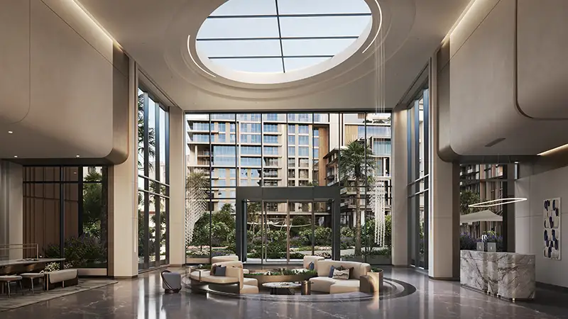 Arrival has been mindfully imagined at the drop-off area that offers a bespoke first impression to the residents and visitors. It is a sleek setting adorned by a water feature and framed by lush landscaping that sets the tone for an exquisite entrance. Leading to the double-height lobby, the entrance is enhanced by the natural light-filled, furnished and expensive seating area that is planned to offer a sense of openness in a refined and opulent setting.