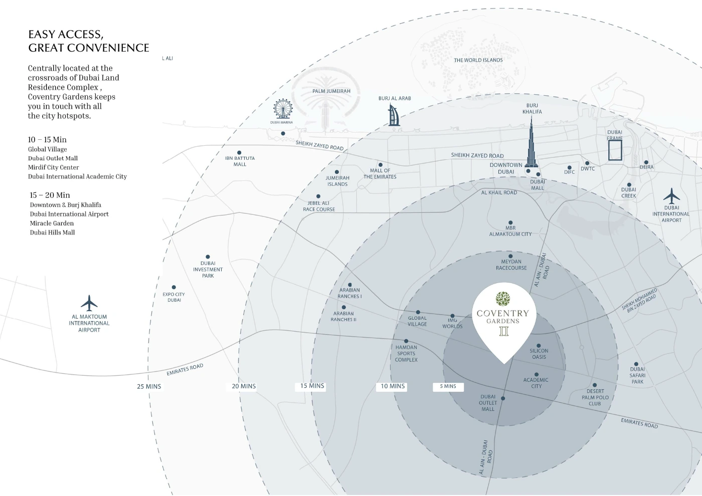 Coventry Gardens 2 by GFS Development is another phase of the refined and affordable elevated living in Dubailand (DLRC), curated with studios, 1 & 2-bedroom apartments. Placed in the vibrant and thriving heart of Dubai Land Residence Complex, this second phase of the complex offers timeless opulence in the perfect green and dazzling suburb district. Merging modern luxury with tranquil surroundings, this impressive retreat exudes contemporary elegance and comfort for future residents. Soaring with a glamorous design, this mid-rise shared sanctuary is a premium solution worth your investment with expensive interiors, stunning views, excellent connectivity, premium amenities and a mixed-use locality for balanced experiences.
