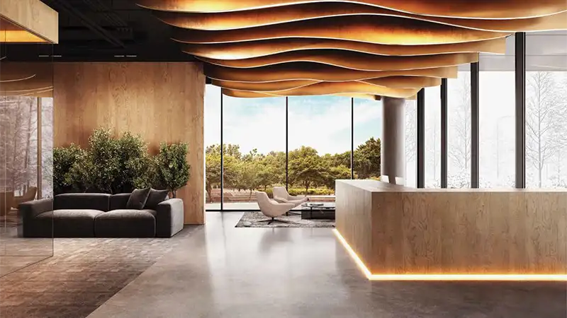 The exterior is something extraordinary about this 11-storey modern architectural gem. Defining the contemporary yet aesthetic spirit of style, the facade captures a refined look with smooth curves, soft & gleaming tones, and the major proportion of striking glass-made windows, balcony railings, and walls. Here, the entrance is extremely lavish and grand at the Grande Maison lobby, which is beautifully curated with art pieces, natural materials, soft finishes, unparalleled lighting, seating areas, and a tree as a centrepiece.