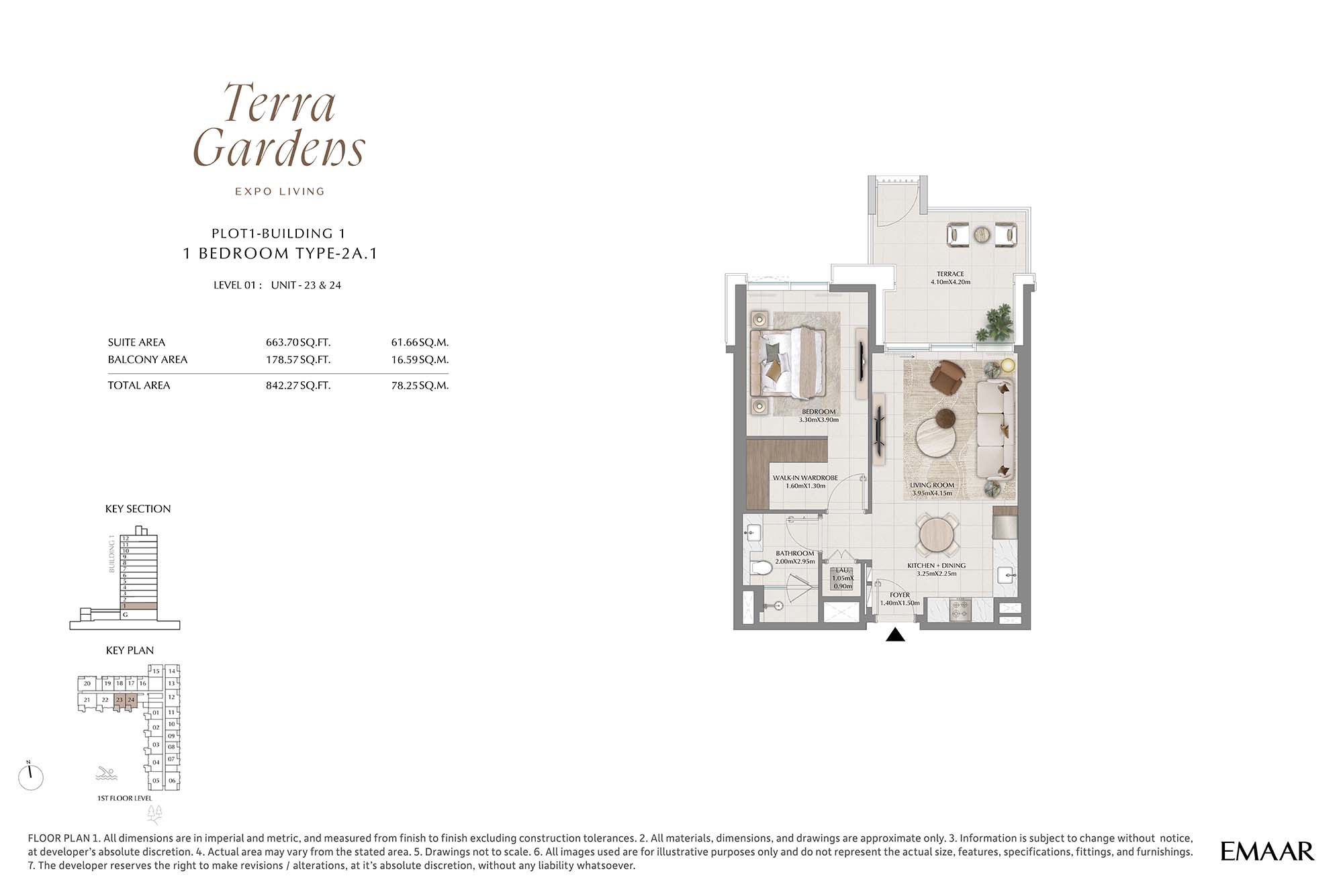 | Building 1 | 1 Bedroom | 1st Level Unit-23 & 24 (Type-2A.1) | 842.27 Sq Ft | Apartment |