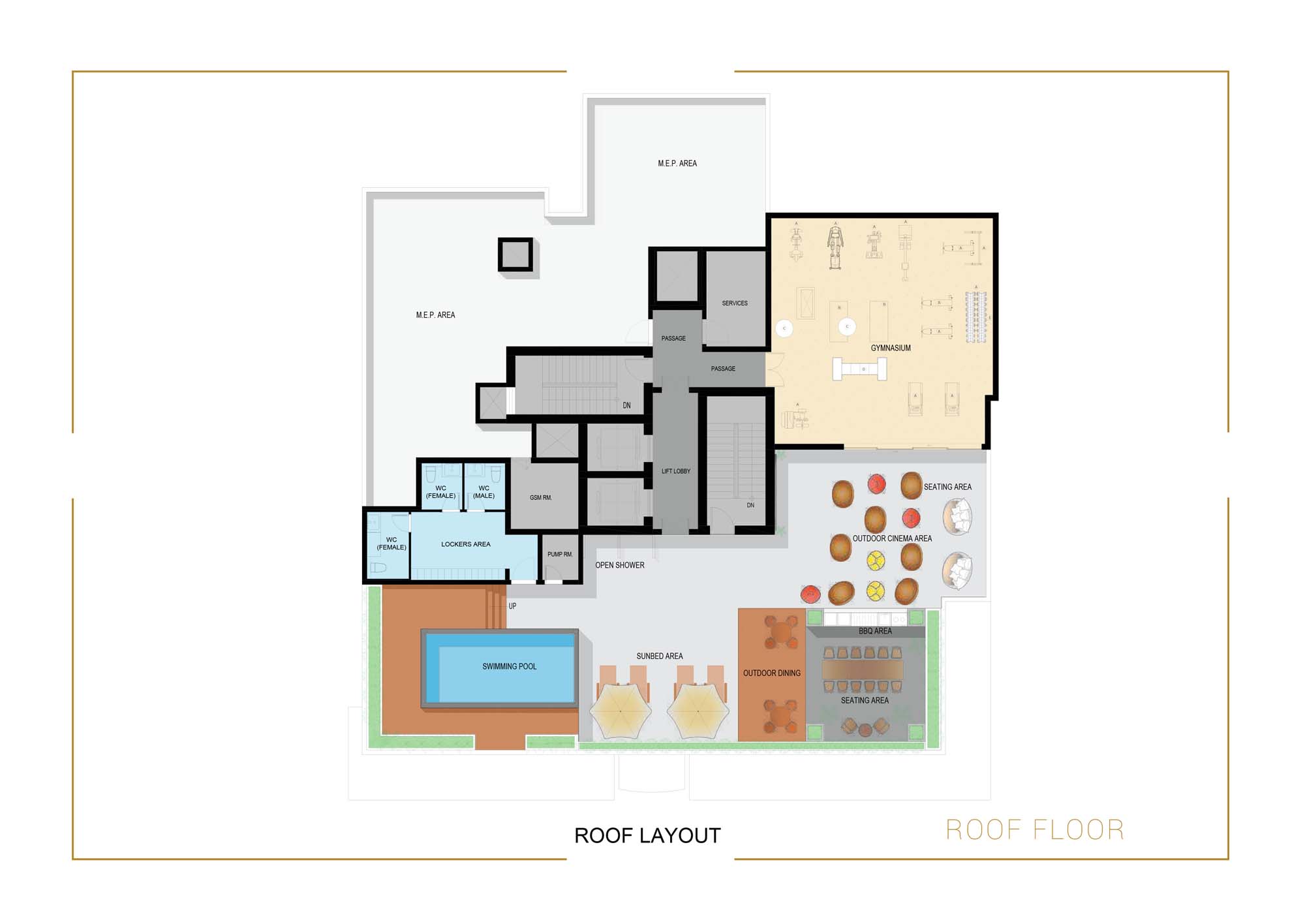 - Rooftop leisure zone with Infinity pool, Jacuzzi, landscaped sun decks, BBQ area, and open-air cinema.