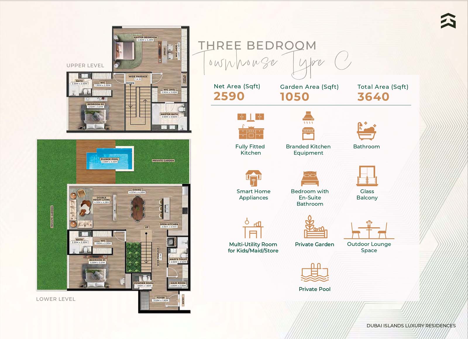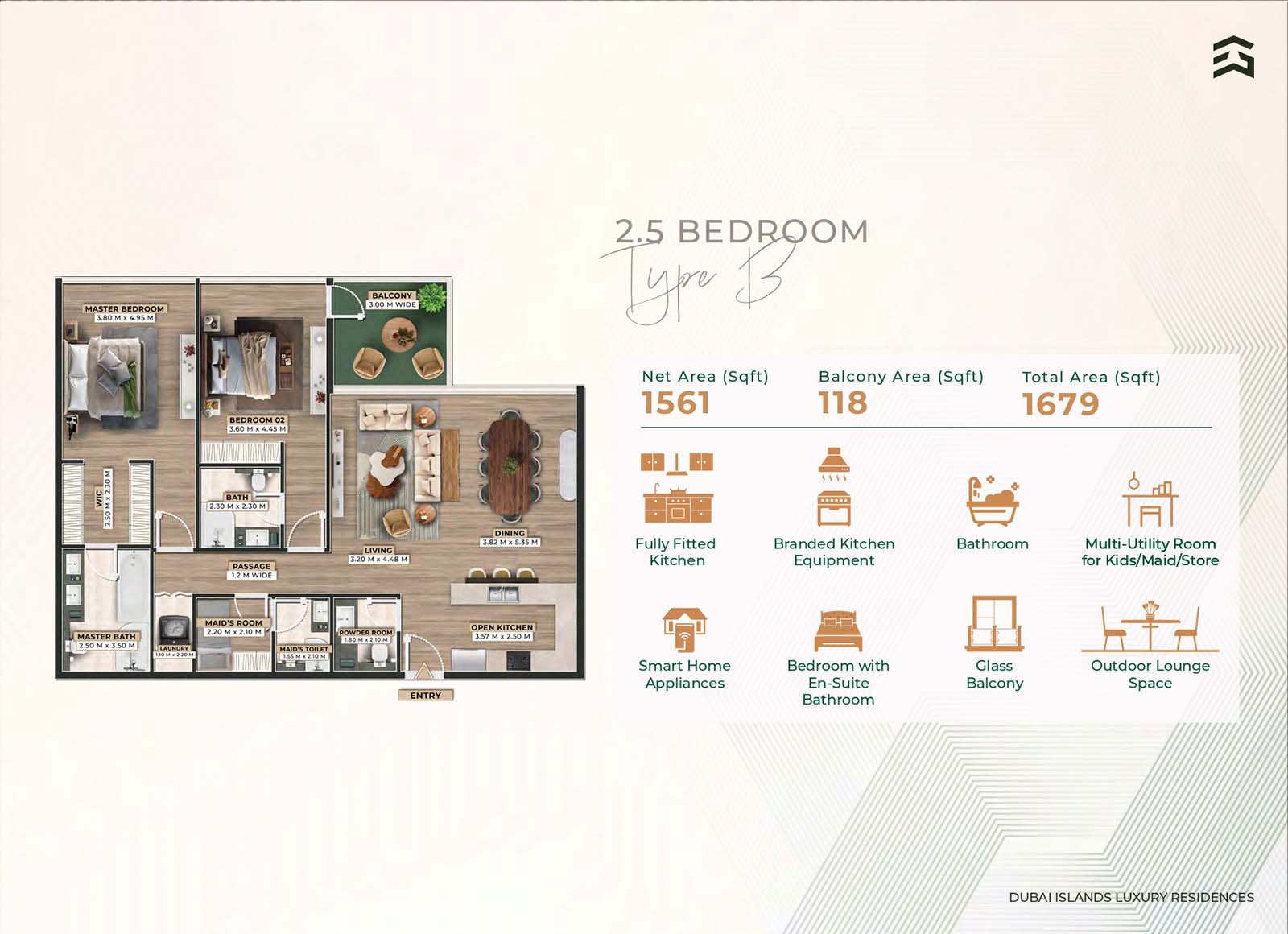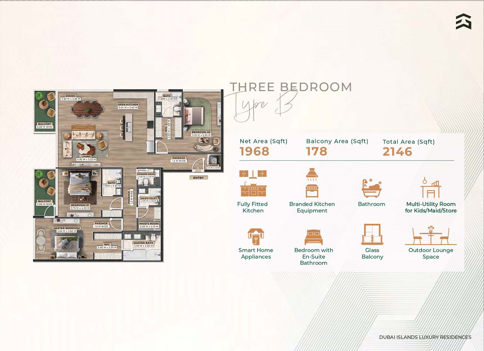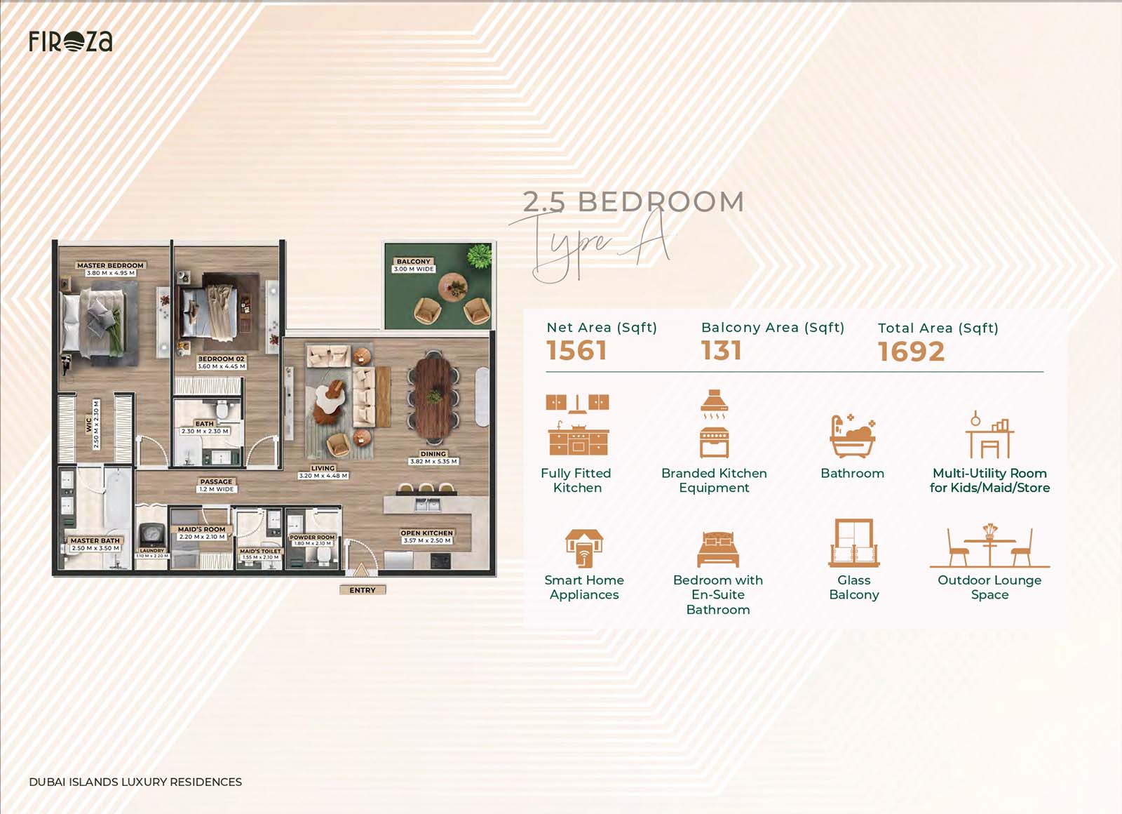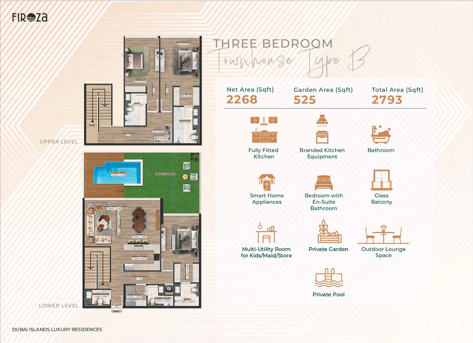 Firoza Residences is an 8-storey luxurious masterpiece with diverse floor plans for 1, 2, 2.5, and 3-bedroom apartments, duplexes, and townhouses. Among all 75 residences, each unit features the same upscale branded technology, smart features, and elements. The open and calm layouts with soft tones, fully furnished rooms, seamless design, direct access to the balcony, and huge windows offer a dynamic approach of comfort and convenience with a connection between calm indoor & naturally enriched outdoor spaces.