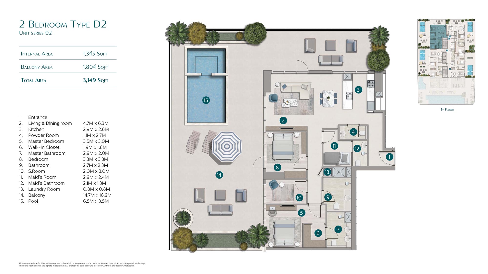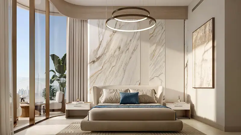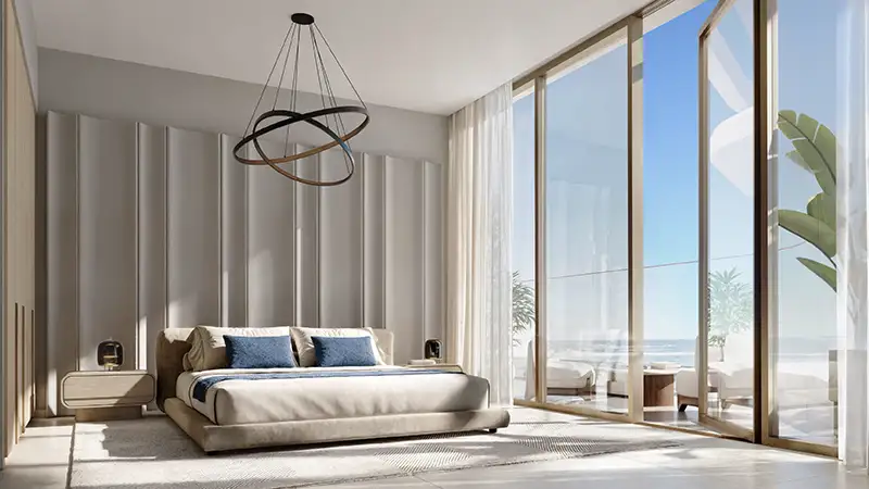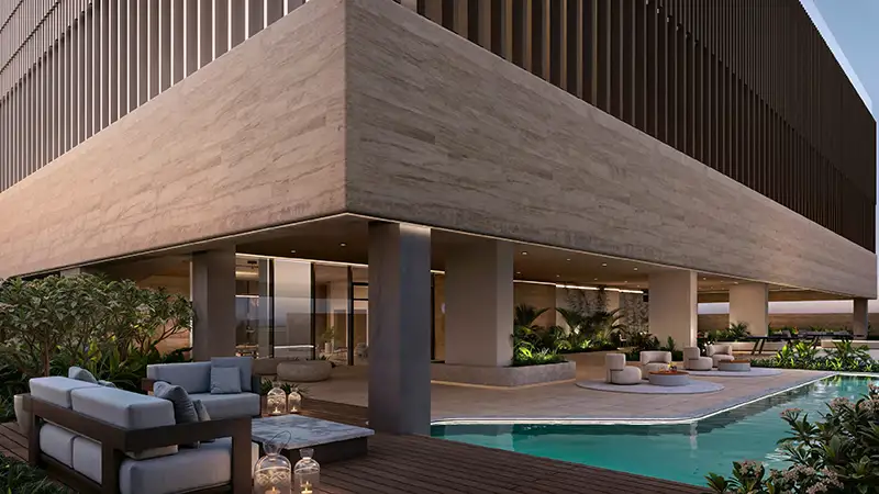 Offering beachfront residences, it is a mindfully imagined project that aims to provide a vibrant and fully-fledged environment in this world-class destination with premium amenities. The modern and expressive architecture is designed by Mimar Architecture and Engineering and draws its inspiration from the natural occurrence of Flora, which is a unique plant species of a creative structure. Configuring a ground, 2 podiums, 12 floors, and a rooftop, this exceptionally articulated jewel showcases a striking glass-made exterior with a landscaped podium with outdoor & indoor facilities, and irregularly yet well-planned extended balconies.