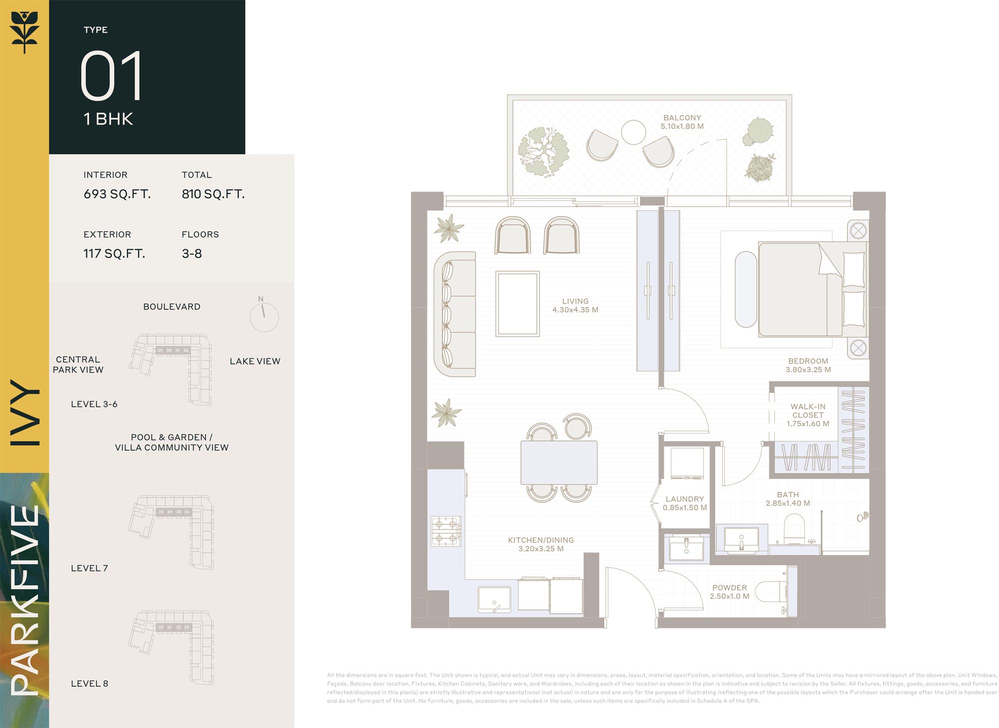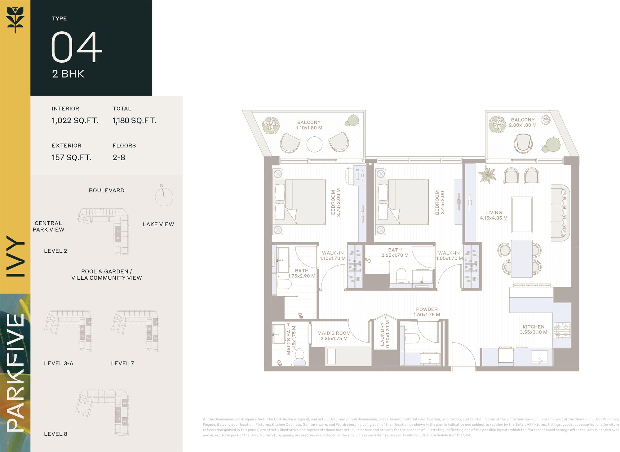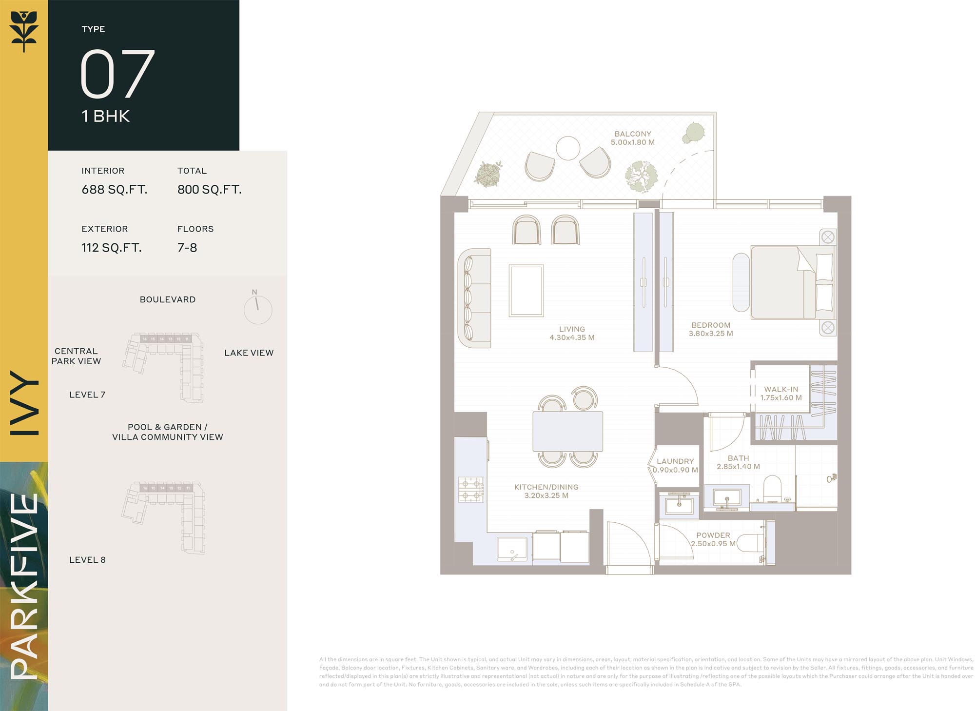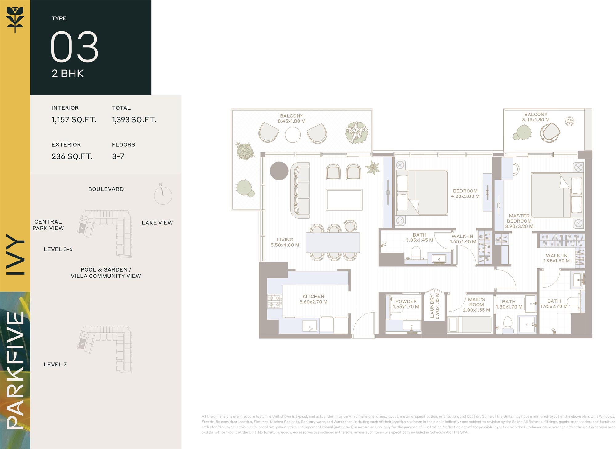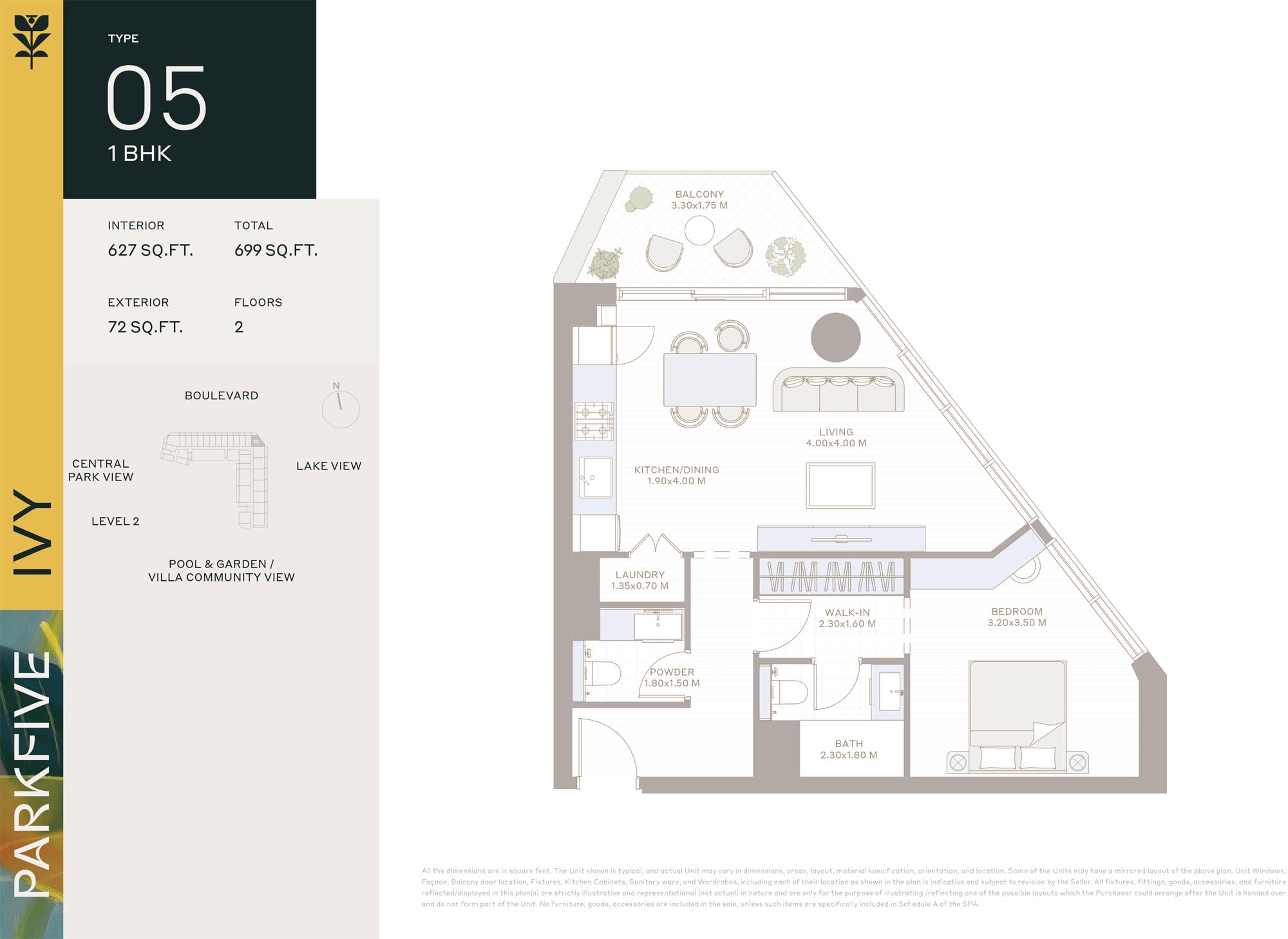 Ivy at ParkFive floor plans are created to meet the efficiency and exquisiteness with studios, 1, 2 and 3-bedroom apartments at ease. The layouts are open plan, allowing a natural flow between the living areas, dining areas, and kitchen areas. The concept of inclusion of large balconies or terraces to many units is provided, where there is personal space in the outdoors environment with a view. Kitchen and drawing rooms are superior and well-proportioned with excellent finishes. The units are oriented to the utilization of natural light, as the glazing and views are oriented toward the lakes and parks or peaceful landscaped areas wherever possible.