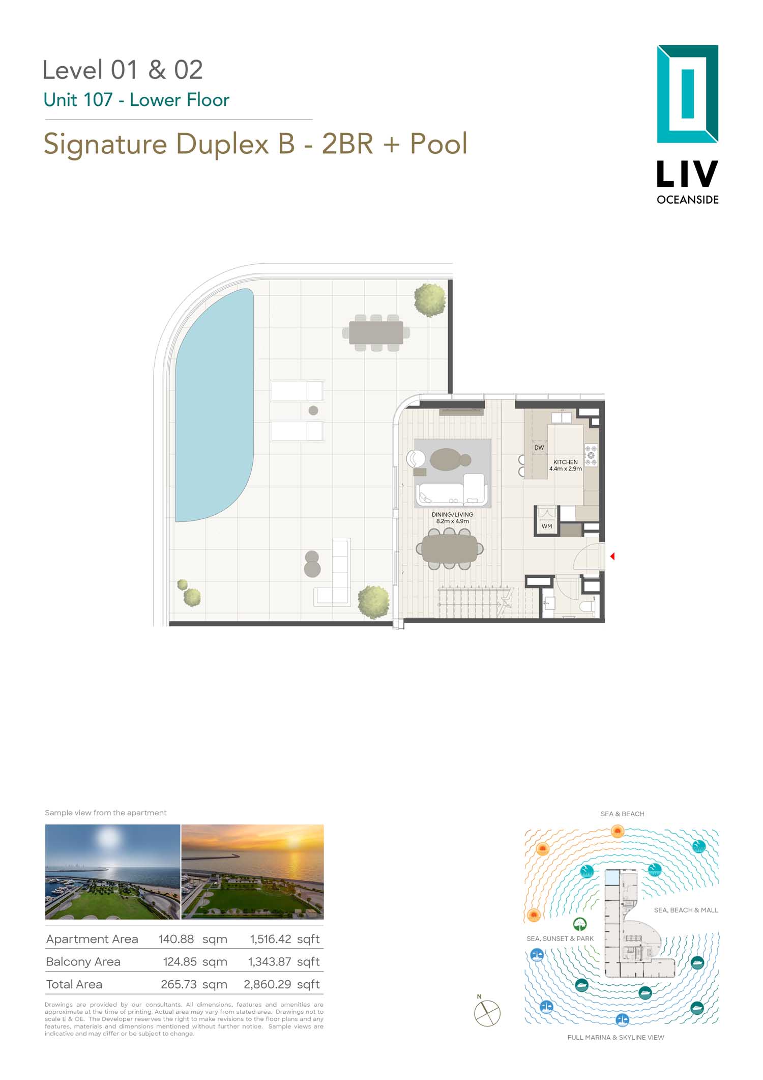 | Level 01 & 02 | 2 Bedroom + Pool | Unit 107 Lower Floor (Signature Duplex B 2BR) | 2860.29 Sq Ft | Apartment |