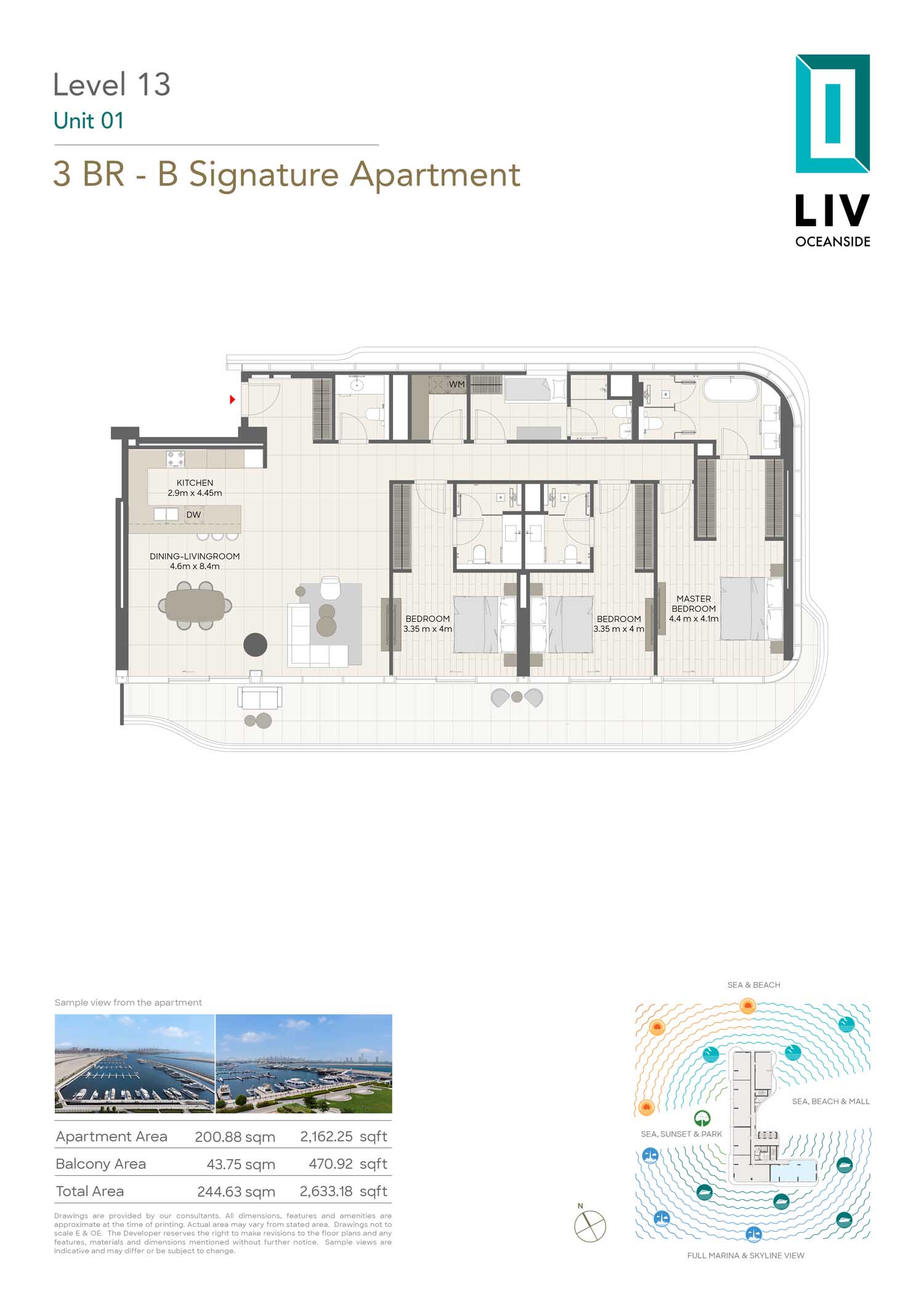 | Level 13 | 3 Bedrooms | Unit 01 (3BR B - Signature Apartment) | 2633.18 Sq Ft | Apartment |