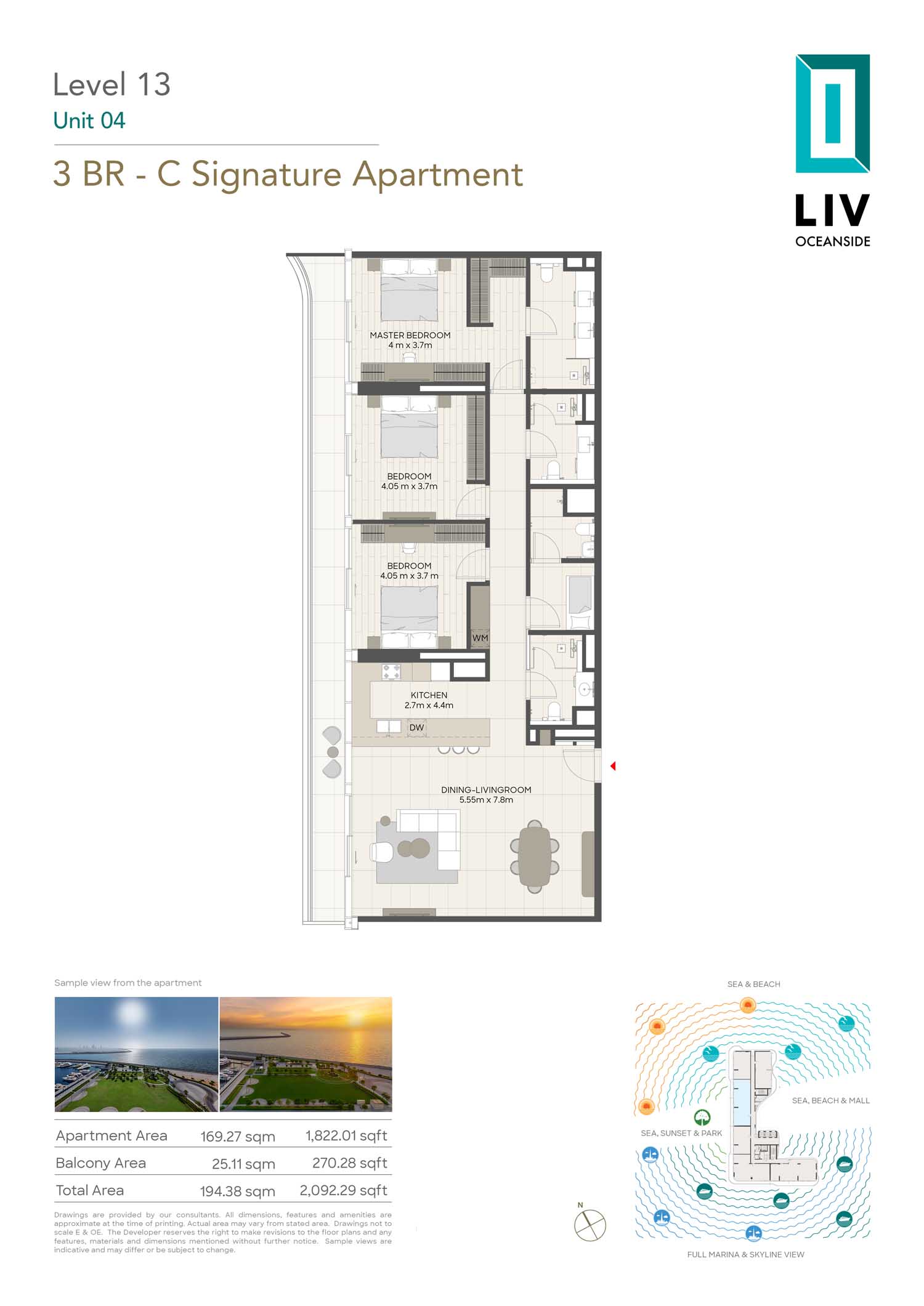 | Level 13 | 3 Bedrooms | Unit 04 (3BR C - Signature Apartment) | 2092.29 Sq Ft | Apartment |