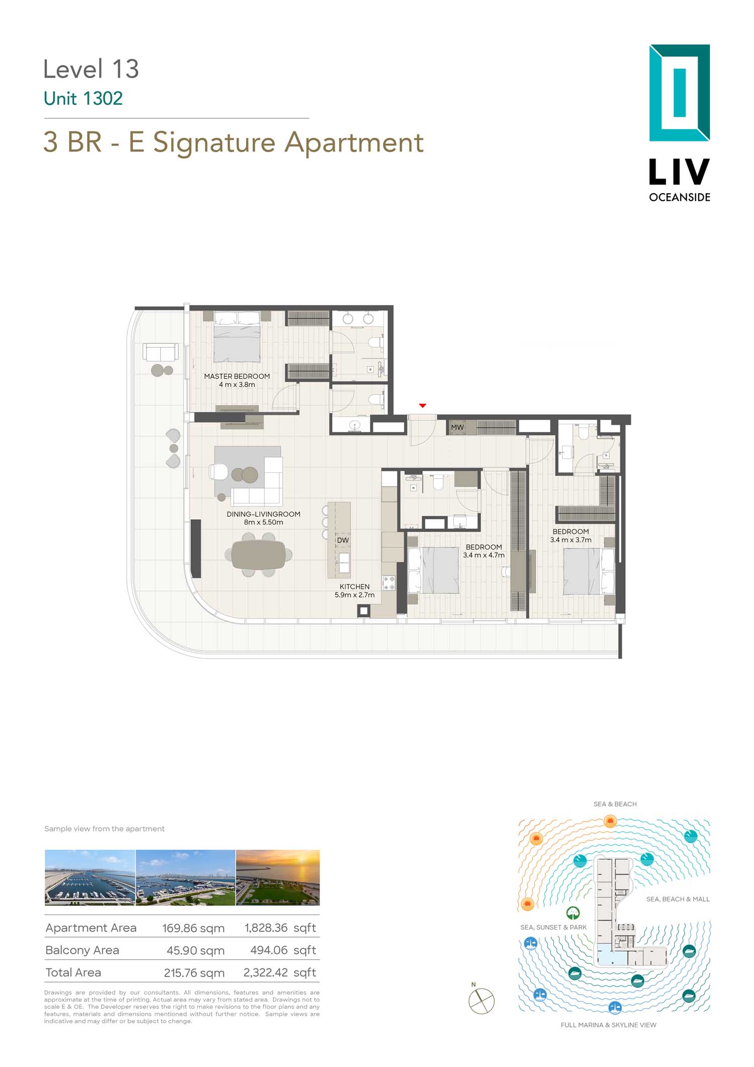 | Level 13 | 3 Bedrooms | Unit 1302 (3BR E - Signature Apartment) | 2322.42 Sq Ft | Apartment |