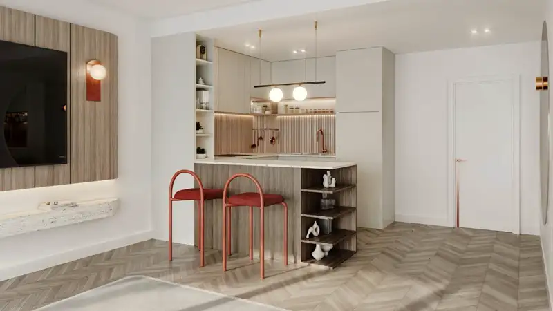 The interiors are a testament to modern design, featuring airy living rooms with custom-designed built-in cabinets, utility rooms, and fully equipped kitchens. The expansive floor-to-ceiling windows not only enhance the aesthetic appeal but also provide residents with stunning views of the surrounding cityscape. The thoughtful layout of each unit ensures a comfortable and luxurious living experience, making this an ideal choice for individuals and families seeking contemporary urban living.