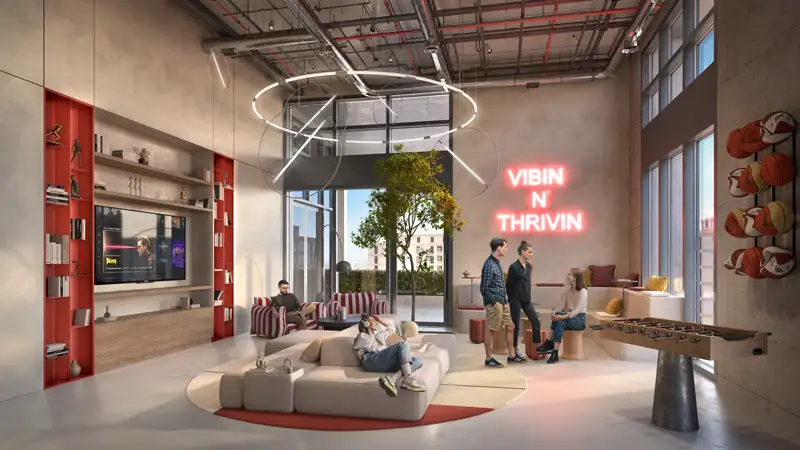 - Industrial-inspired lobby lounge sets the tone for contemporary urban living.