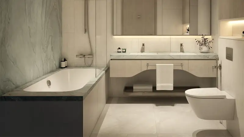 All the apartments are generously grand and lively with natural light, where open living areas are planned for both calm relaxation and entertaining moments with families. The kitchens, dining zone, and living areas are connected for seamless flow and a sense of hassle-free openness. Each bedroom features an ensuite with cosy privacy and relaxation, while a balcony provides an ideal setting to unwind and embrace the scenic views. Crowning these buildings, the four-bedroom residences exude a height of sophistication, offering spaces that are spectacular, functional, and serene. Thriving in exclusivity and refined craftsmanship, each unit features open-plan living spaces extended to the spacious terrace with uninterrupted views of the Burj Al Arab and the modern skyline.