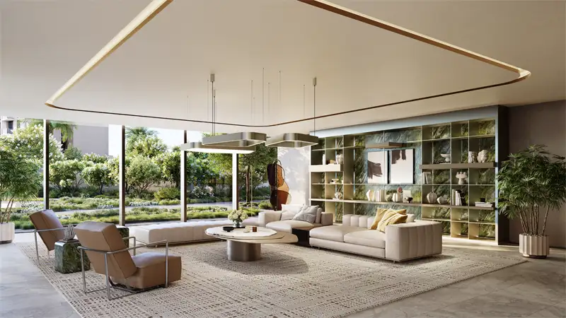 Every element at the entrance is placed ideally, including a drop-off area amidst the buildings that is enhanced by landscaped greenery and a water feature. The arrival is impressively welcoming, which is shaded by a canopy with soft and bespoke lighting. Followed by a lobby, you will experience an unforgettable arrival into the sophisticated and opulent, calm seating area. The lift lobby with high-end elevators is well-lit by daylight, entering through the expensive windows.