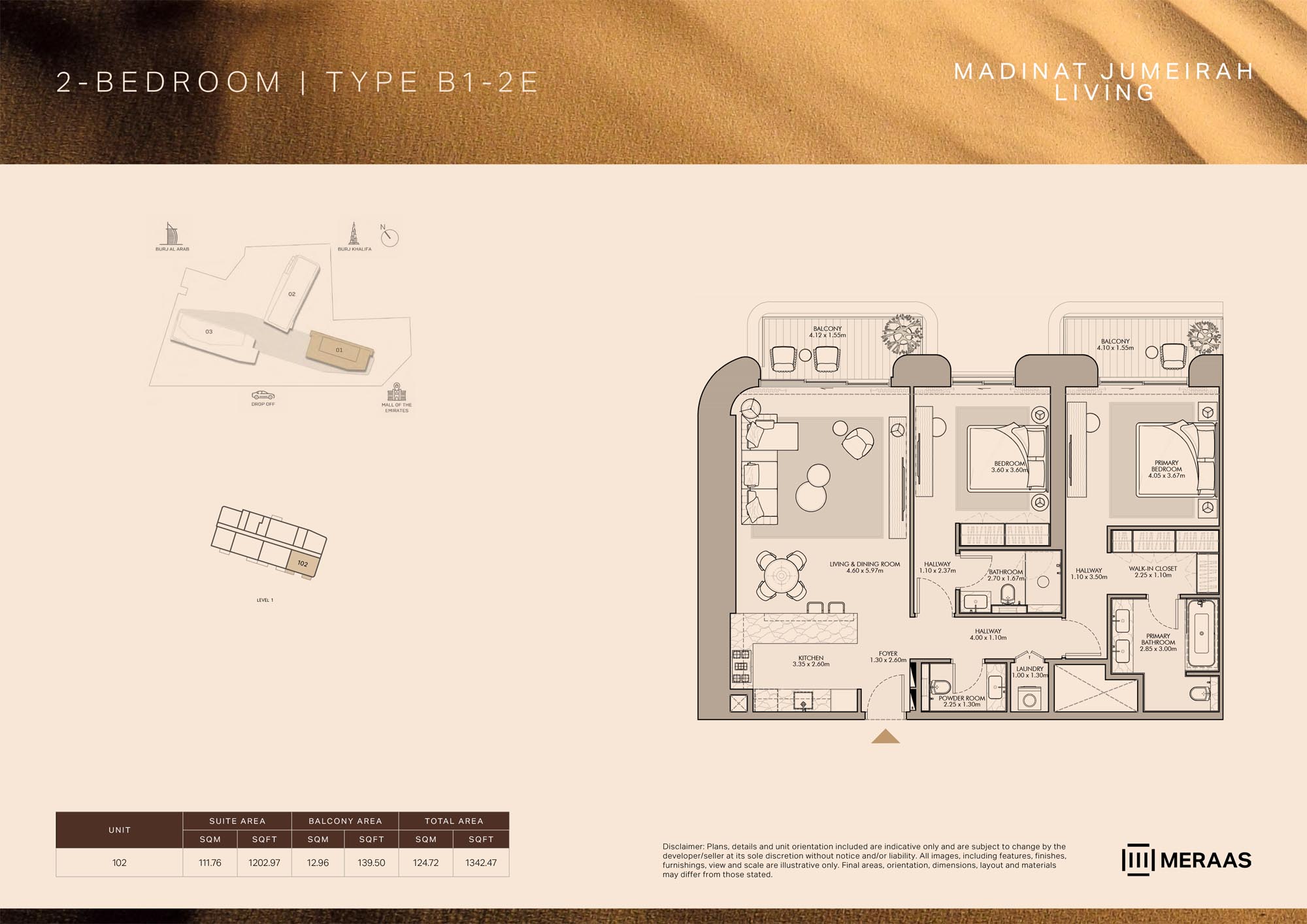 | Building - A | 2 Bedrooms | LEVEL 1 (TYPE B1 - 2E - Unit 102) | 1342.47 Sq Ft | Apartment |