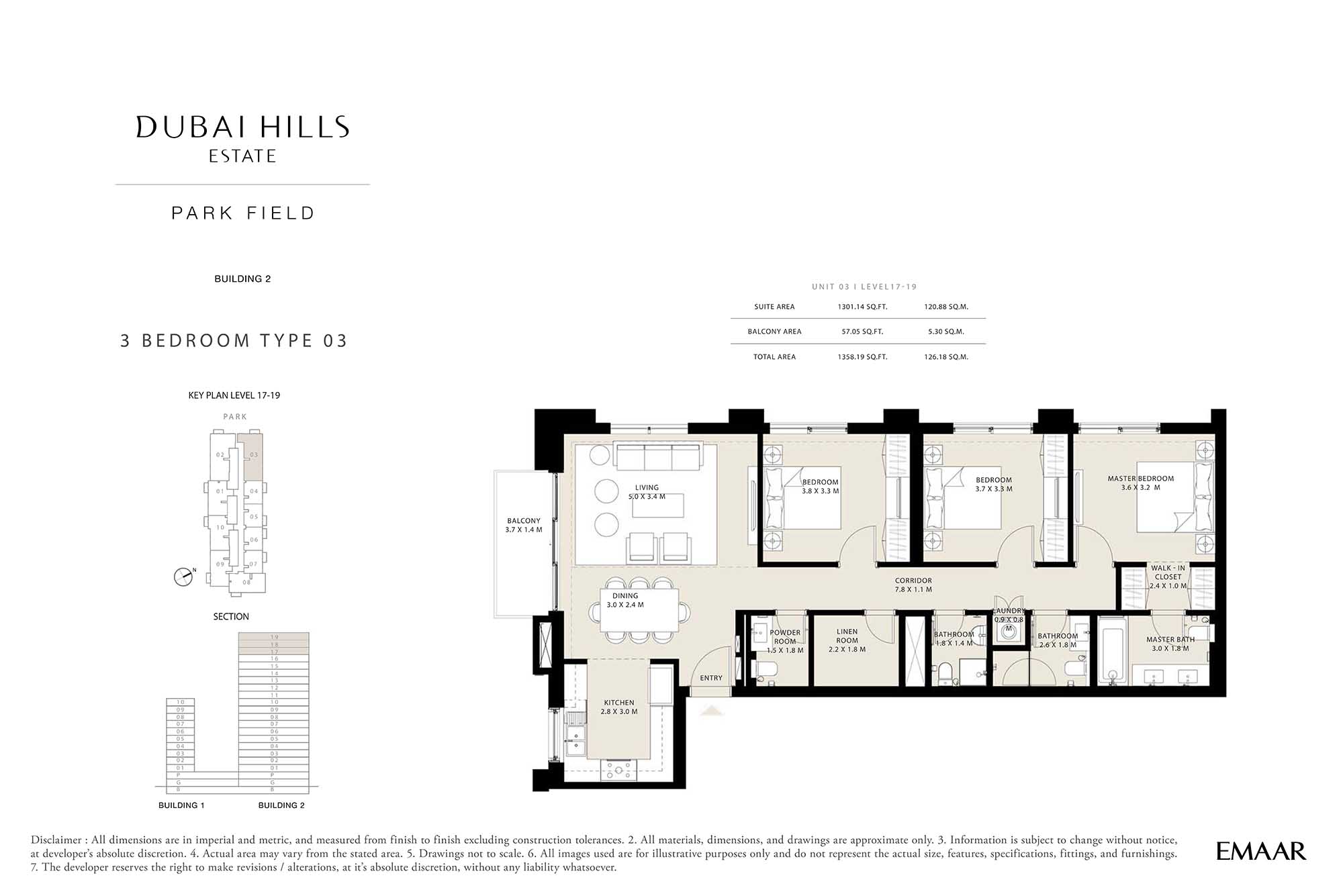 | Building 02 | 3 Bedrooms | Level 17th - 19 (Type 03 - Unit 03) | 1358.19 Sq Ft | Apartment |