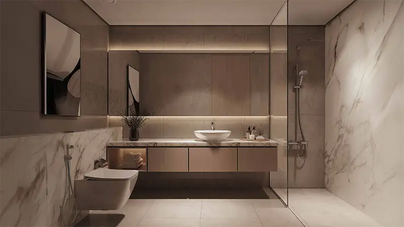 - Home interiors are spacious and curated with smart features, furnished with quality elements, soft tones, open layouts, and floor-to-ceiling windows with illuminated ambience