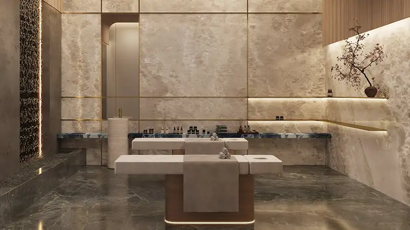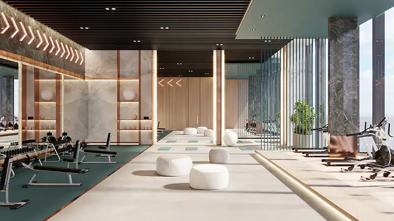The entrance exudes a sense of grandeur, and the grand lobby is graciously enhanced by sleek lines, sophisticated textures, warm tones, and bespoke lighting with a seating zone and reception desks. At the podium, there is a common swimming pool with a water lounge, kids’ splash pad, and a deck area with shaded seating where families and neighbours gather to refresh, socialise, relax, and witness the views of the sea and modern surroundings. A modern indoor and open gymnasium offers spaces that empower an ideal environment for fitness. To experience the soothing spa ambience, there are steam rooms, saunas, and tranquil settings that offer a sanctuary to restore mental and physical well-being.