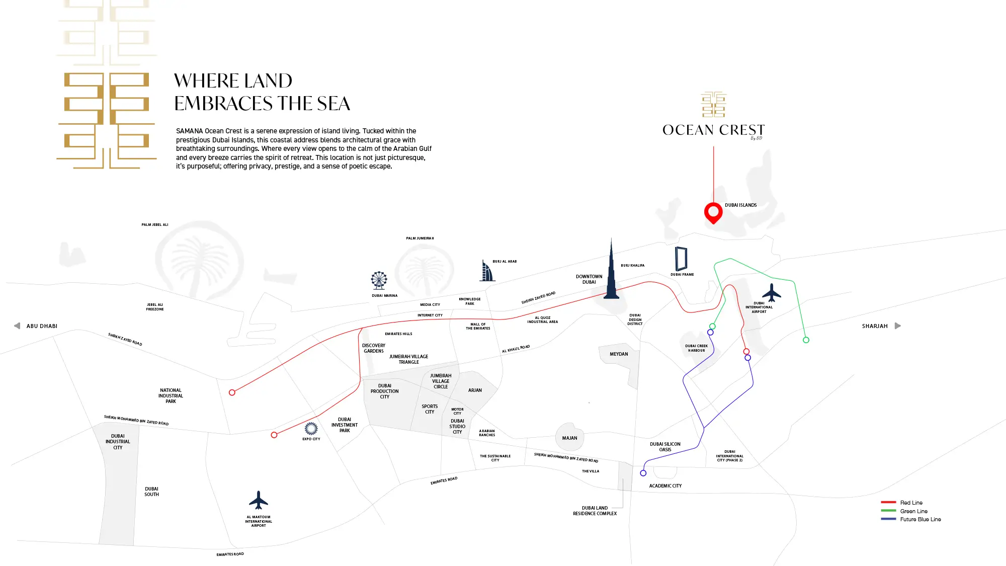 Ocean Crest by Samana Developers is a compelling residential icon on the Dubai Islands, mirroring grace and the nature of coastal life with 1 to 4-bedroom apartments. This low-rise luxury complex is defined by the calm and thriving energy of the surroundings. Here, each home is a truly rich retreat located in a prestigious waterfront locale of the island, close to the heart of the vibrant city. Your everyday starts with the rhythm of the ocean, and the sea breeze soothes the immaculate and sophisticated design that ultimately inspires the soul. From spectacular views to the curated and furnished interiors, and premium lifestyle amenities, everything is lined mindfully to elevate the daily routine of the residents.