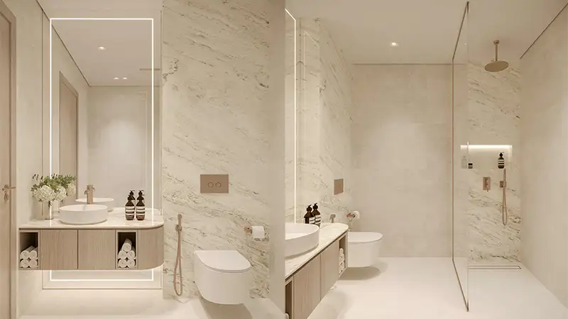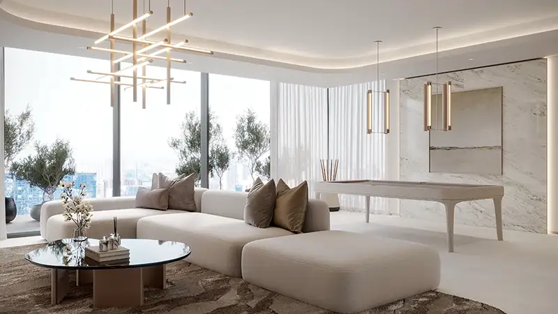 Observe an entrance that is luxuriously inviting, warm, and bespoke. Starting with a reception curated with smooth finishes, rich lighting, plantations, and striking white tones, you will be led to the furnished seating area with earthy and dark hues of materials and elements. The insides are guided by calm tones and neutral textures with soft stones, tactile fabrics, and muted woods that feel serene and sophisticated. The living spaces are refined, intricate, and simple with open-plan layouts, floor-to-ceiling windows, and grand balconies, creating a bright, sun-lit and airy environment with sweeping views of the landscaped greenery and the contemporary skyline.