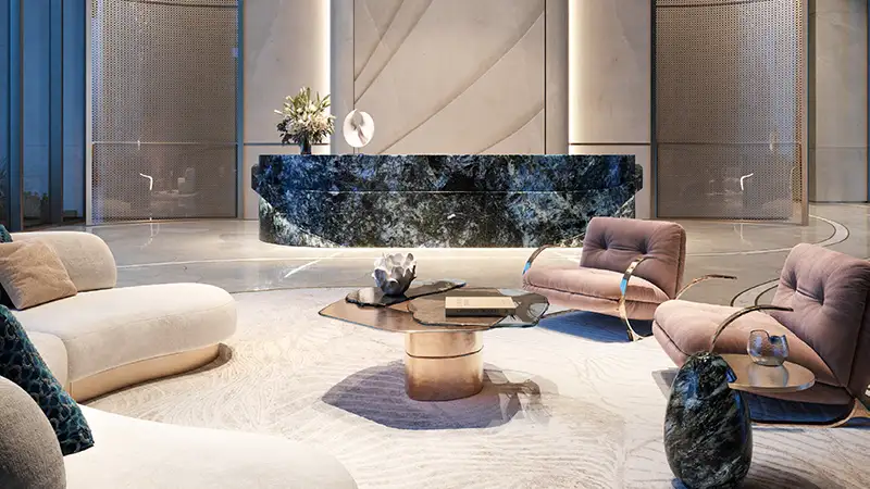 The concept of this address revolves around the unseen mystery, and the name is derived from the Greek word, which means the moon. Positioned at the shimmering tides of the ocean, this enclave draws the calm essence of the serene ocean and the bustling, fully-fledged, luxurious life into the private and common spaces. Inspired by the flow of pure and soothing moonlight, this beachfront facade transcends the regular and offers a connection between indoor & outdoor spaces where serenity and exclusivity echo. The delicate-looking exterior is defined by the planes of stones and immaculate glass walls and windows that reveal soft greenery, tranquil sea and brown sandy beach views, while maintaining an environment of comfort and privacy.