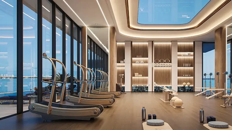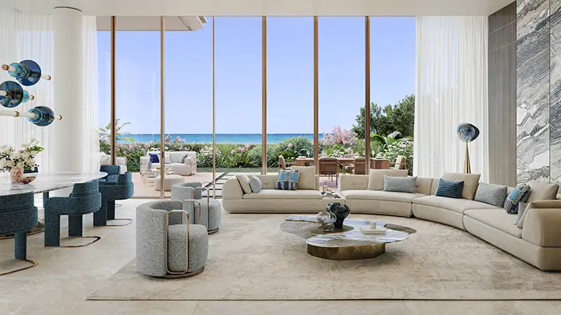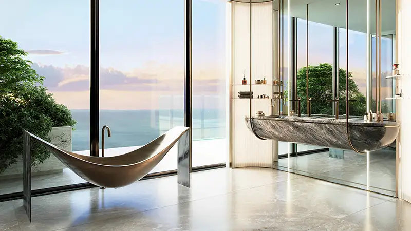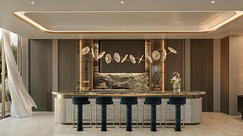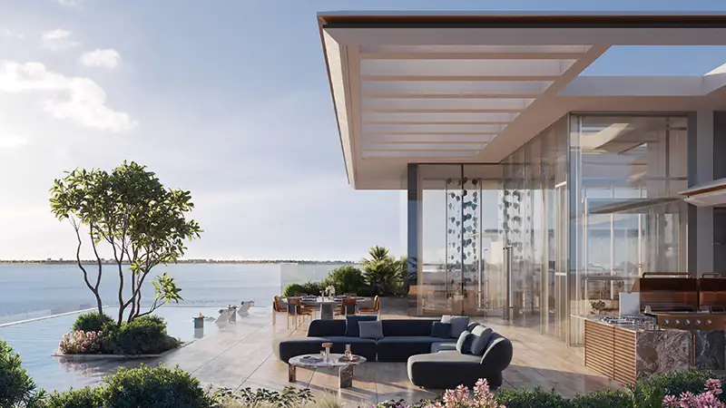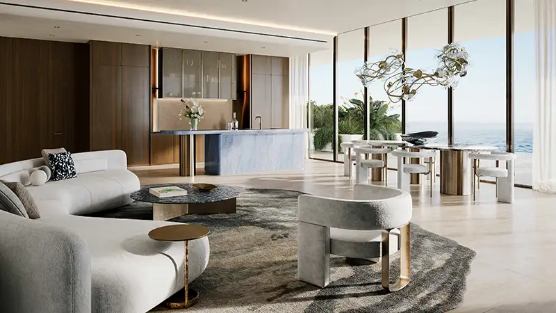 The ground levels of these three buildings offer a select range of villas that are close to the lush greenery and harmonious landscapes. The other side exposes private pools and wide terraces, overlooking the sea and the sunset skyscape. A few townhouses are crafted across multiple levels, reflecting the timeless grandeur and infinite views of the ocean through huge windows and terraces. Only a limited numbers of penthouses rises at the top with generous and grand living & dining spaces, while the sweeping terraces blur the distance between the panoramic outdoor and the lavish indoors.