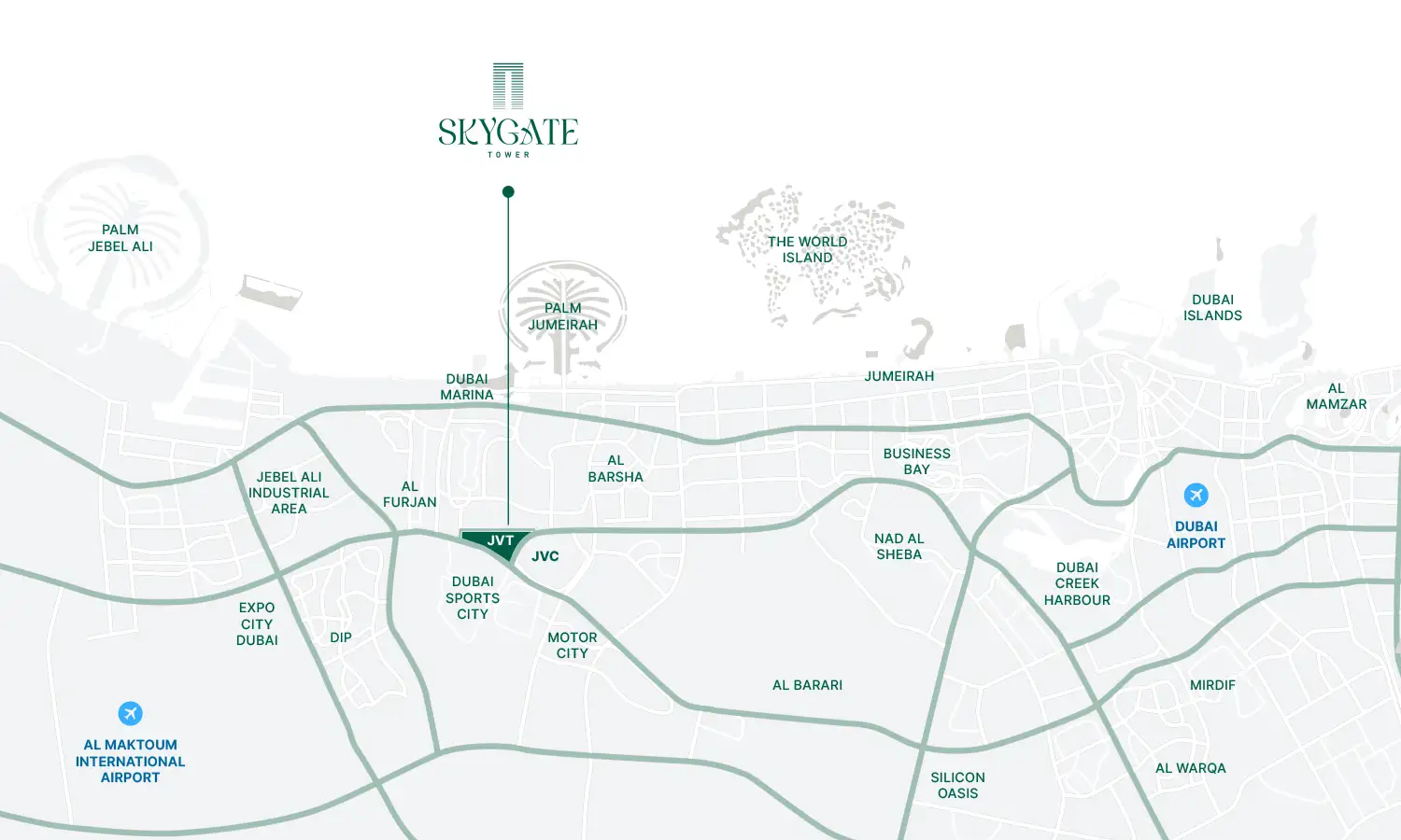 Skygate Tower at Jumeirah Village Triangle (JVT) is a prime and latest housing building located in the corridor of seamless connectivity to all popular landmarks. Lies in the District 4, this magnificent milestone is at the crossroad of Sheikh MBZ and Al Khail Road, which offers instant access to the neighbourhood districts and their attractions of JVC Mall, The Els Club Golf course, Dubai Autodrome, and the coastal site of Dubai Marina, and The Palm. However, most of the educational, healthcare, business, and tourism sites are also in proximity to this address. The international airport and metro stations are also within just a thirty-minute drive away for short and long journeys.