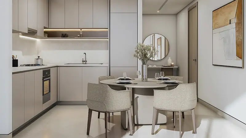 Simplifying the concept of living, the inside of homes is enhanced by the stylish, elegant, and minimalist neutral tones. Positioned tall above the landscaped setting in Bu Kadra of Meydan Horizon, the mindfully crafted flooring of each unit offers a sanctuary of distinction. The living room of each unit is openly constructed with huge windows, furnished seatings, a dining zone, and an open plan kitchen that ensure upscale culinary, eating, and quality family moments in a seamlessly interlinked, illuminated setting. The bedrooms are also generously planned with floor-to-ceiling windows with attached balconies, blurring the difference between cosy insides and the airy outside with stunning views of amenity, lagoons or the charming cityscape.