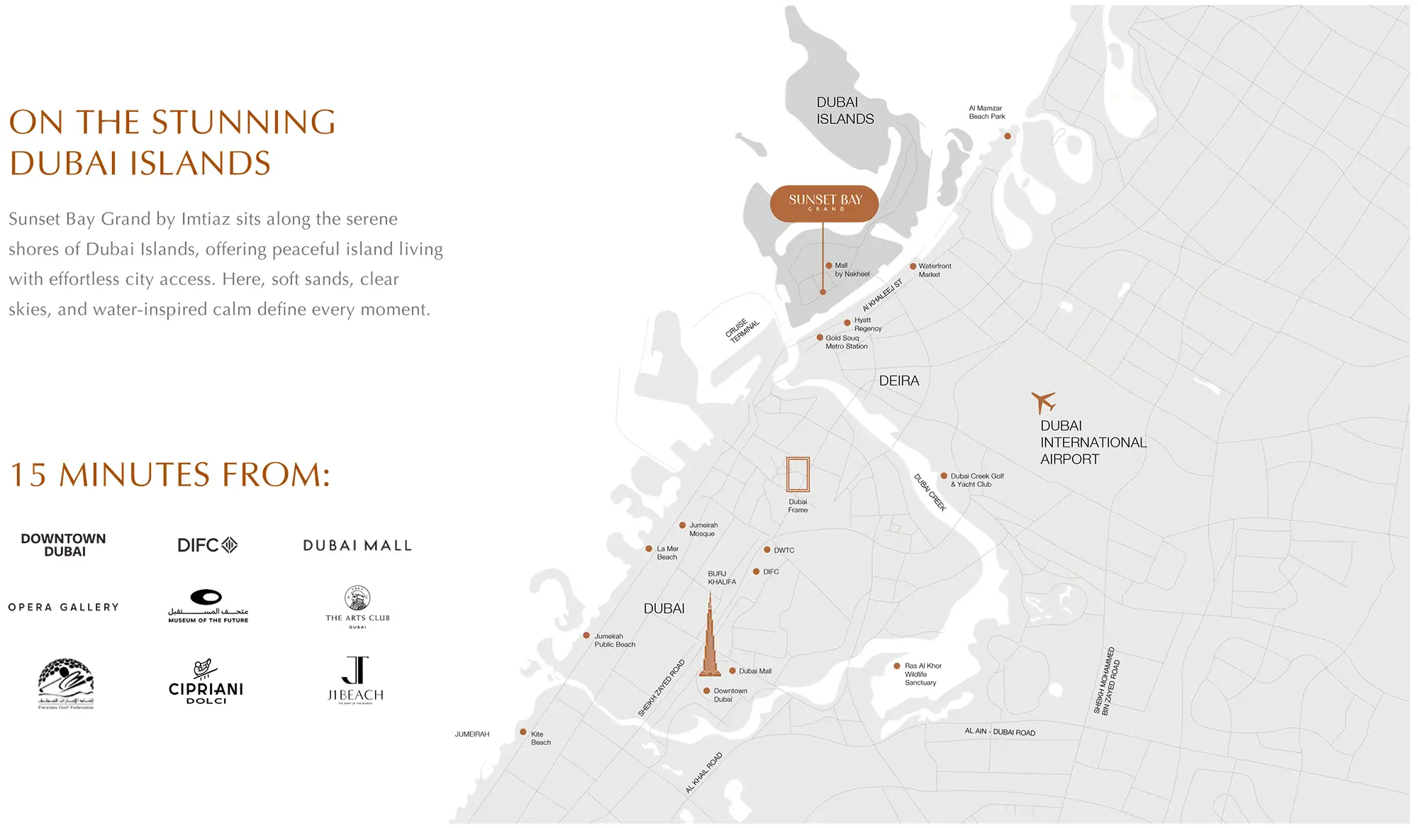 The Sunset Bay Grand presents a fusion of privacy and modernity in the excellent location of the Dubai Islands with a direct connection to the city. Explore this centric living situated in the most precious waterfront setting with panoramic views of the landscapes, sea, and the coast of the vibrant city. Residents are always close to the environmentally friendly sandy beaches, grand yacht marinas, verdant parks, jogging & cycling trails. The Infinity Bridge and motorboats & yachts are the sources to have an instant connection to the city’s major sites, such as Deira’s waterfront market, other landmarks, and the rich legacy of Old Dubai. Sheikh Zayed Road, the international airport, and metro stations are the prime offerings within fifteen minutes for having ultimate access to local and global sites.