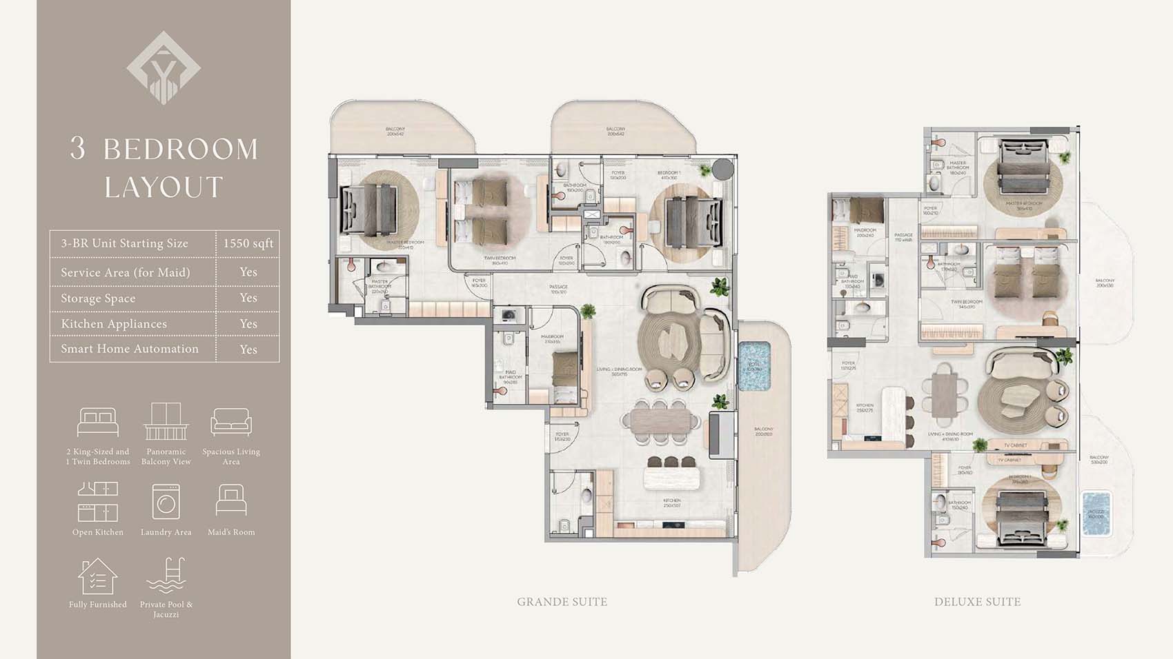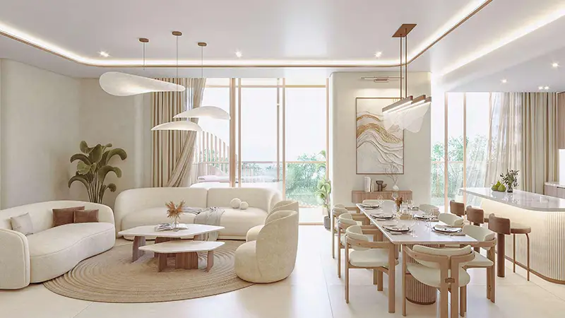 Interiors are something extraordinary with soft, pastel, and calm soothing tones of the palette. Each unit is planned with cross-ventilated layouts. Every corner speaks inviting welcome with smooth finishes on flooring, walls, and ceilings, where the living room is grand with a furnished area, a dining setup and an open modern kitchen that offers an ideal setting for family gatherings, comfortable moments, and hassle-free fluency. The large balconies accessible via large window panels in each unit and bedrooms with huge windows, connecting the serene nature with sophisticated personal spaces.
