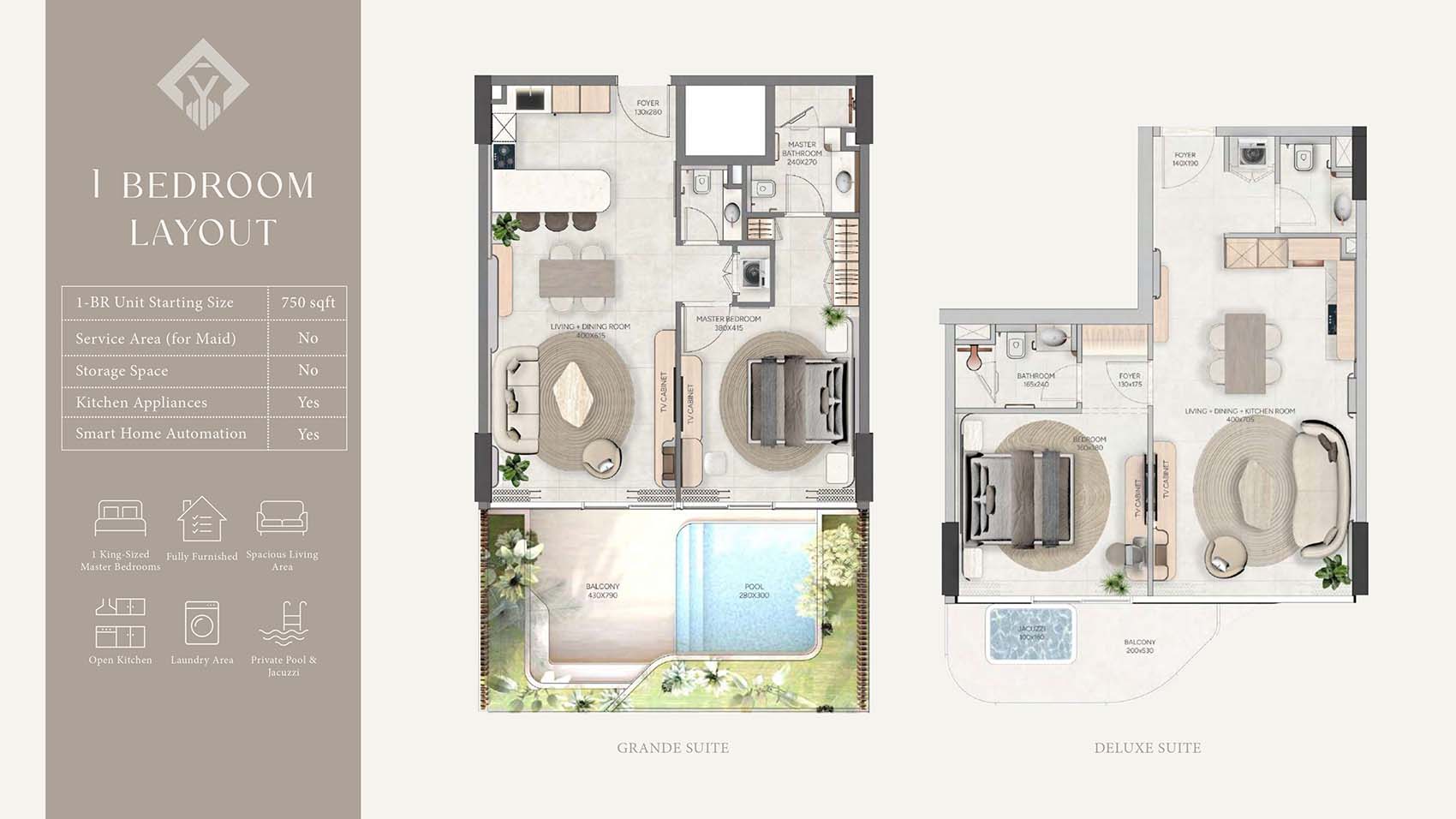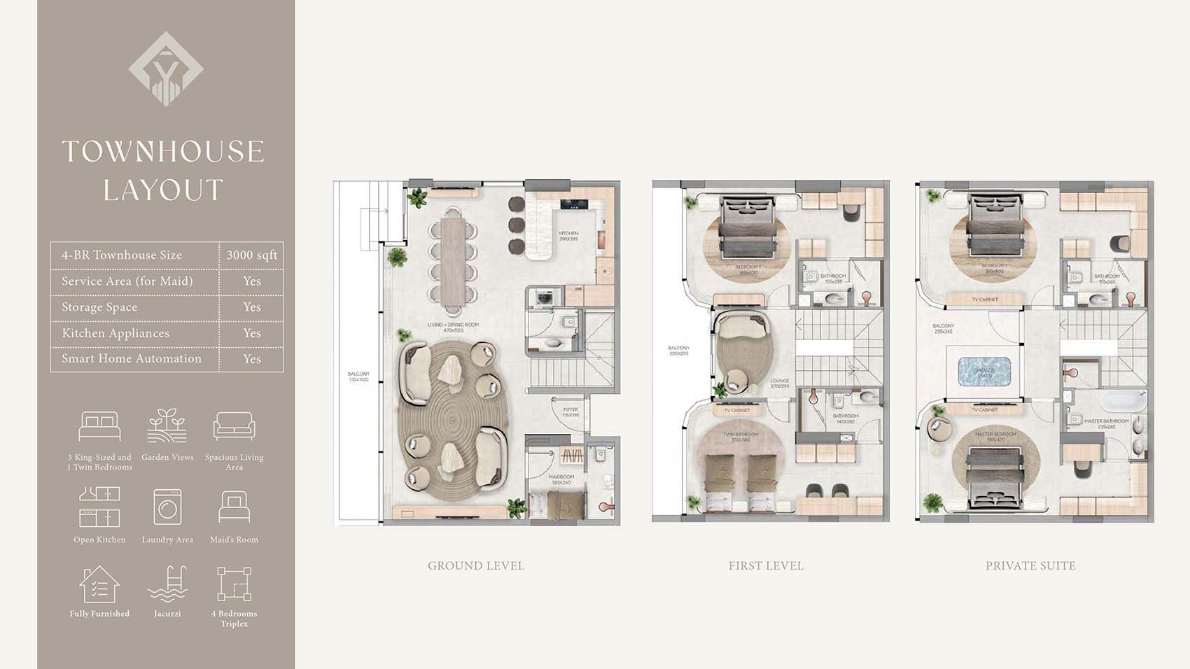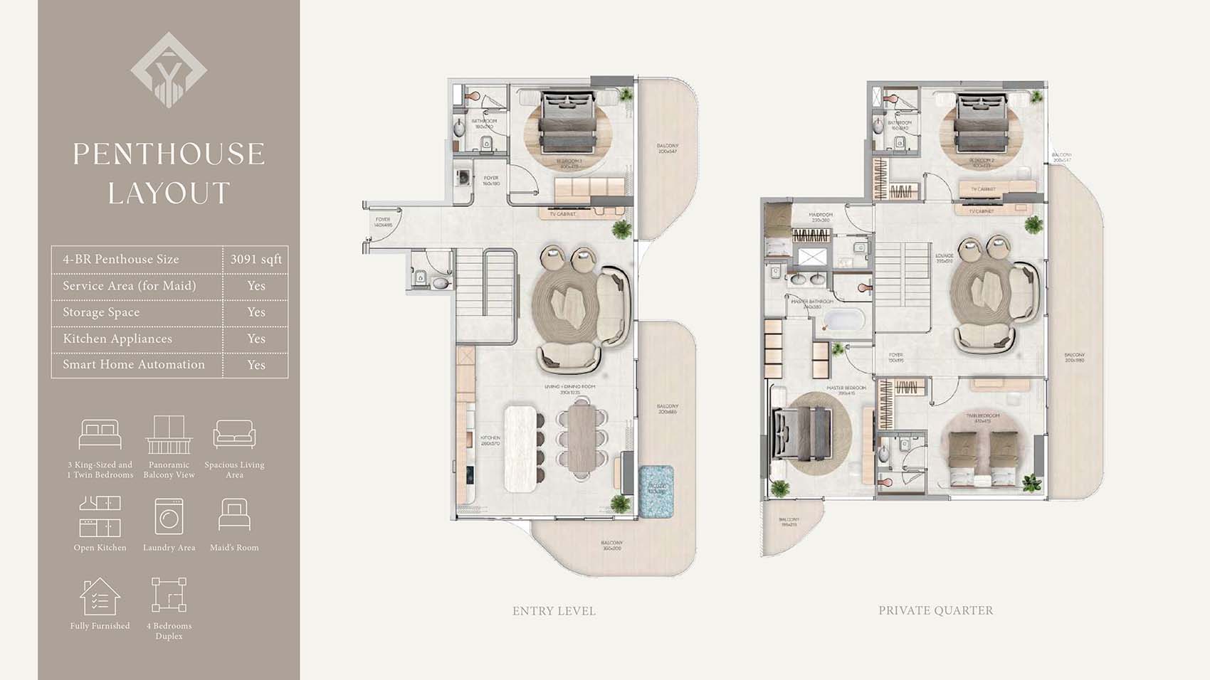The residential floors are placed upon the landscaped podium terrace, where ground and multiple podiums are planned for additional amenities and parking areas. Designed creatively by the award-winning architects, it defines shoreside cosmopolitan living, embraced by the natural beauty. The exterior is distinguished by the sea waves-like forms and stylish curves, while the bright golden-toned materials and expensive glass facade mirror the harmonious beauty of the dunes and ocean.