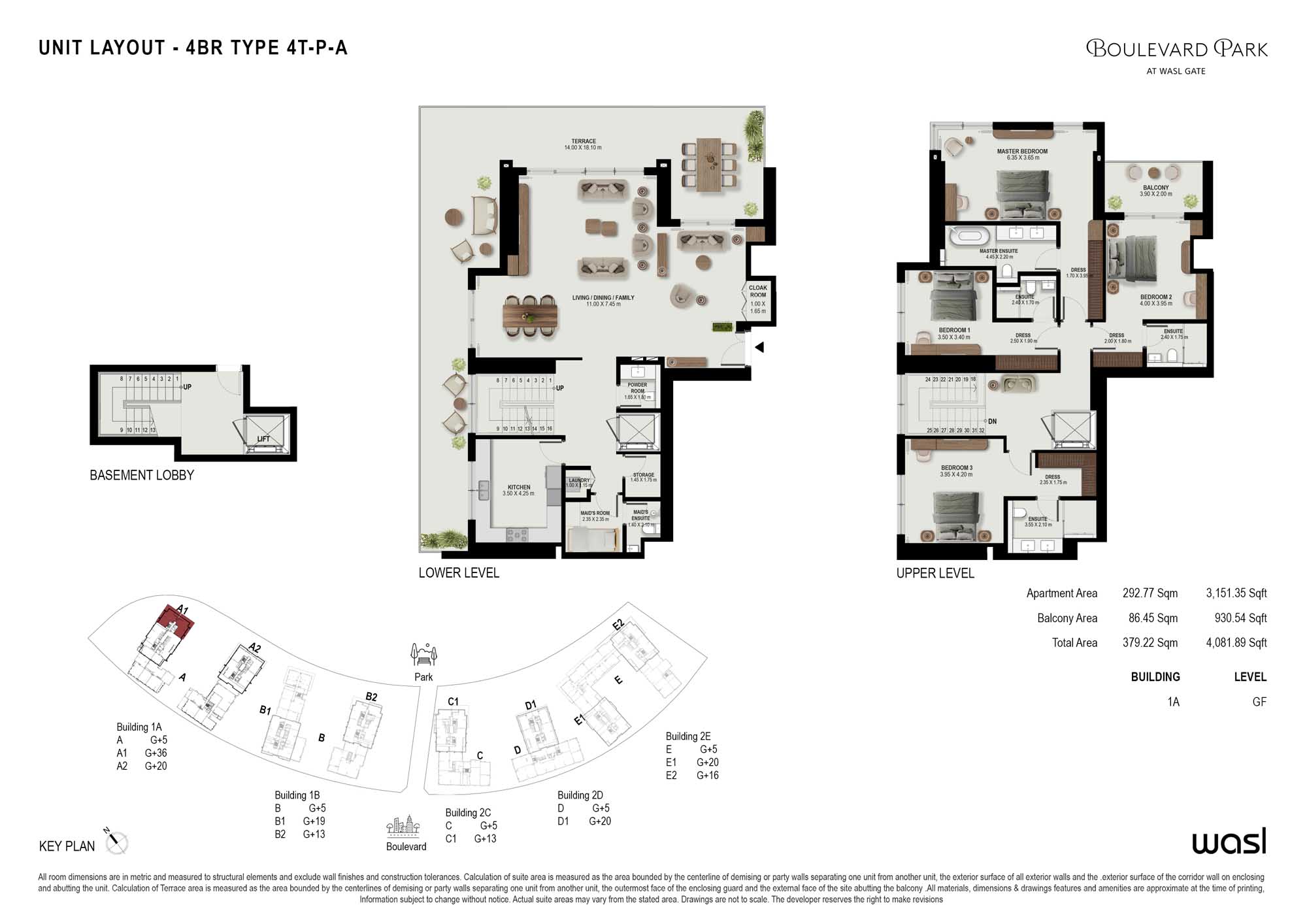 Characterised by distinctive sizes and types of state-of-the-art residences, the buildings integrate IP IP-based video intercom system, CCTV system, and gate barrier for parking lots. All three and four-bedroom townhouses offer terraces at the ground level and personal elevators accessible from the parking zone to the second level of the residences. Apart from it, this gated community of Wasl offers a pedestrian-friendly, calm and cheerful locale with easier access to the walking & jogging trails of the park, a buzzing boulevard with cafes, dining, and shopping outlets, courtyards, wellness, playful & fitness facilities, all within reach.