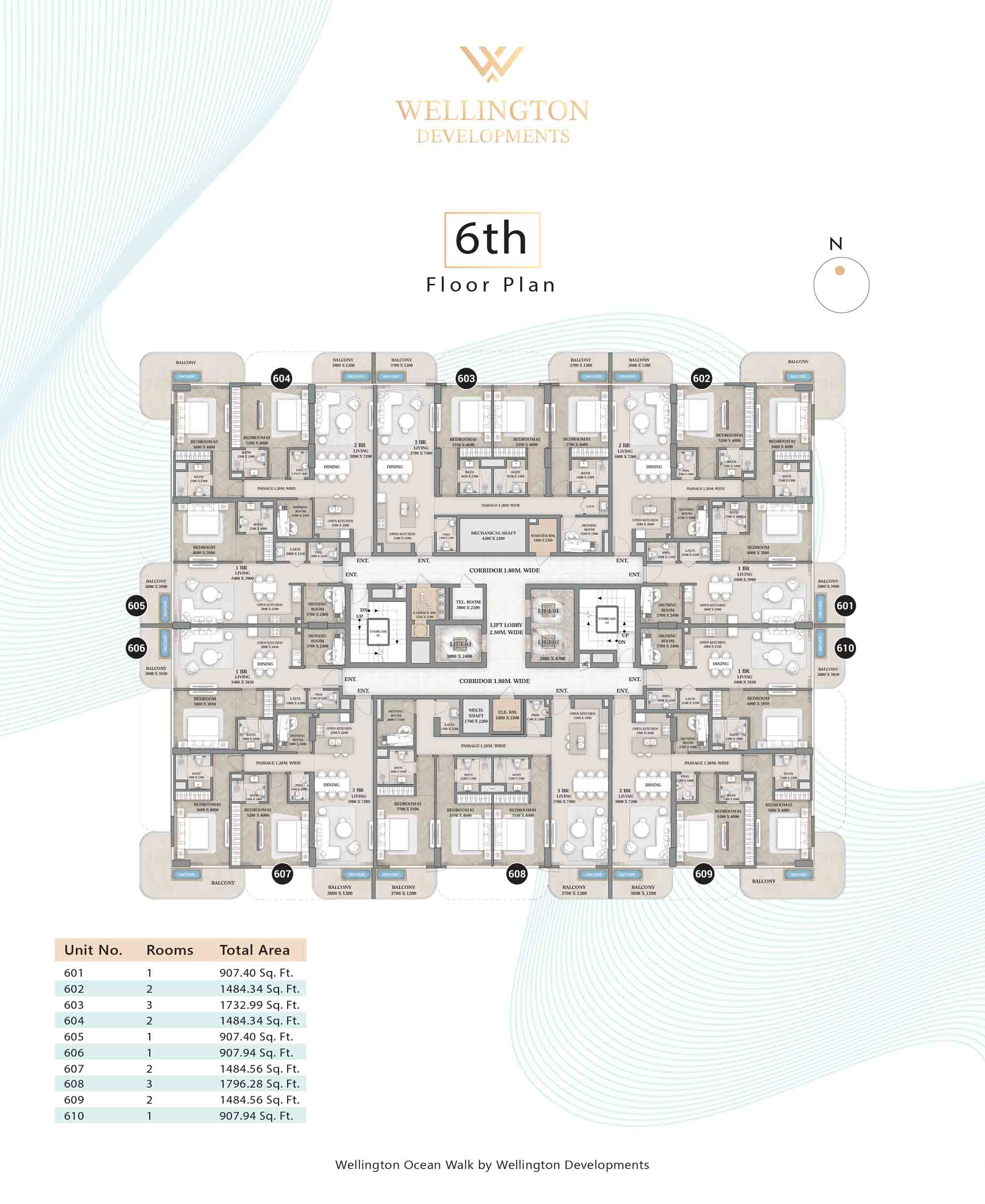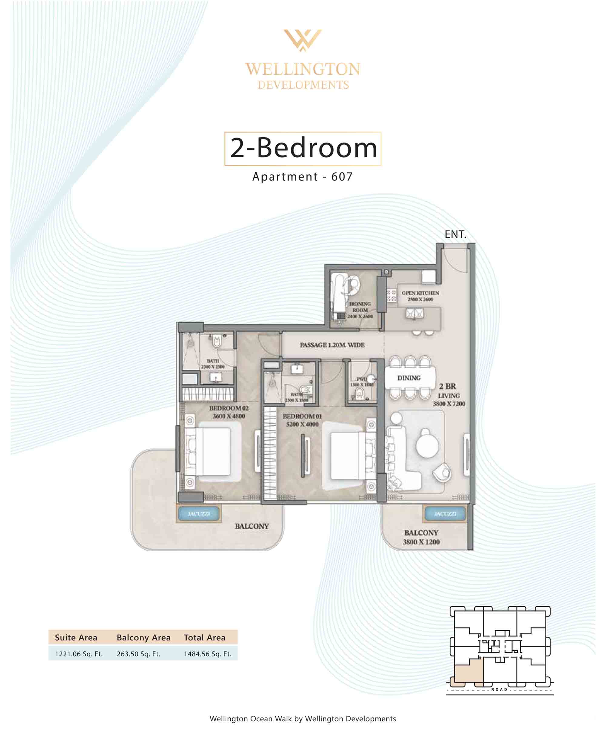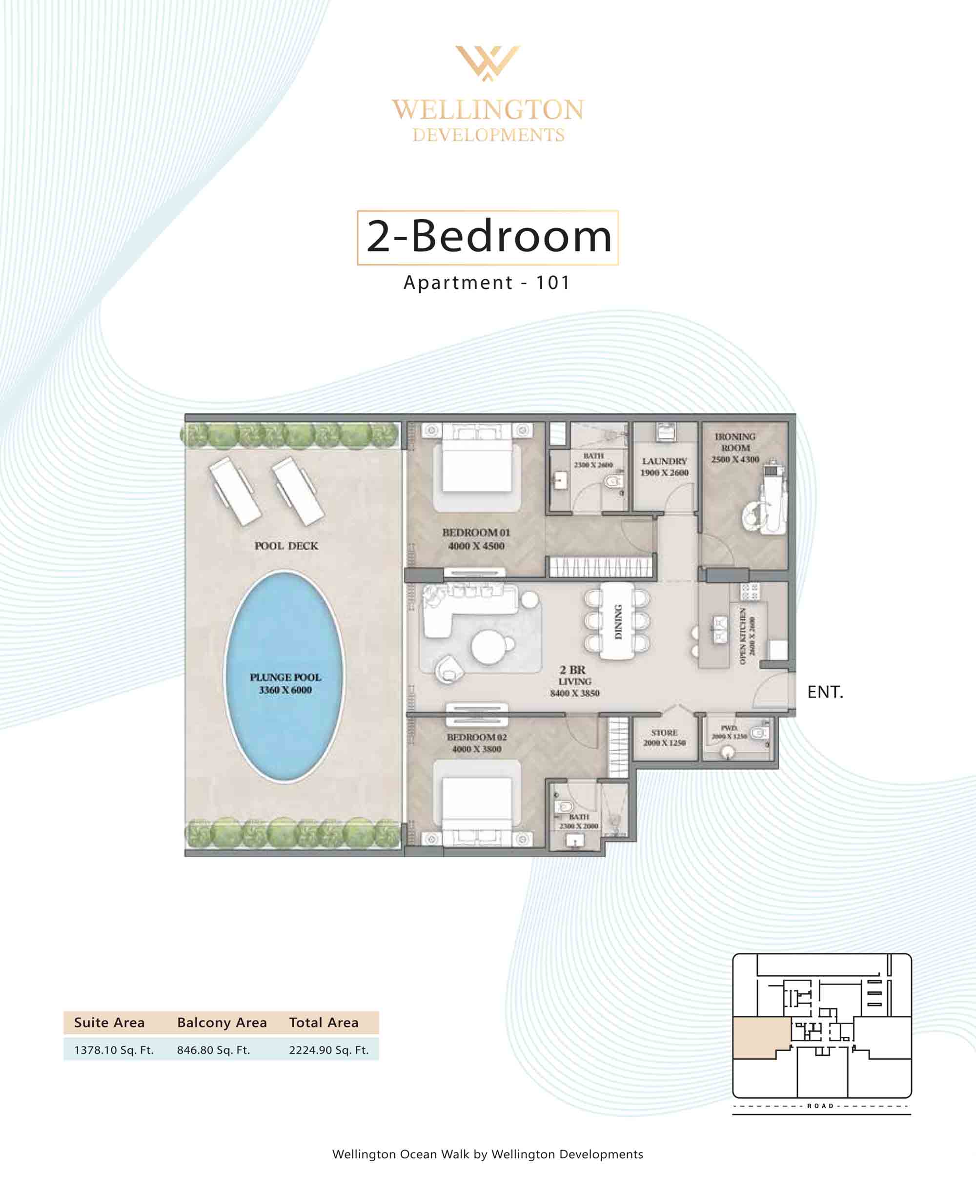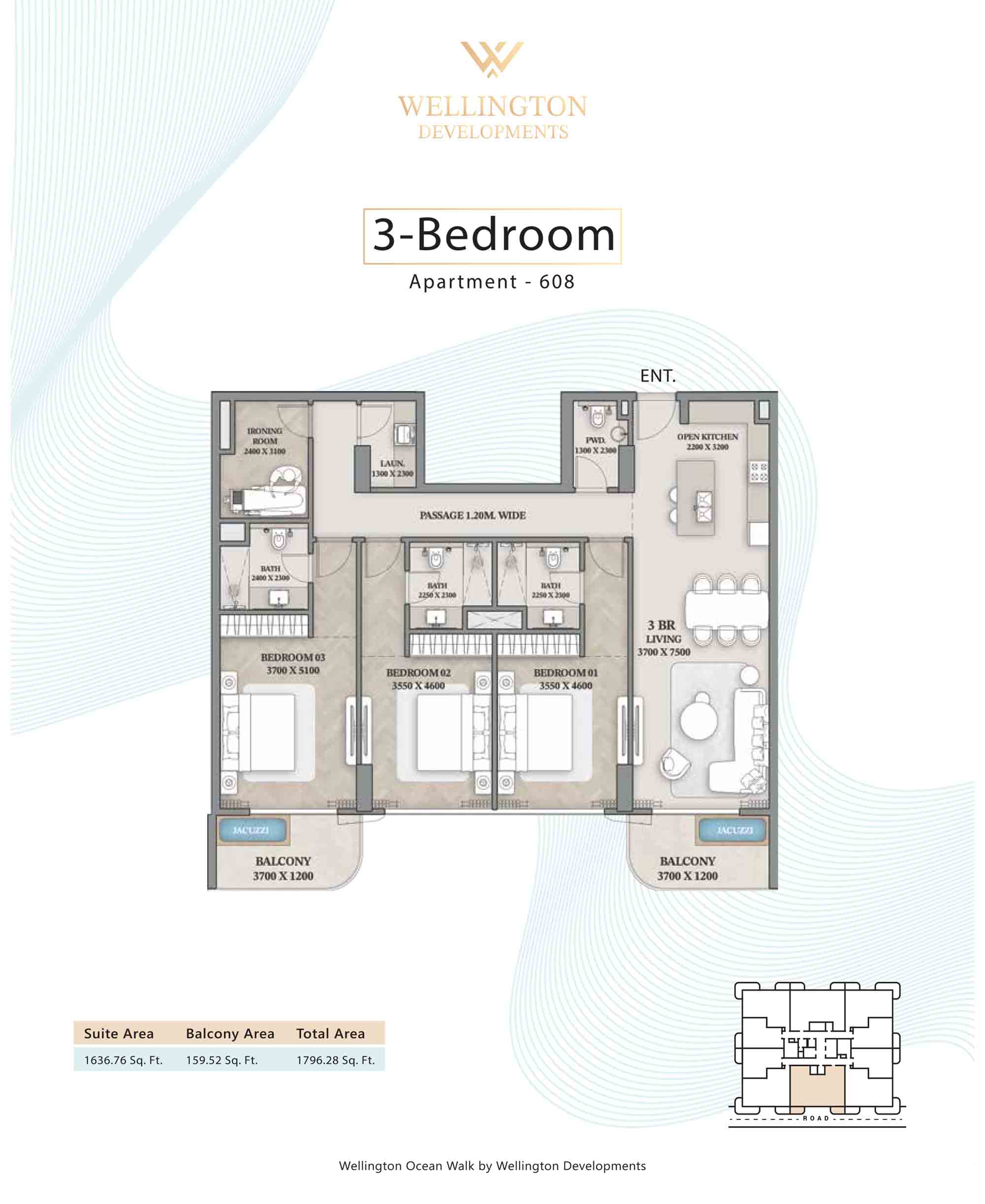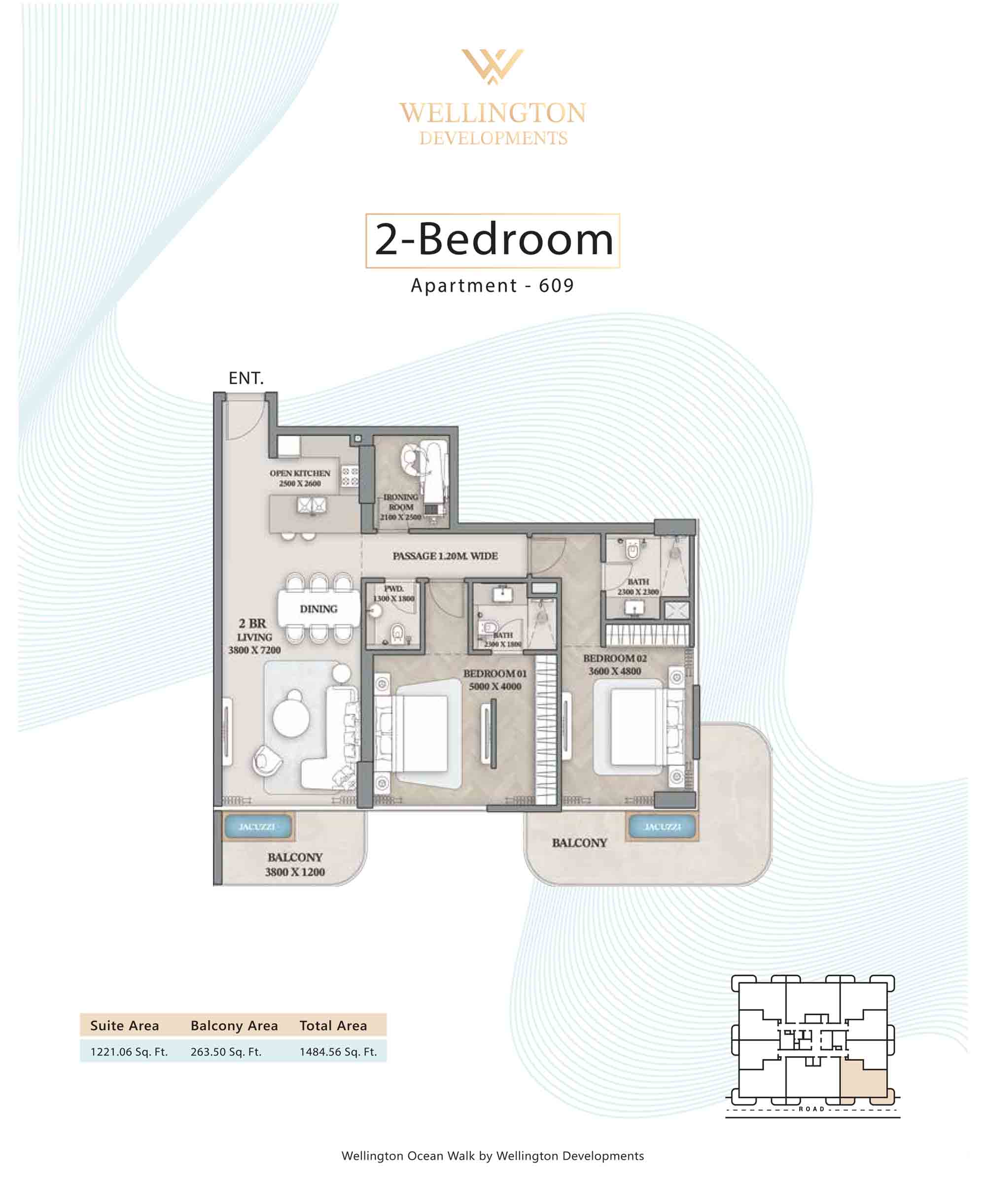 Floor plans at Wellington Ocean Walk include 1 and 2-bedroom apartments and 3-bedroom duplexes with options of either a personal jacuzzi or study room. In this 10-storey masterpiece, only 8 floors offer 79 homes. Each unit is perfect for individuals, couples, and families with vast layouts and open plan design to taste an elevated lifestyle. Here, every sanctuary is defined by high-ceiling windows and vast balconies to observe the serene waterfront and bustling island views. Insides are imagined with neutral and earthy tones, a furnished living space, including a dining zone and an open and fully equipped kitchen. Bedrooms are extremely warm and impressive with opulent lighting, tones, and quality furnishings. The interiors are crafted with meticulous attention to detail, incorporating premium finishes and high-quality materials that exude a luxurious ambience.
