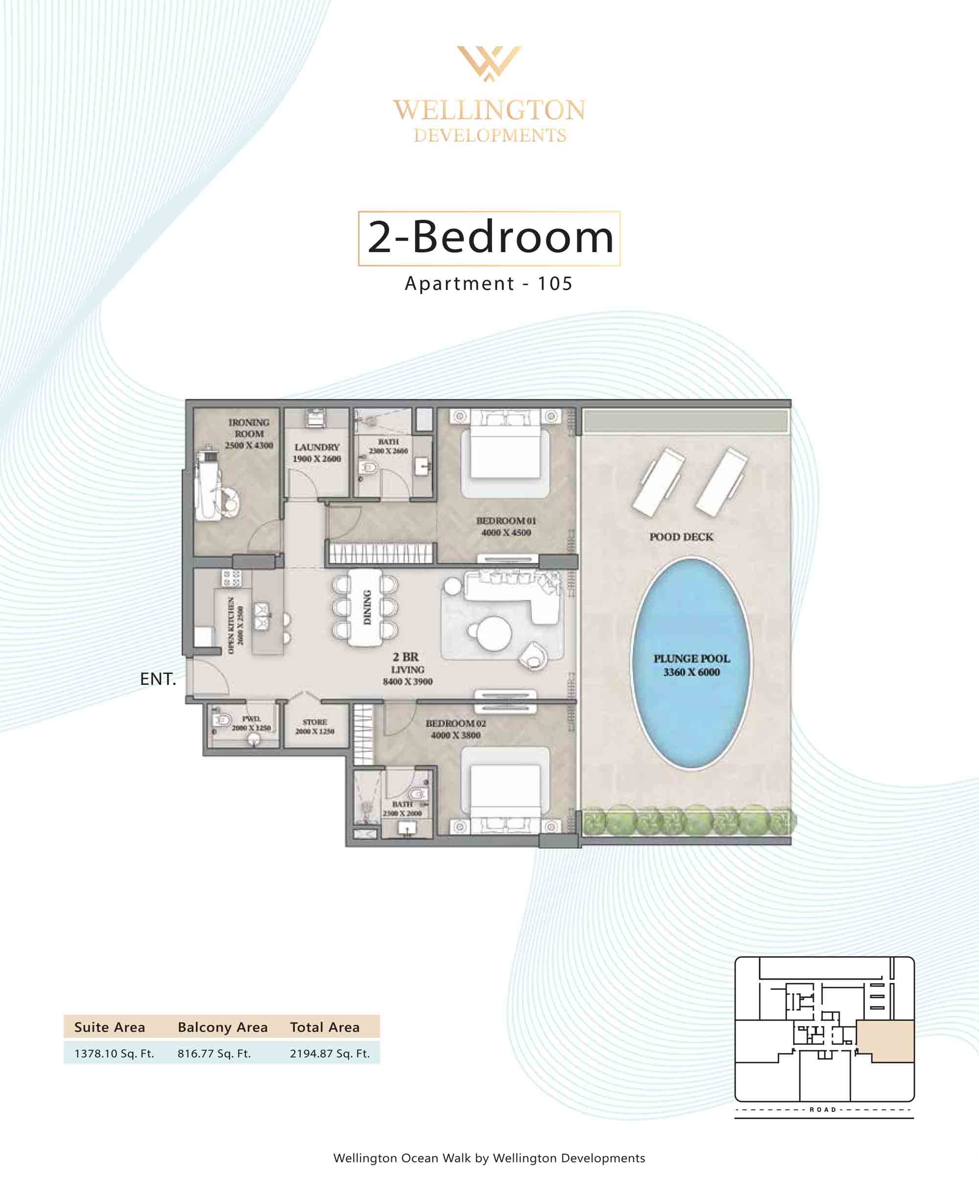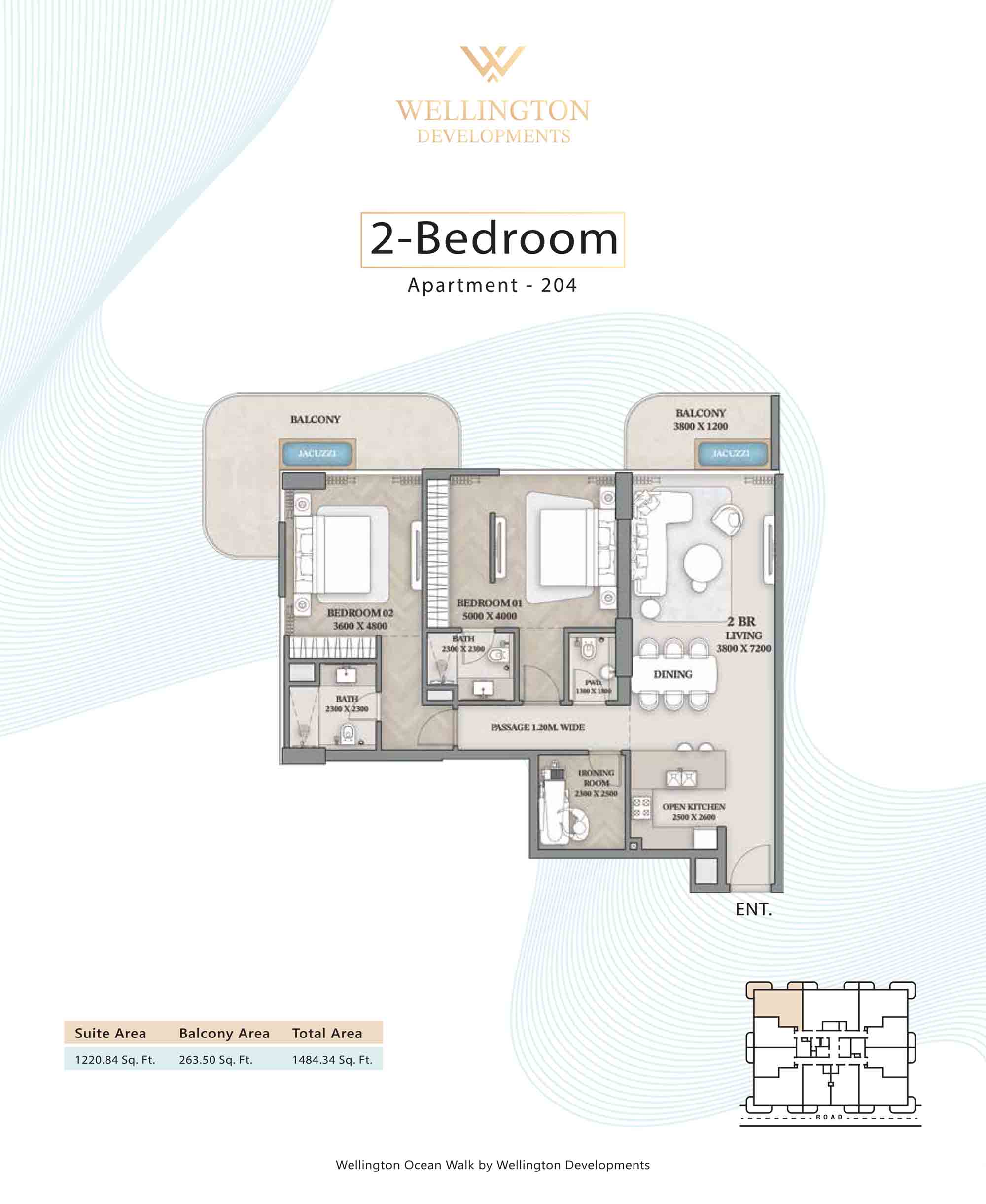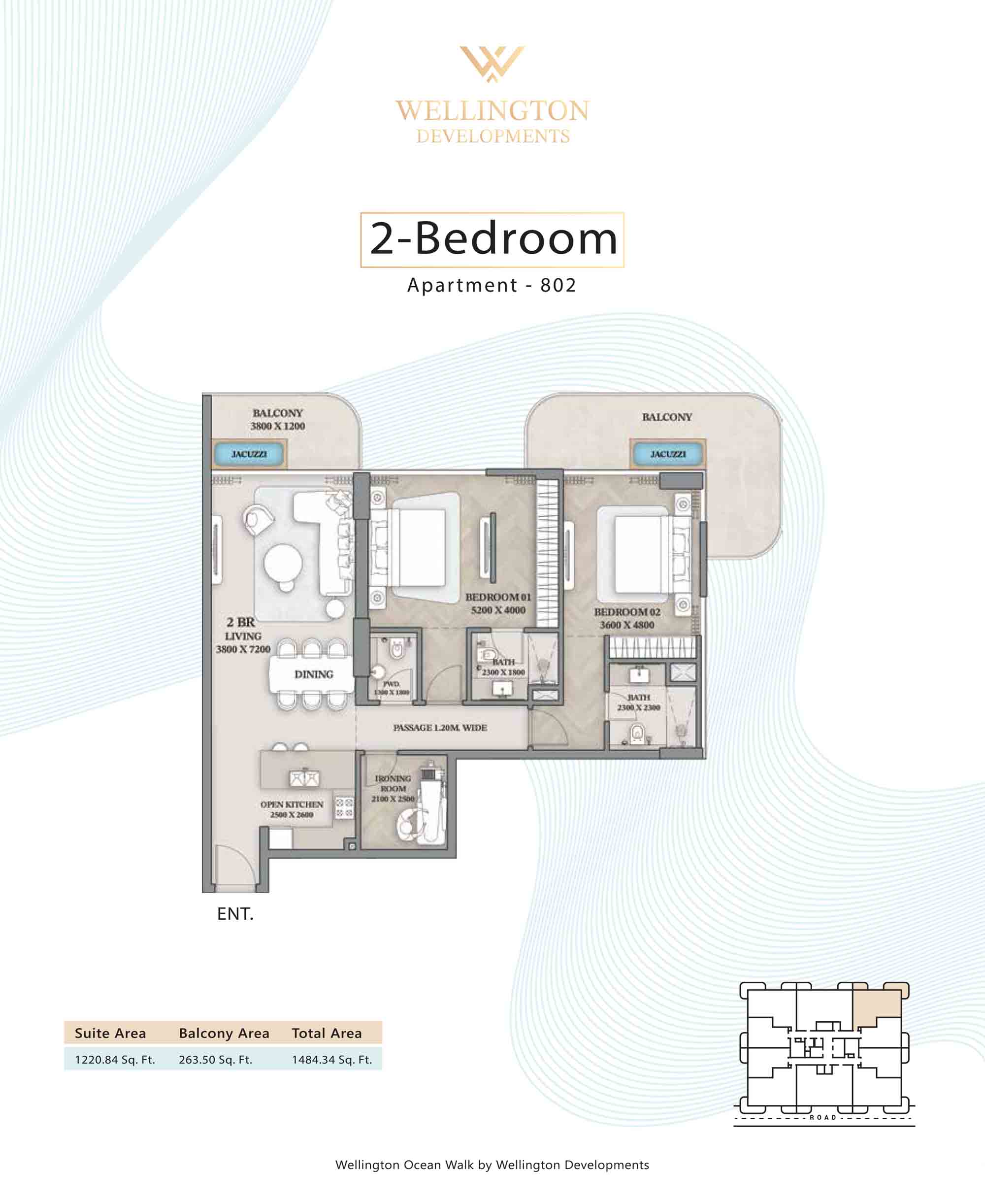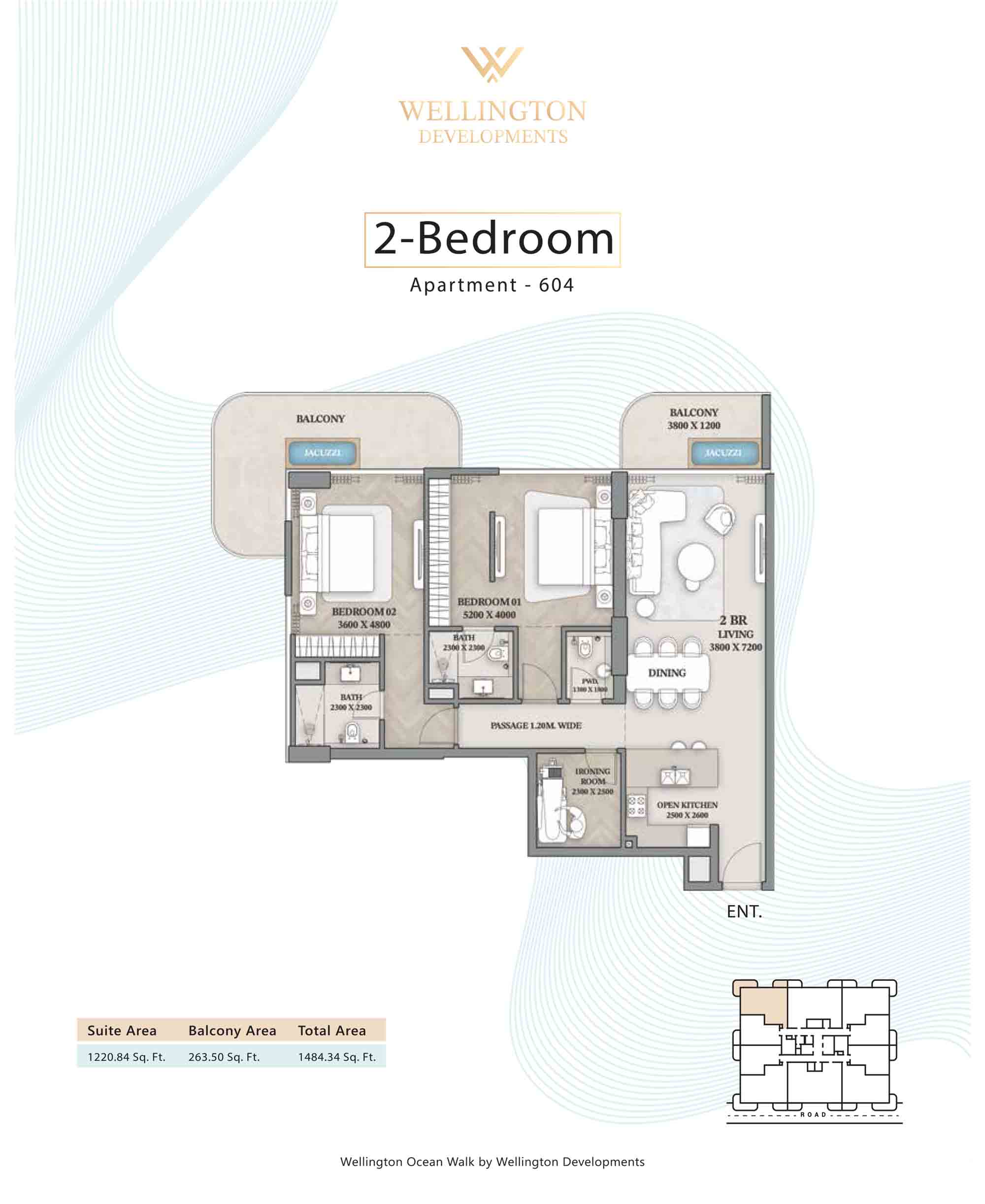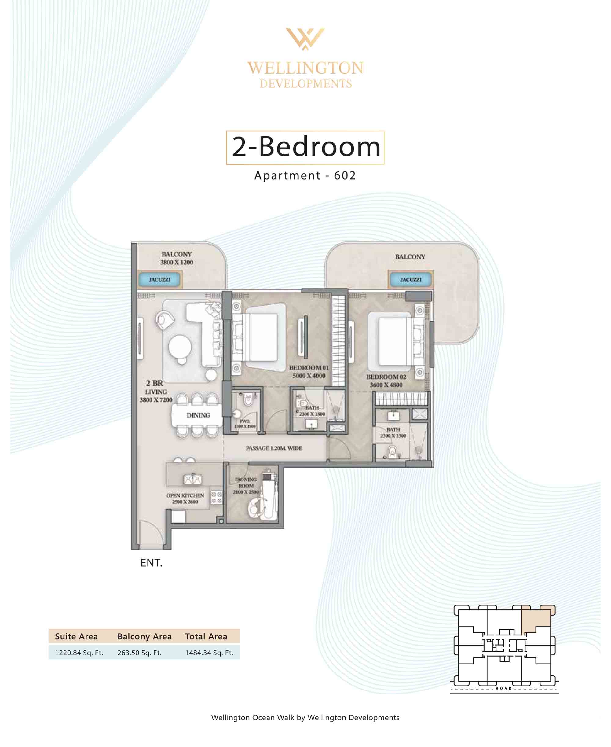 Floor plans at Wellington Ocean Walk include 1 and 2-bedroom apartments and 3-bedroom duplexes with options of either a personal jacuzzi or study room. In this 10-storey masterpiece, only 8 floors offer 79 homes. Each unit is perfect for individuals, couples, and families with vast layouts and open plan design to taste an elevated lifestyle. Here, every sanctuary is defined by high-ceiling windows and vast balconies to observe the serene waterfront and bustling island views. Insides are imagined with neutral and earthy tones, a furnished living space, including a dining zone and an open and fully equipped kitchen. Bedrooms are extremely warm and impressive with opulent lighting, tones, and quality furnishings. The interiors are crafted with meticulous attention to detail, incorporating premium finishes and high-quality materials that exude a luxurious ambience.