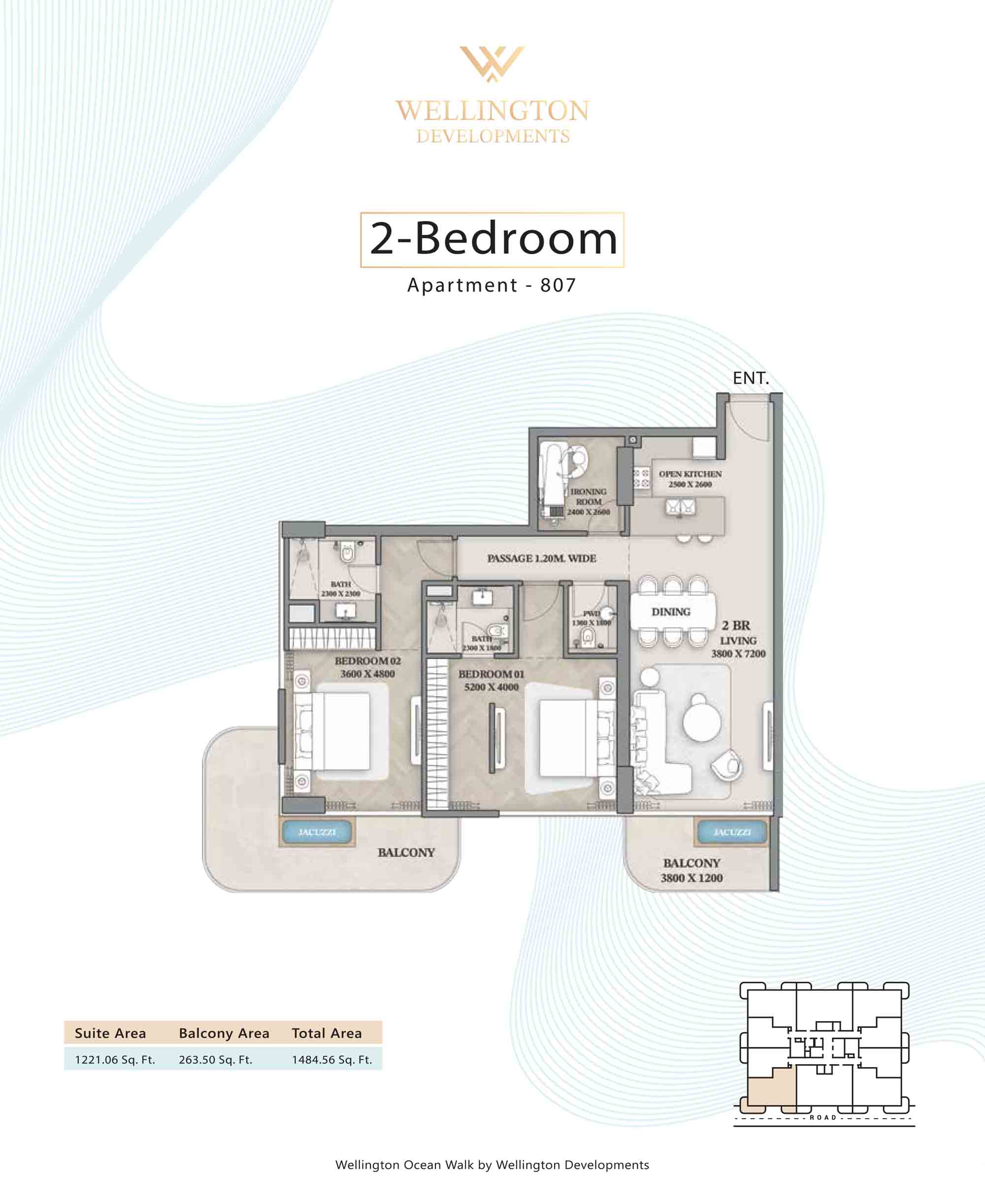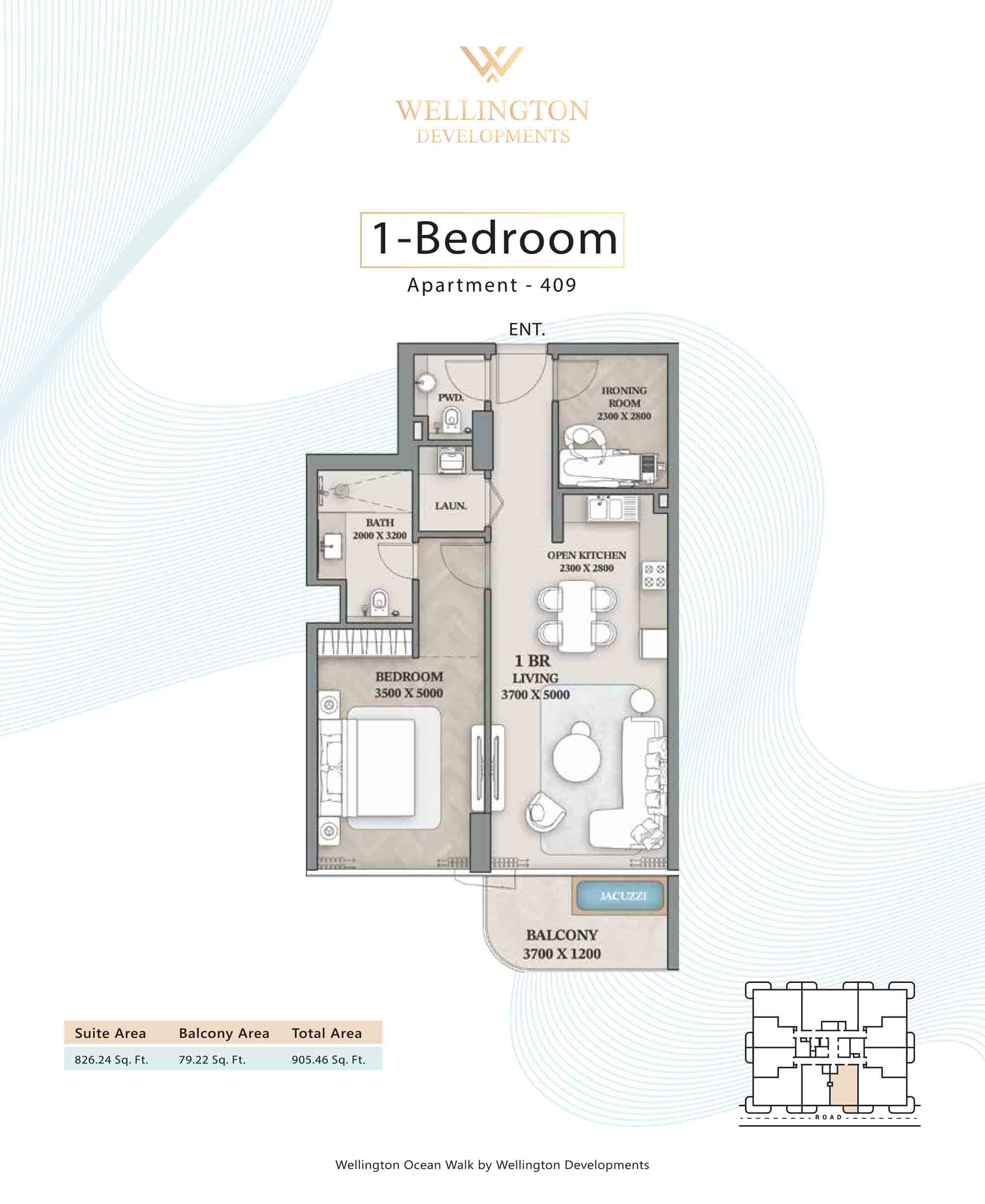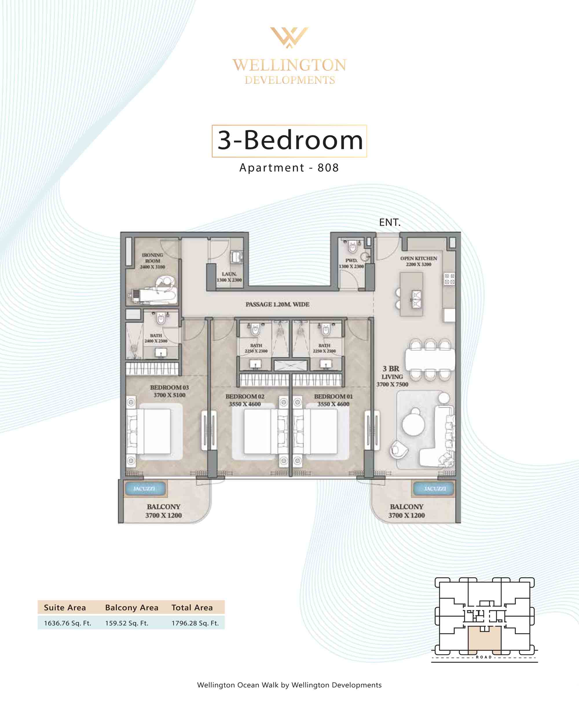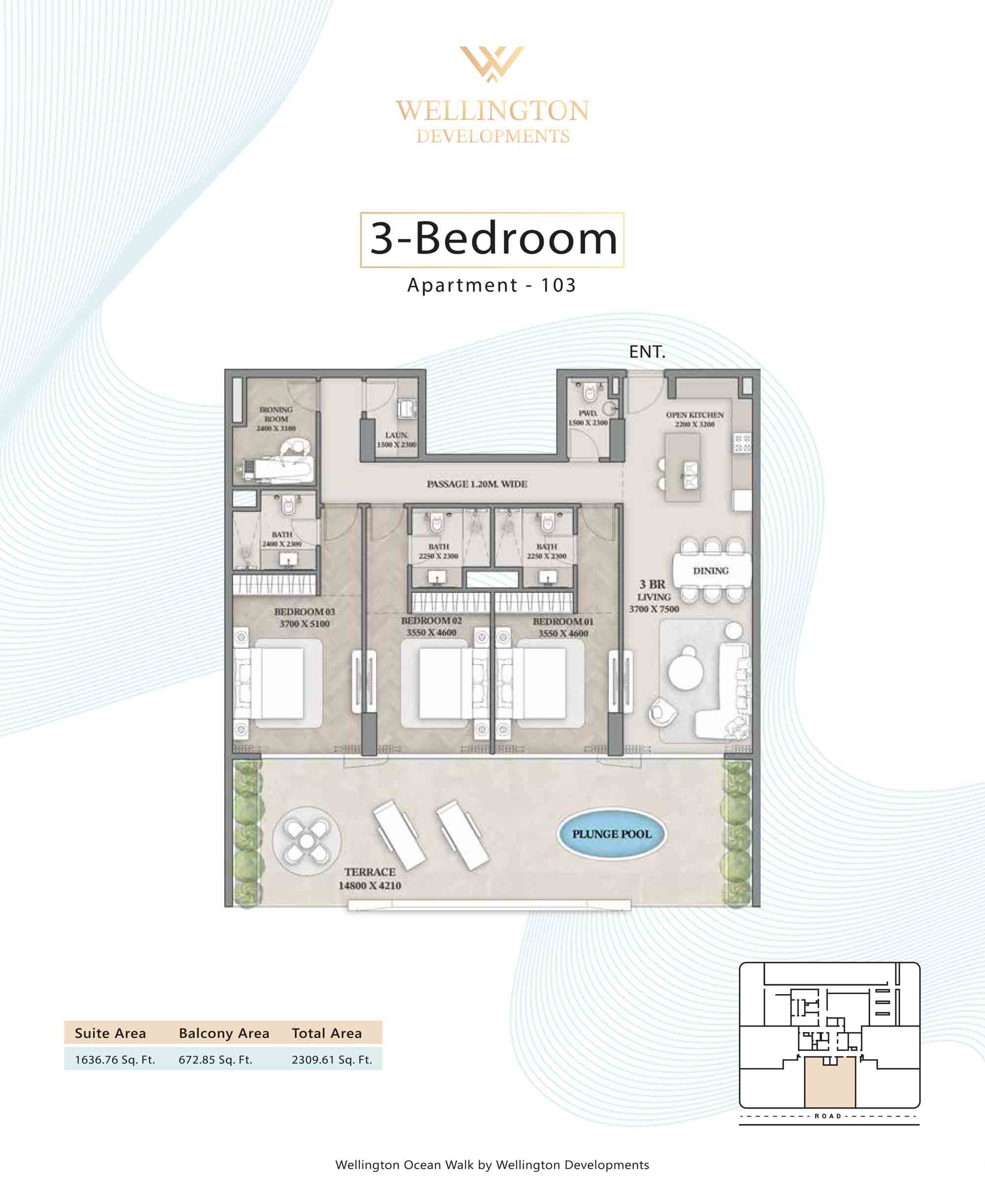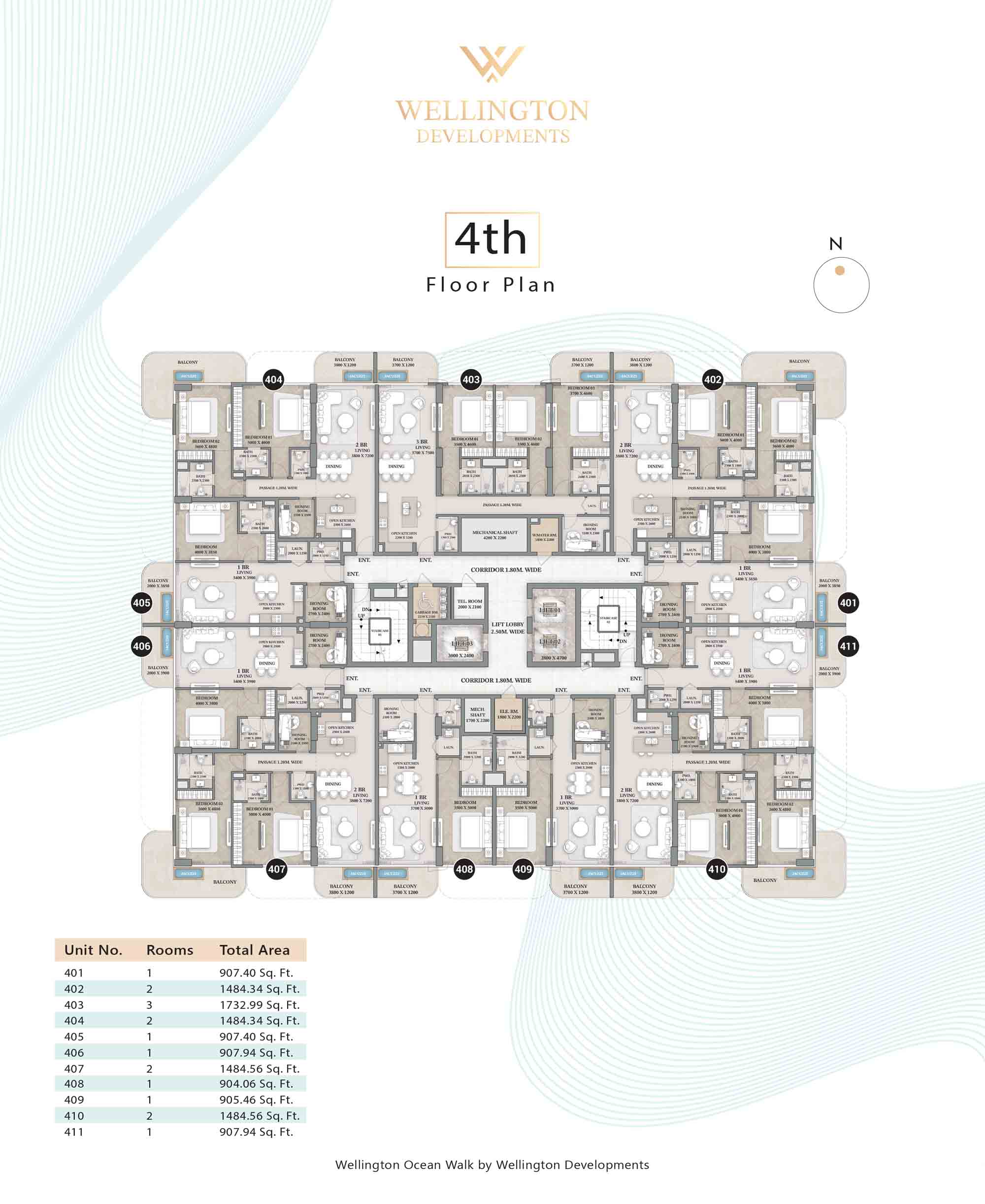 Floor plans at Wellington Ocean Walk include 1 and 2-bedroom apartments and 3-bedroom duplexes with options of either a personal jacuzzi or study room. In this 10-storey masterpiece, only 8 floors offer 79 homes. Each unit is perfect for individuals, couples, and families with vast layouts and open plan design to taste an elevated lifestyle. Here, every sanctuary is defined by high-ceiling windows and vast balconies to observe the serene waterfront and bustling island views. Insides are imagined with neutral and earthy tones, a furnished living space, including a dining zone and an open and fully equipped kitchen. Bedrooms are extremely warm and impressive with opulent lighting, tones, and quality furnishings. The interiors are crafted with meticulous attention to detail, incorporating premium finishes and high-quality materials that exude a luxurious ambience.