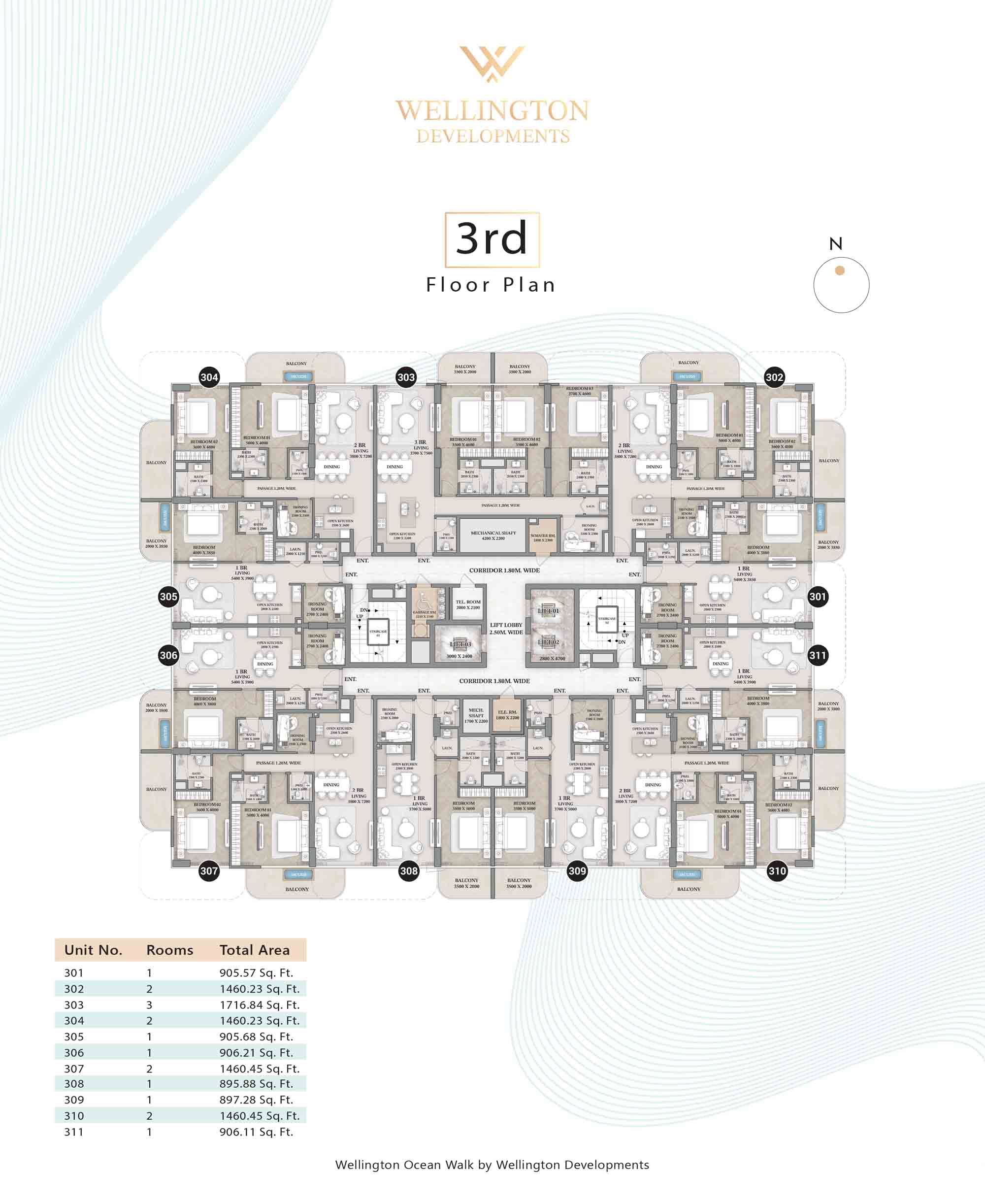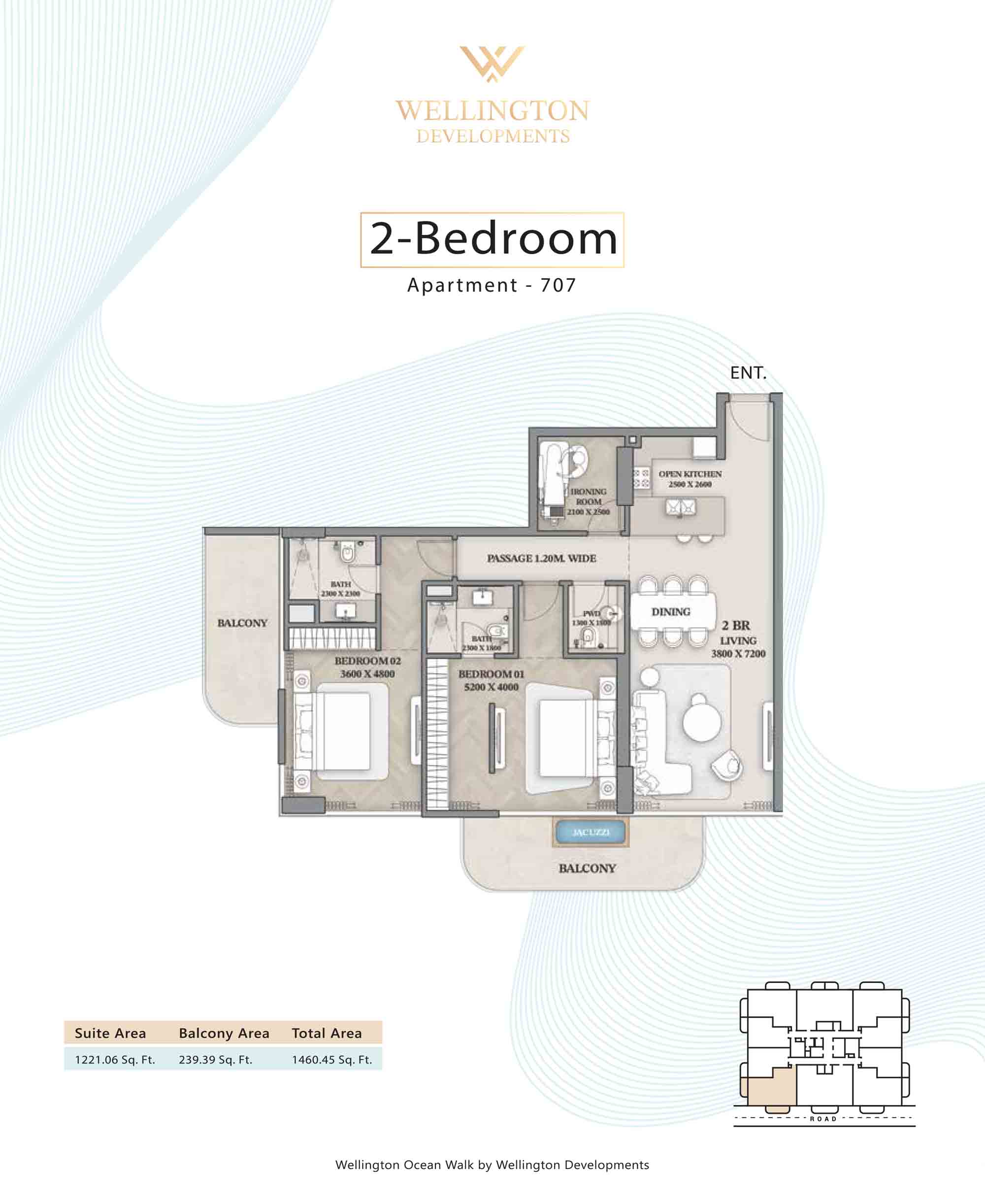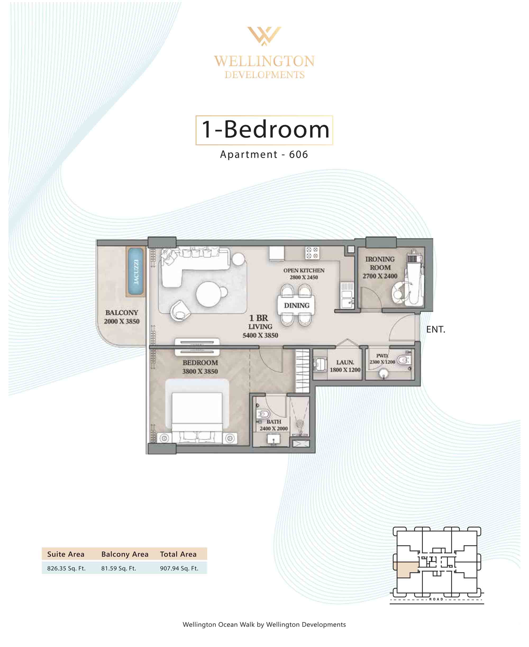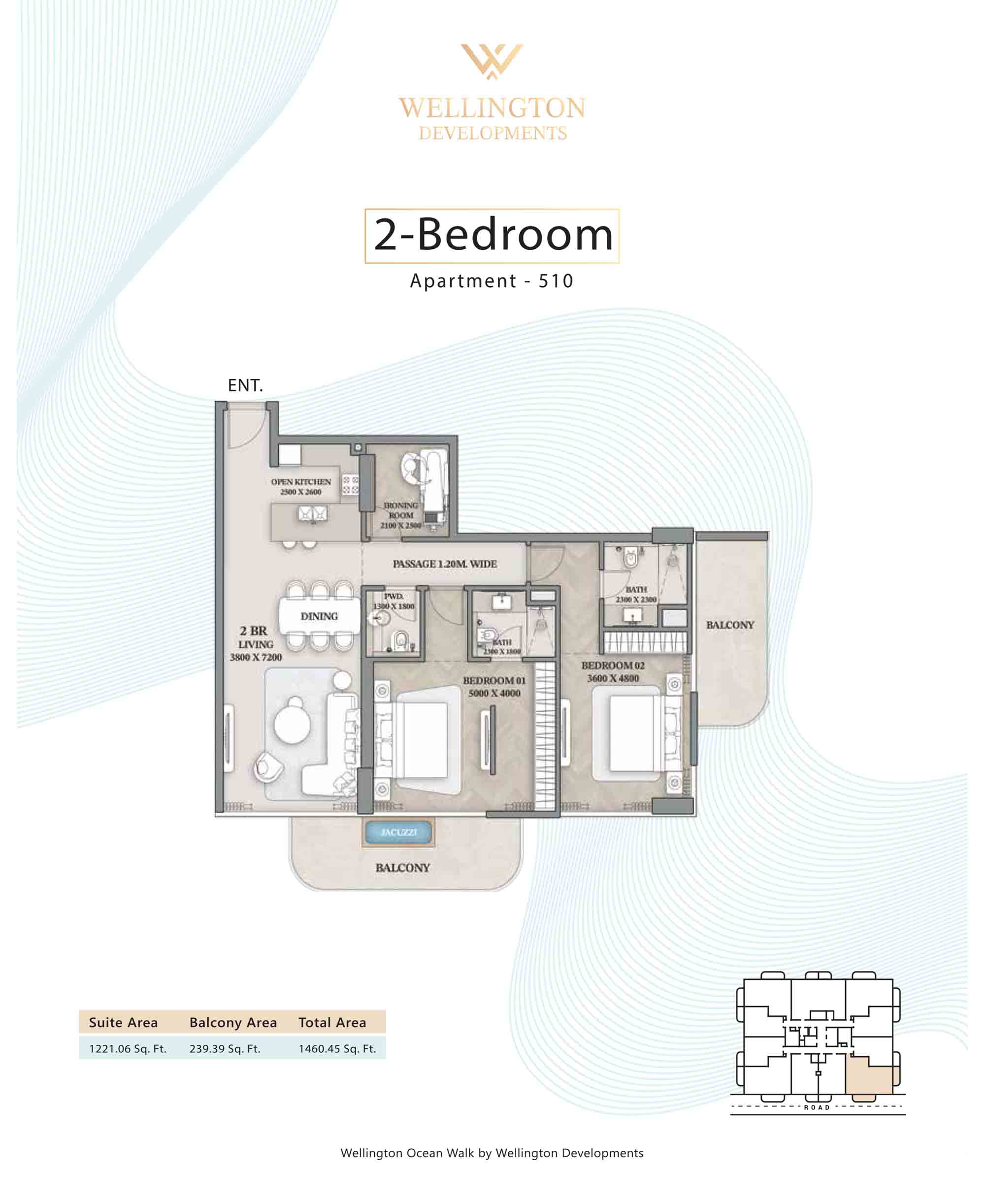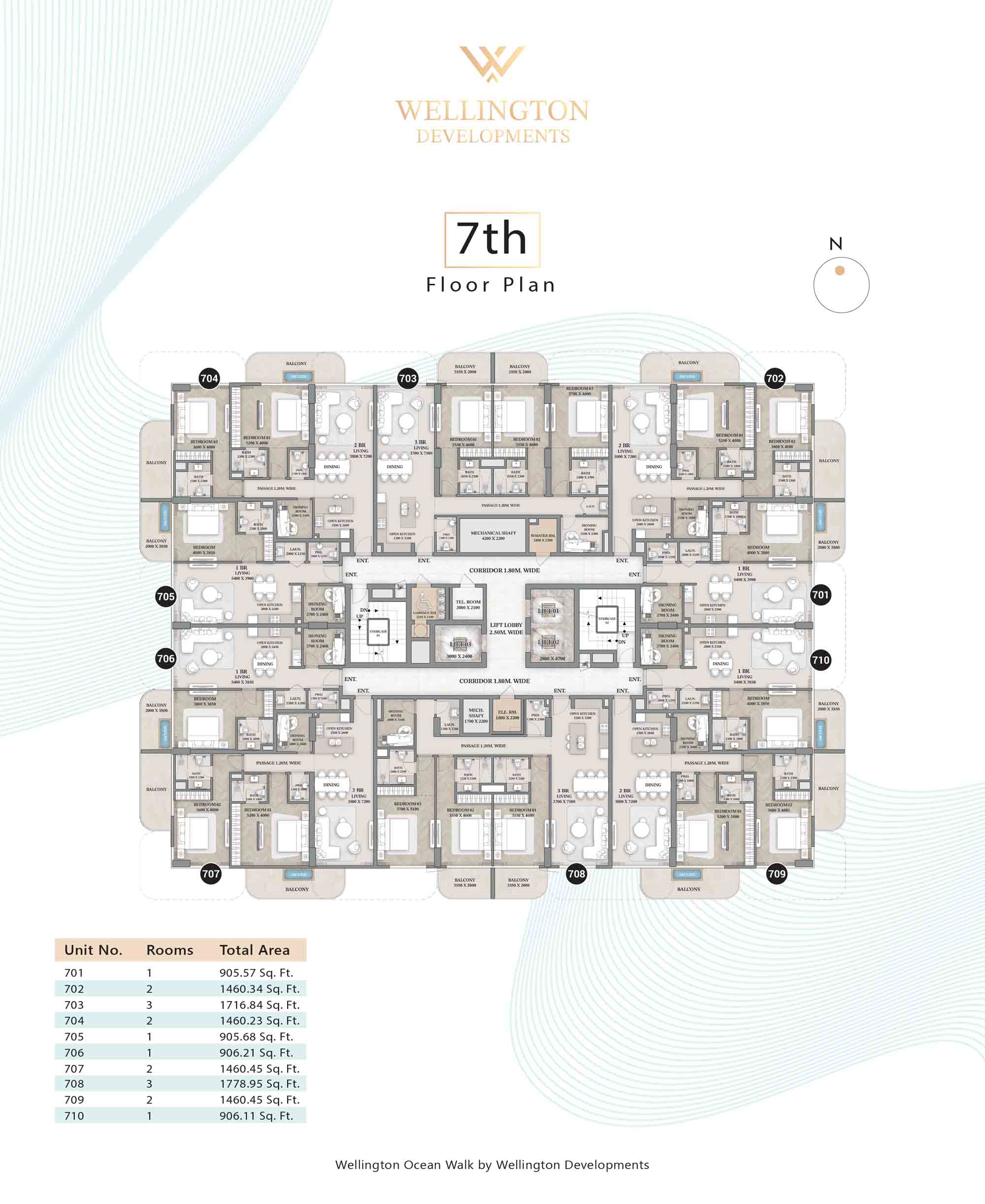 Floor plans at Wellington Ocean Walk include 1 and 2-bedroom apartments and 3-bedroom duplexes with options of either a personal jacuzzi or study room. In this 10-storey masterpiece, only 8 floors offer 79 homes. Each unit is perfect for individuals, couples, and families with vast layouts and open plan design to taste an elevated lifestyle. Here, every sanctuary is defined by high-ceiling windows and vast balconies to observe the serene waterfront and bustling island views. Insides are imagined with neutral and earthy tones, a furnished living space, including a dining zone and an open and fully equipped kitchen. Bedrooms are extremely warm and impressive with opulent lighting, tones, and quality furnishings. The interiors are crafted with meticulous attention to detail, incorporating premium finishes and high-quality materials that exude a luxurious ambience.
