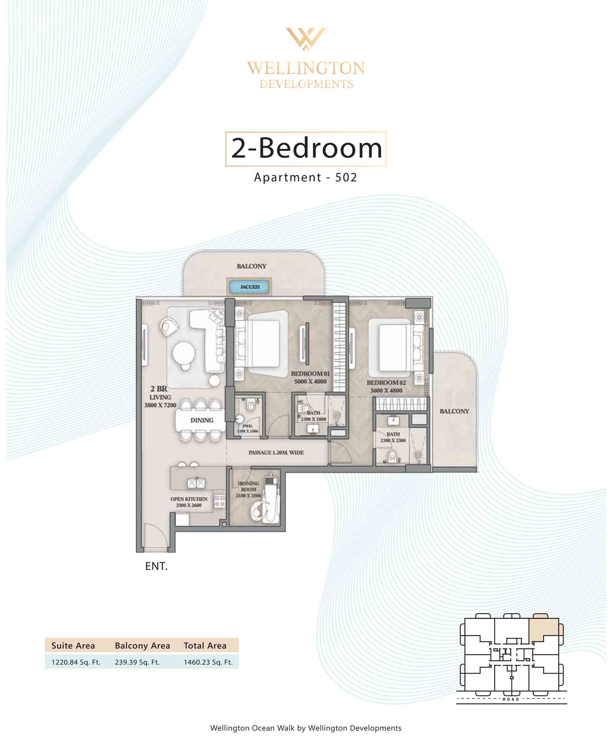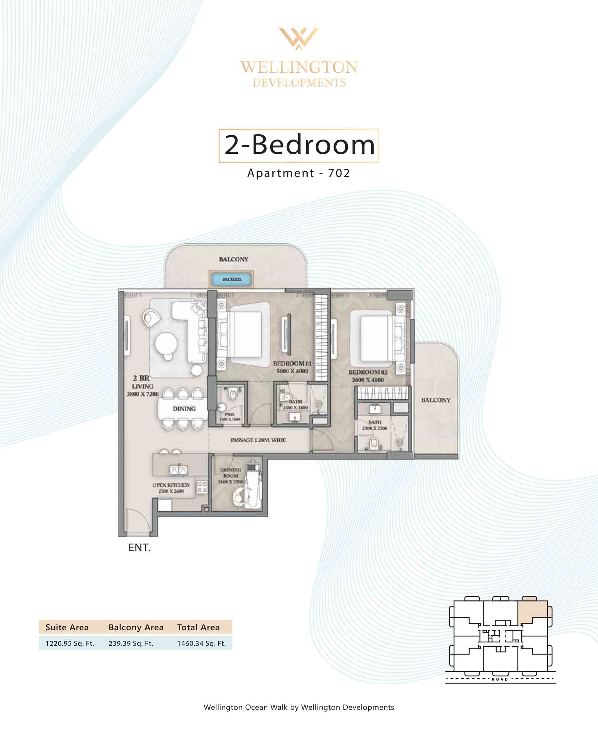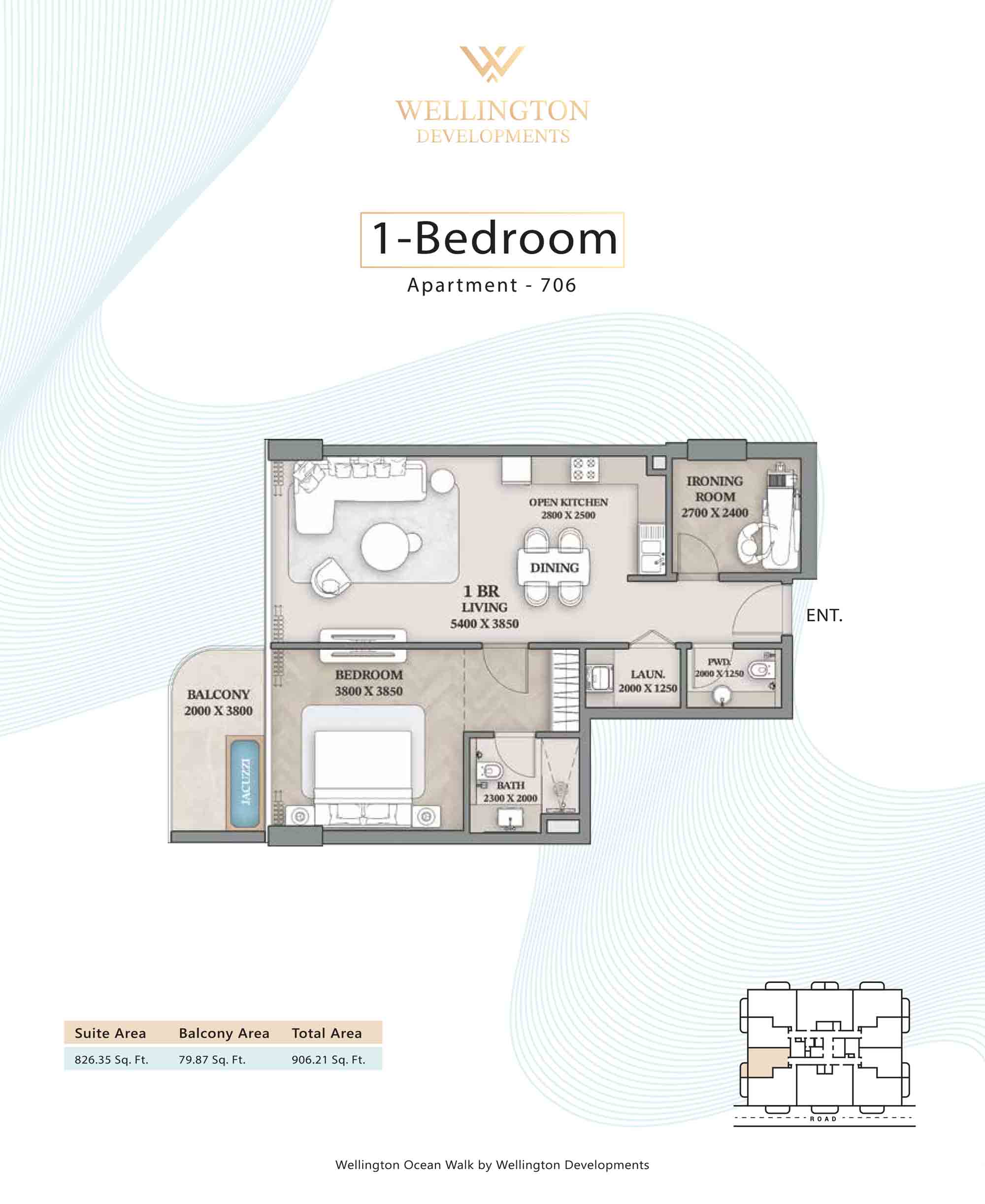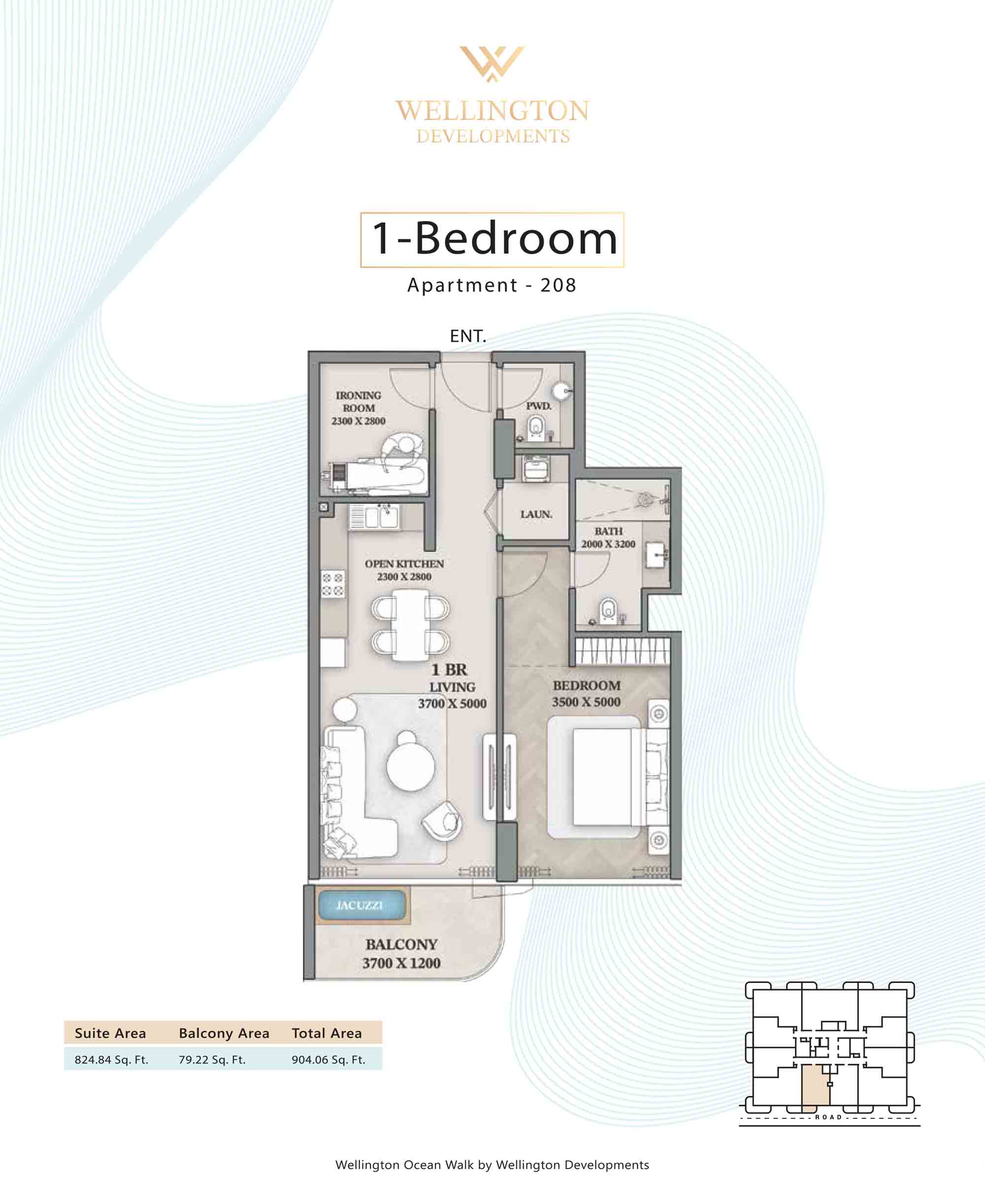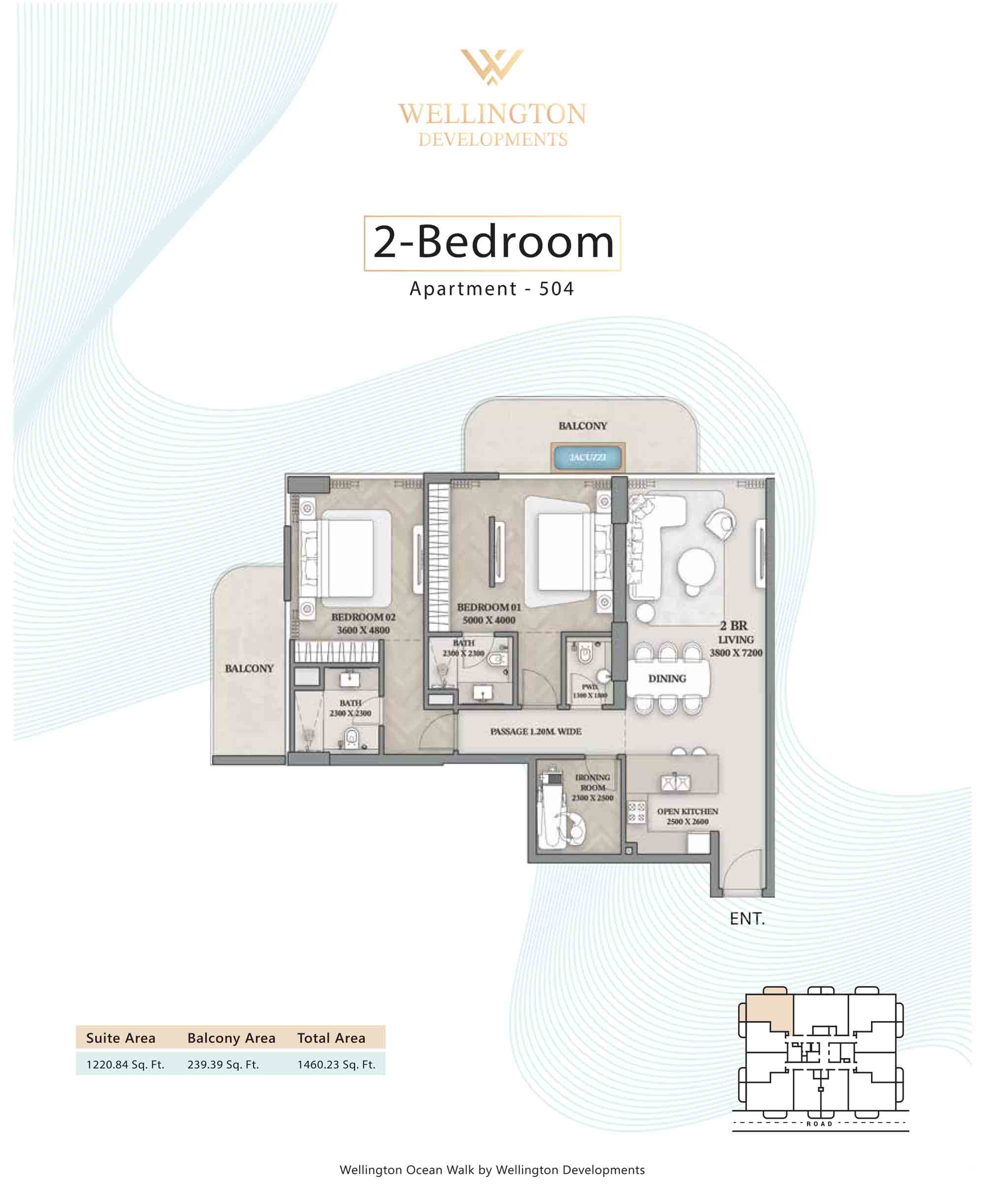 Floor plans at Wellington Ocean Walk include 1 and 2-bedroom apartments and 3-bedroom duplexes with options of either a personal jacuzzi or study room. In this 10-storey masterpiece, only 8 floors offer 79 homes. Each unit is perfect for individuals, couples, and families with vast layouts and open plan design to taste an elevated lifestyle. Here, every sanctuary is defined by high-ceiling windows and vast balconies to observe the serene waterfront and bustling island views. Insides are imagined with neutral and earthy tones, a furnished living space, including a dining zone and an open and fully equipped kitchen. Bedrooms are extremely warm and impressive with opulent lighting, tones, and quality furnishings. The interiors are crafted with meticulous attention to detail, incorporating premium finishes and high-quality materials that exude a luxurious ambience.