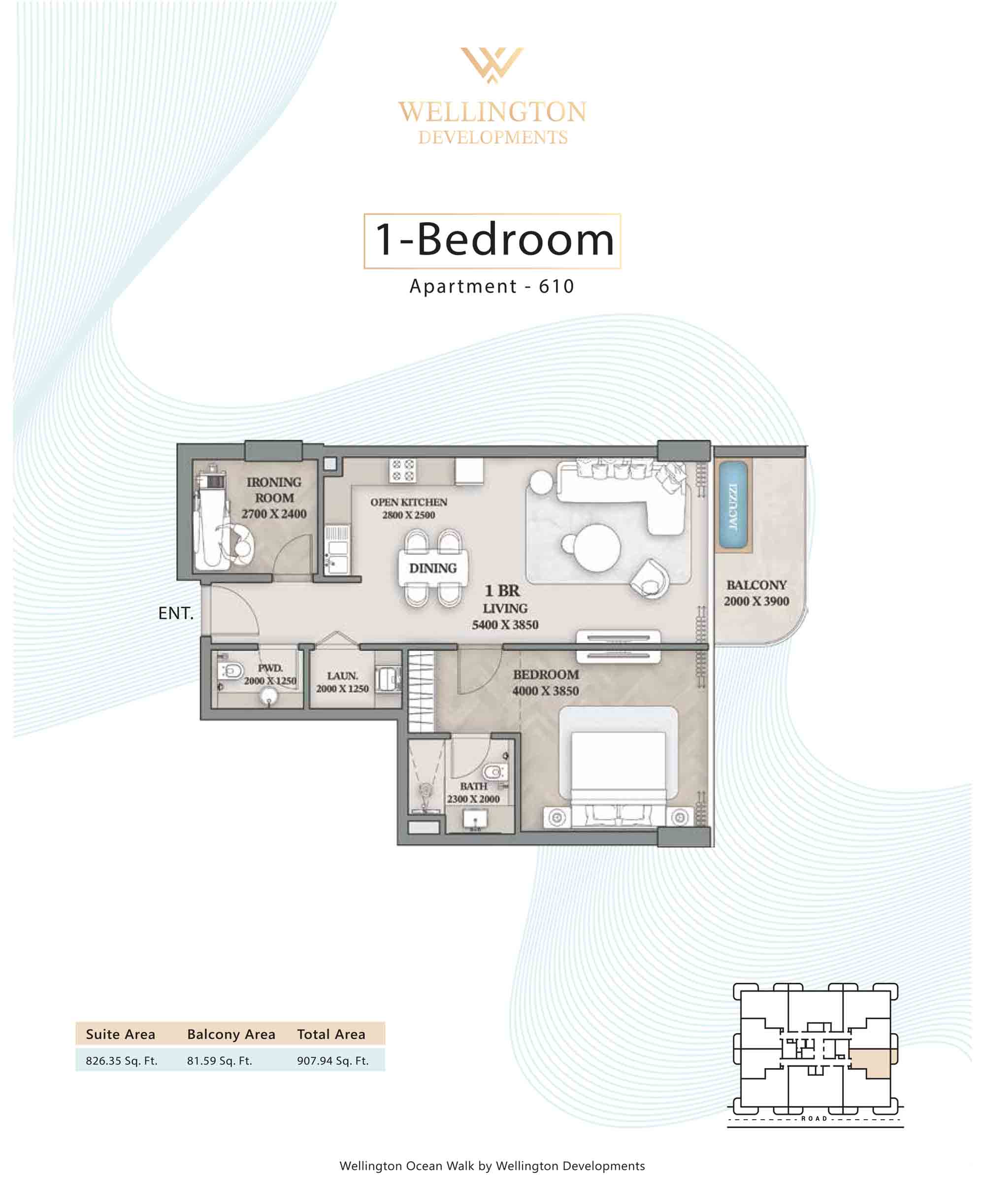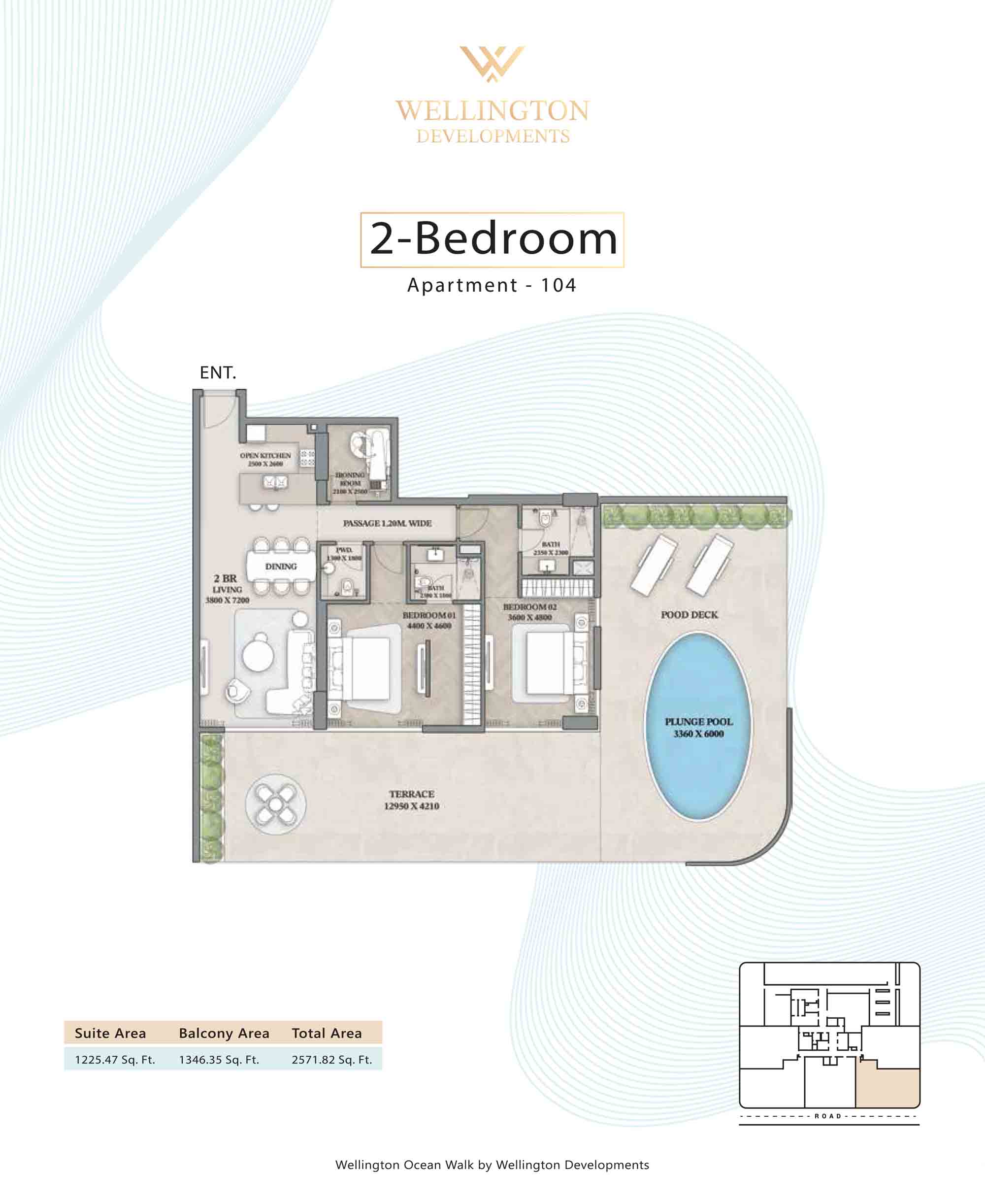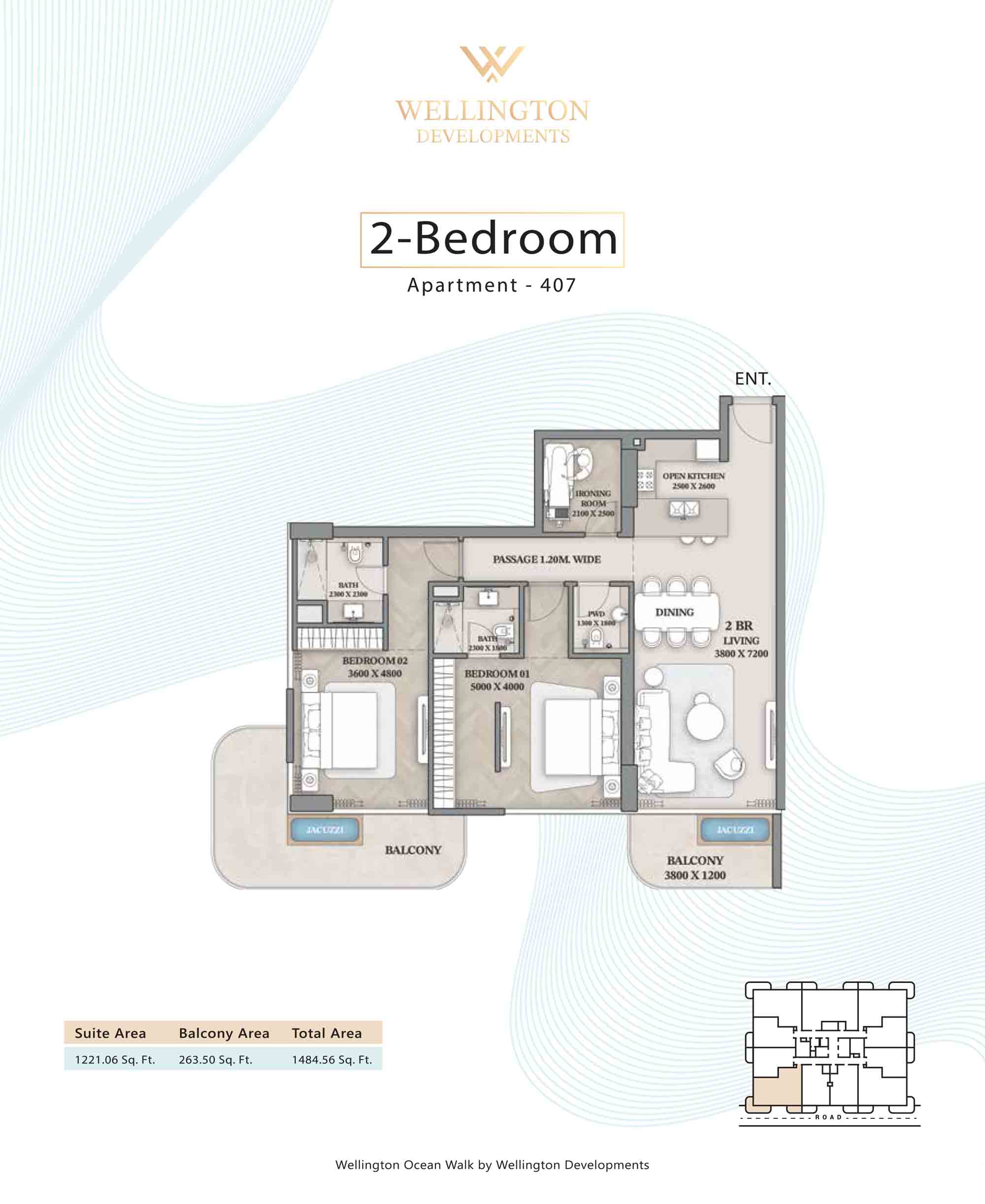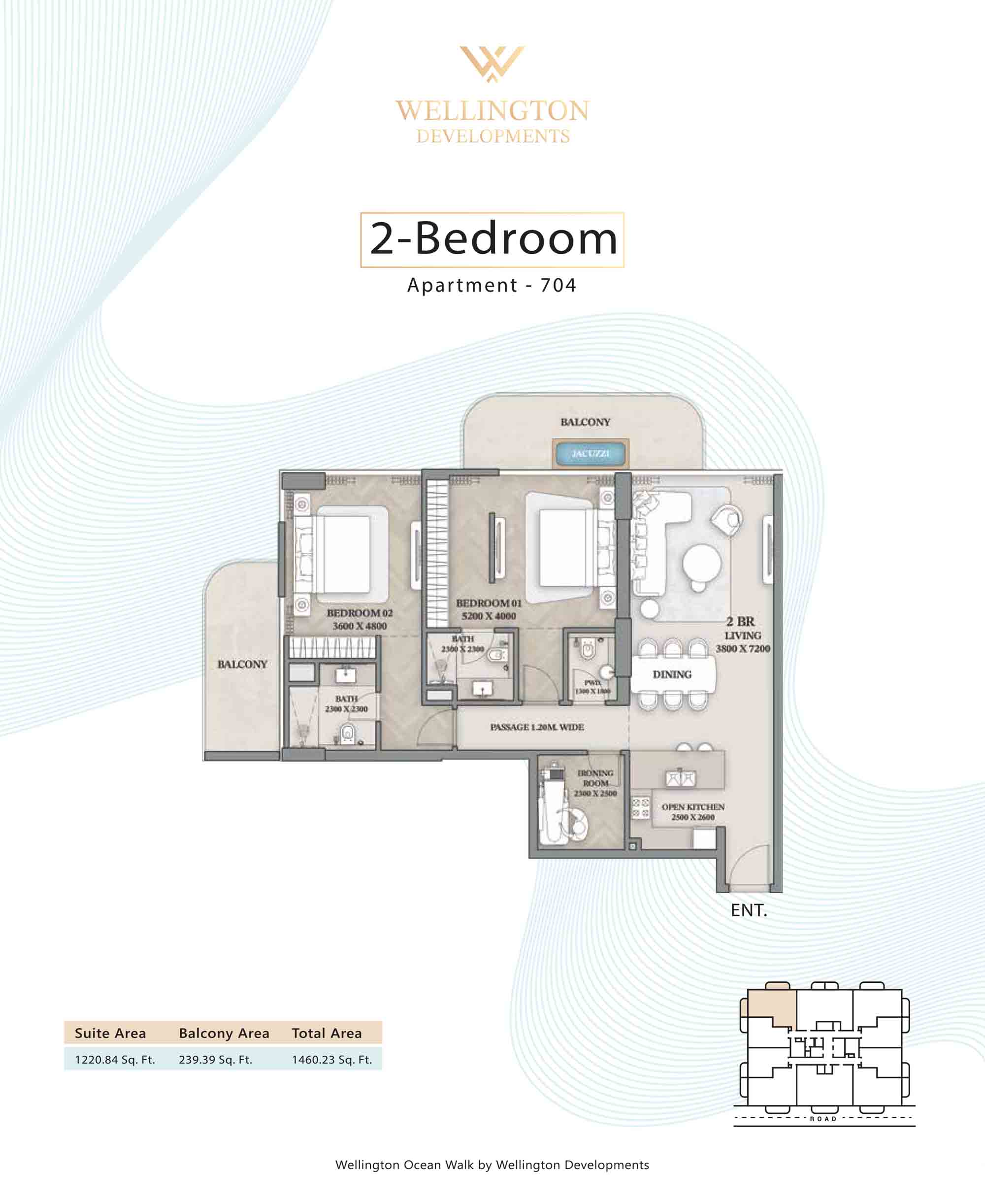 Floor plans at Wellington Ocean Walk include 1 and 2-bedroom apartments and 3-bedroom duplexes with options of either a personal jacuzzi or study room. In this 10-storey masterpiece, only 8 floors offer 79 homes. Each unit is perfect for individuals, couples, and families with vast layouts and open plan design to taste an elevated lifestyle. Here, every sanctuary is defined by high-ceiling windows and vast balconies to observe the serene waterfront and bustling island views. Insides are imagined with neutral and earthy tones, a furnished living space, including a dining zone and an open and fully equipped kitchen. Bedrooms are extremely warm and impressive with opulent lighting, tones, and quality furnishings. The interiors are crafted with meticulous attention to detail, incorporating premium finishes and high-quality materials that exude a luxurious ambience.