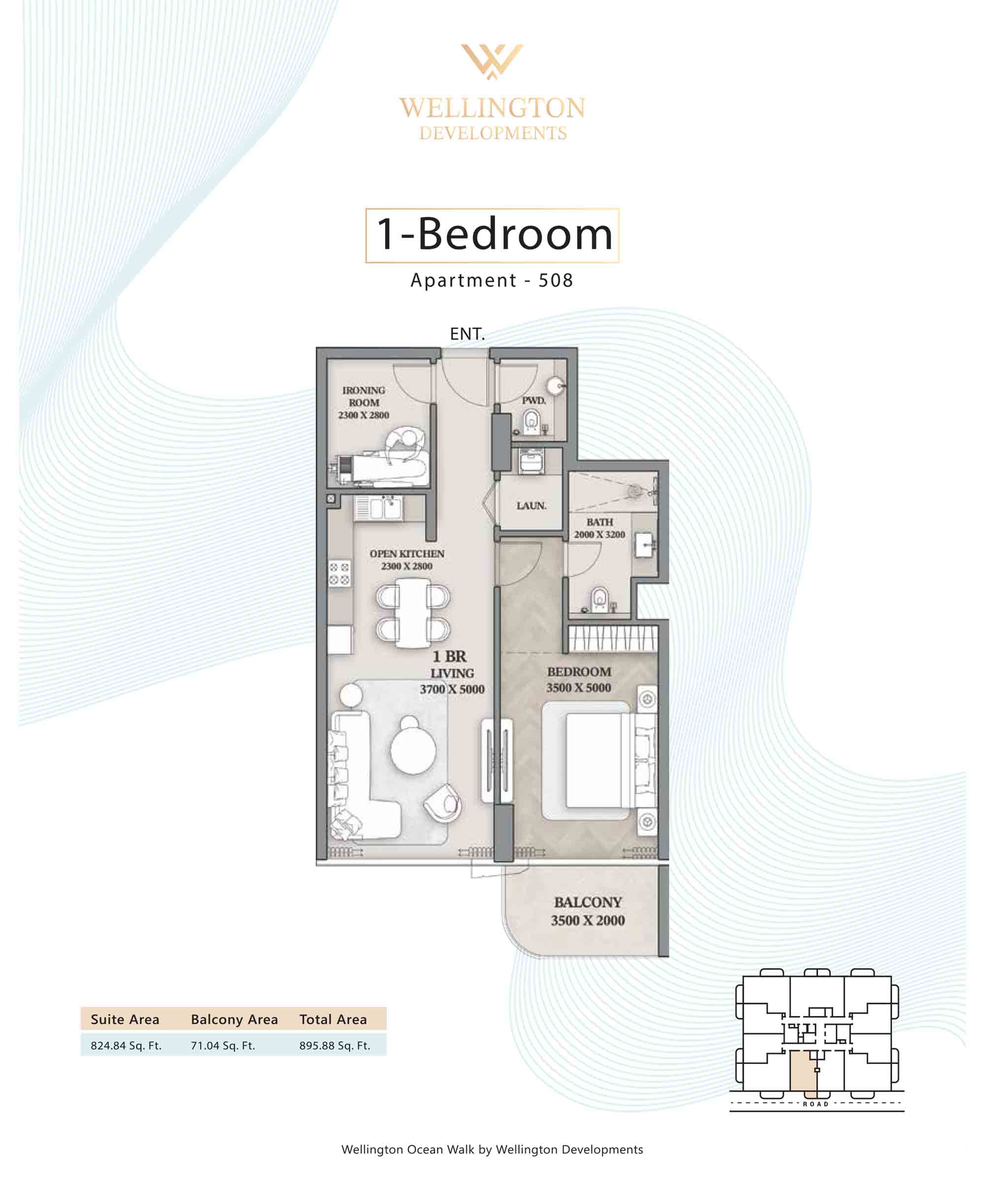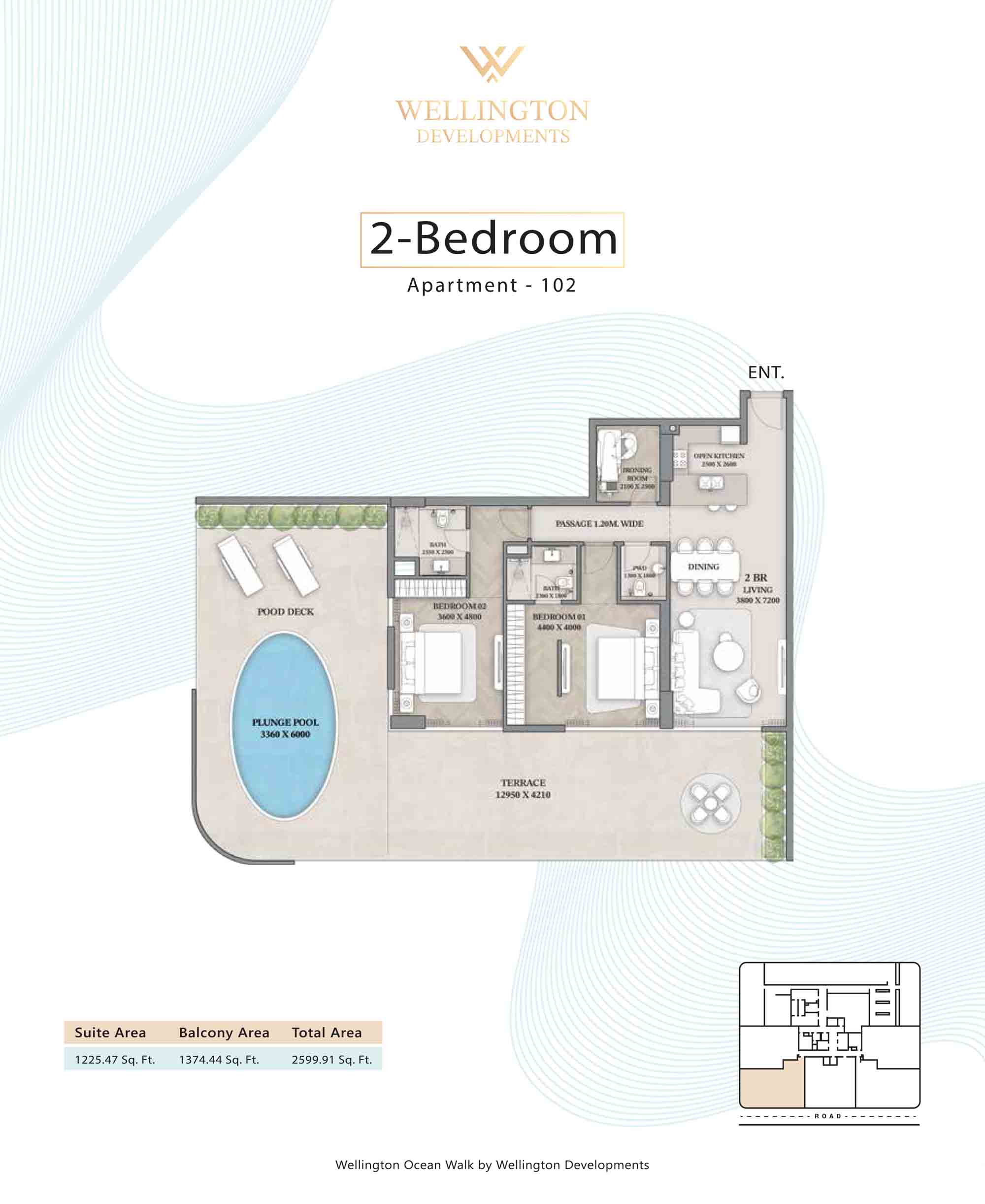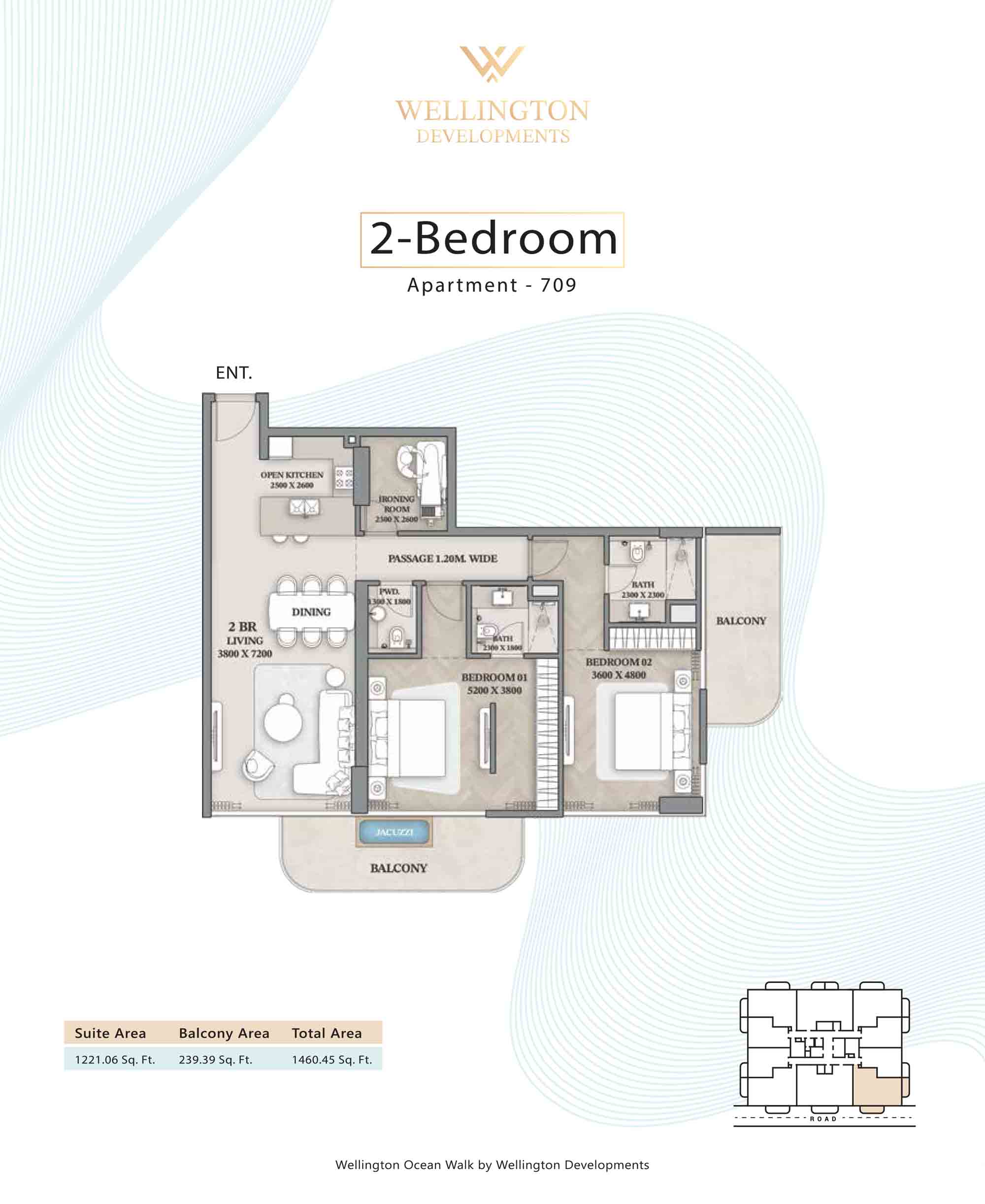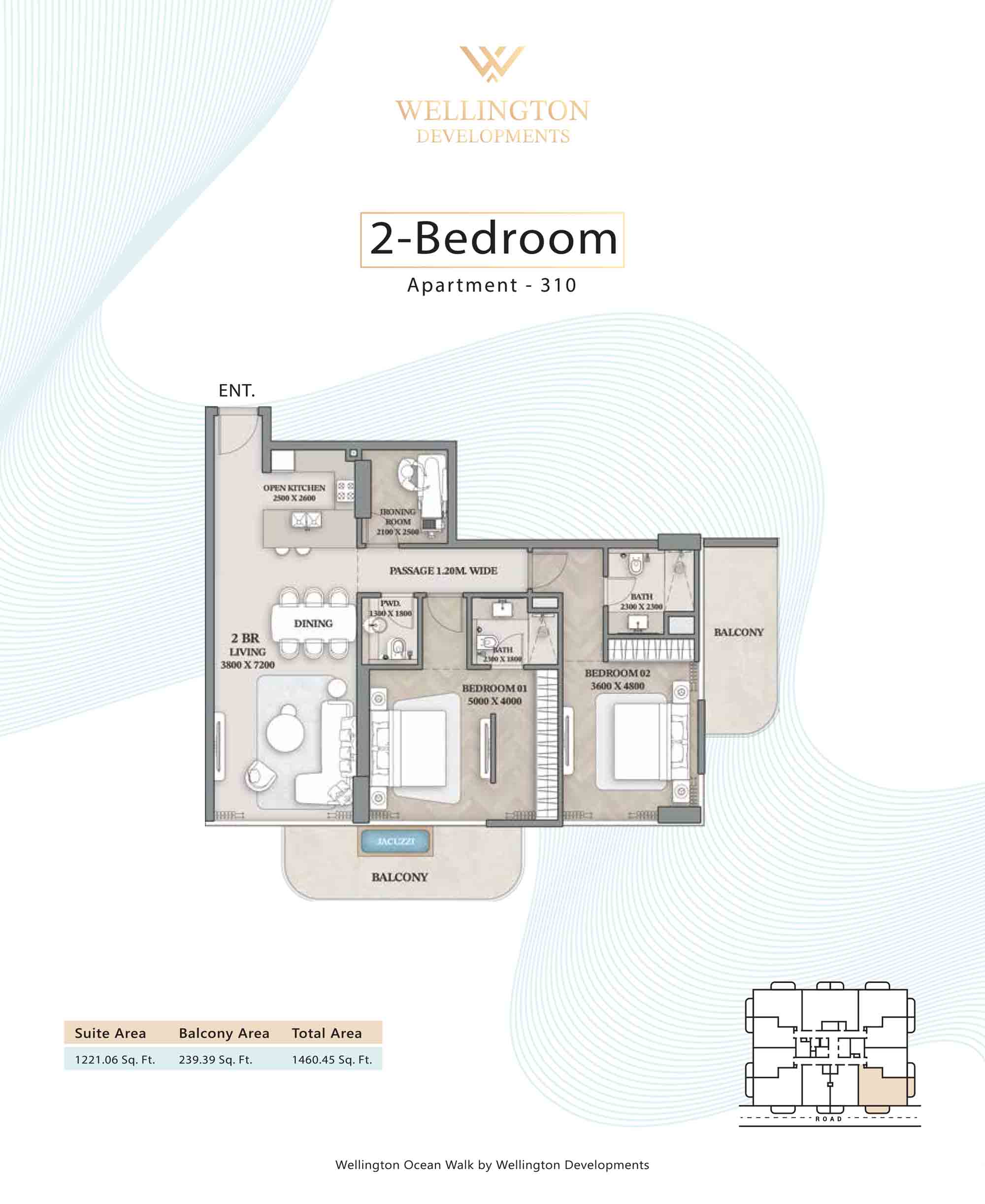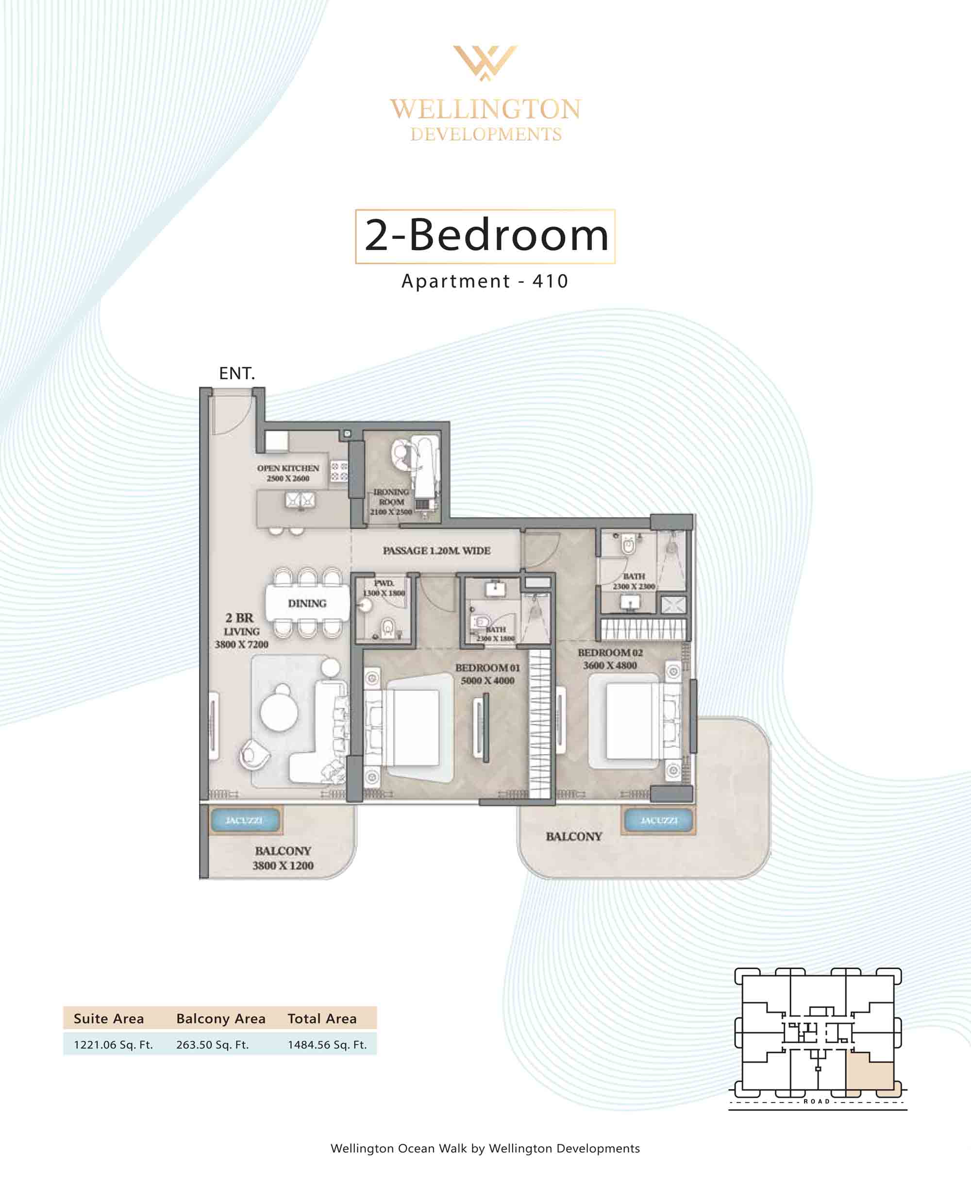 Floor plans at Wellington Ocean Walk include 1 and 2-bedroom apartments and 3-bedroom duplexes with options of either a personal jacuzzi or study room. In this 10-storey masterpiece, only 8 floors offer 79 homes. Each unit is perfect for individuals, couples, and families with vast layouts and open plan design to taste an elevated lifestyle. Here, every sanctuary is defined by high-ceiling windows and vast balconies to observe the serene waterfront and bustling island views. Insides are imagined with neutral and earthy tones, a furnished living space, including a dining zone and an open and fully equipped kitchen. Bedrooms are extremely warm and impressive with opulent lighting, tones, and quality furnishings. The interiors are crafted with meticulous attention to detail, incorporating premium finishes and high-quality materials that exude a luxurious ambience.