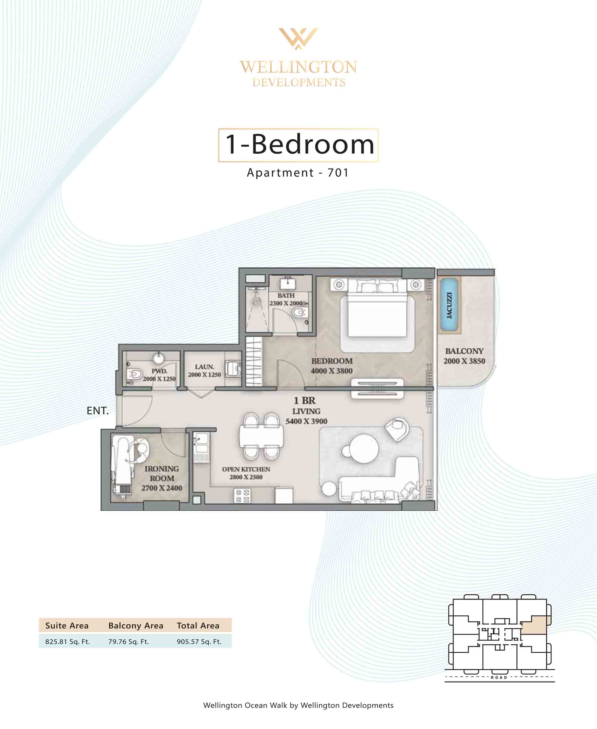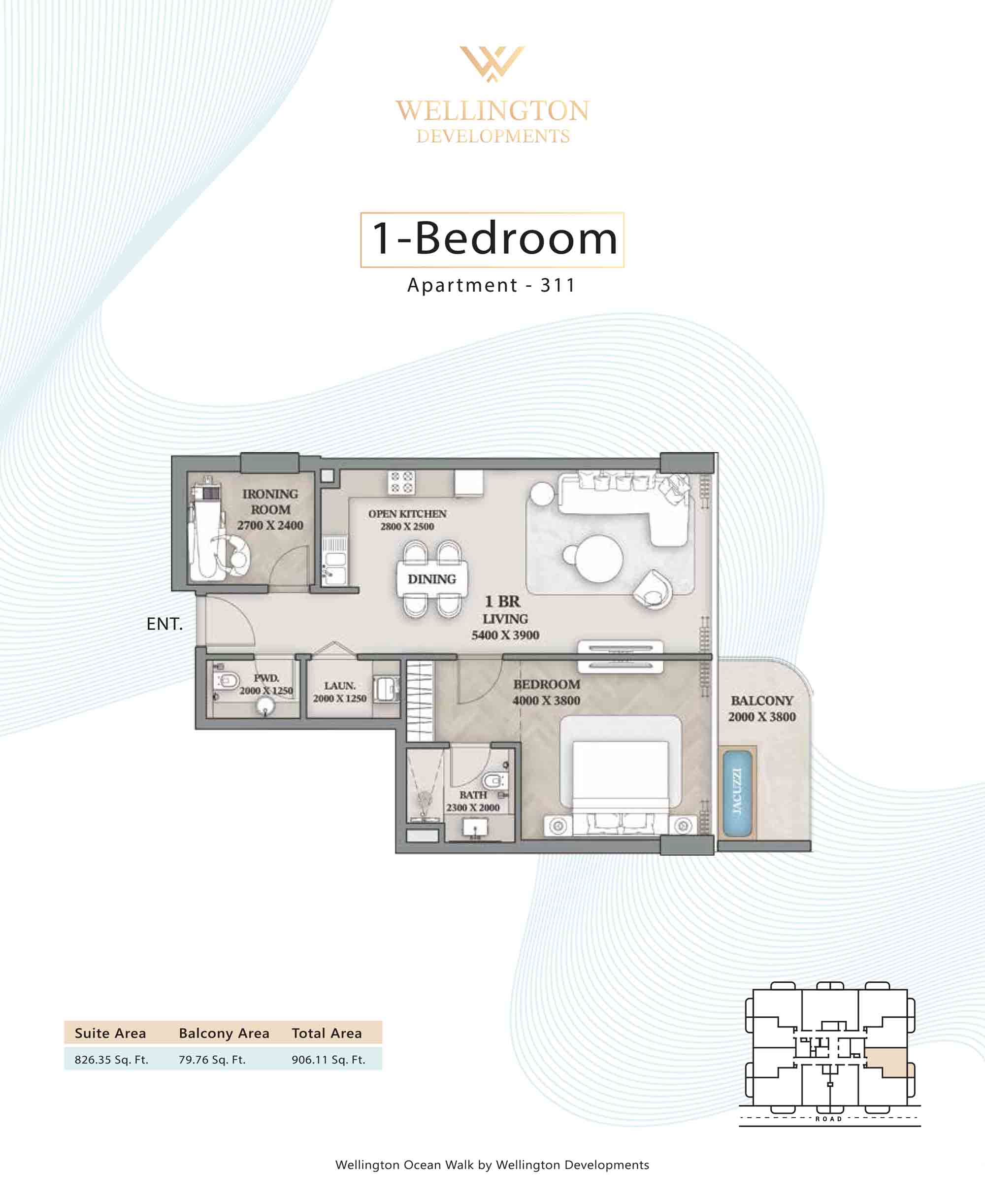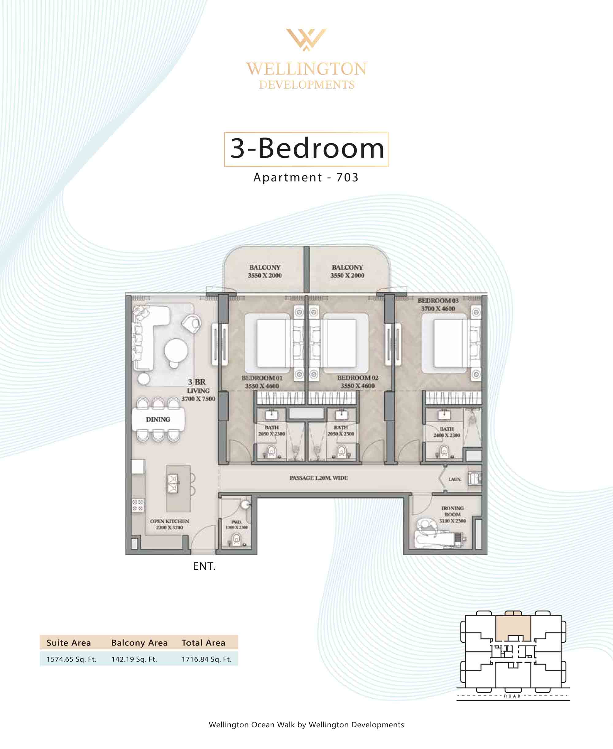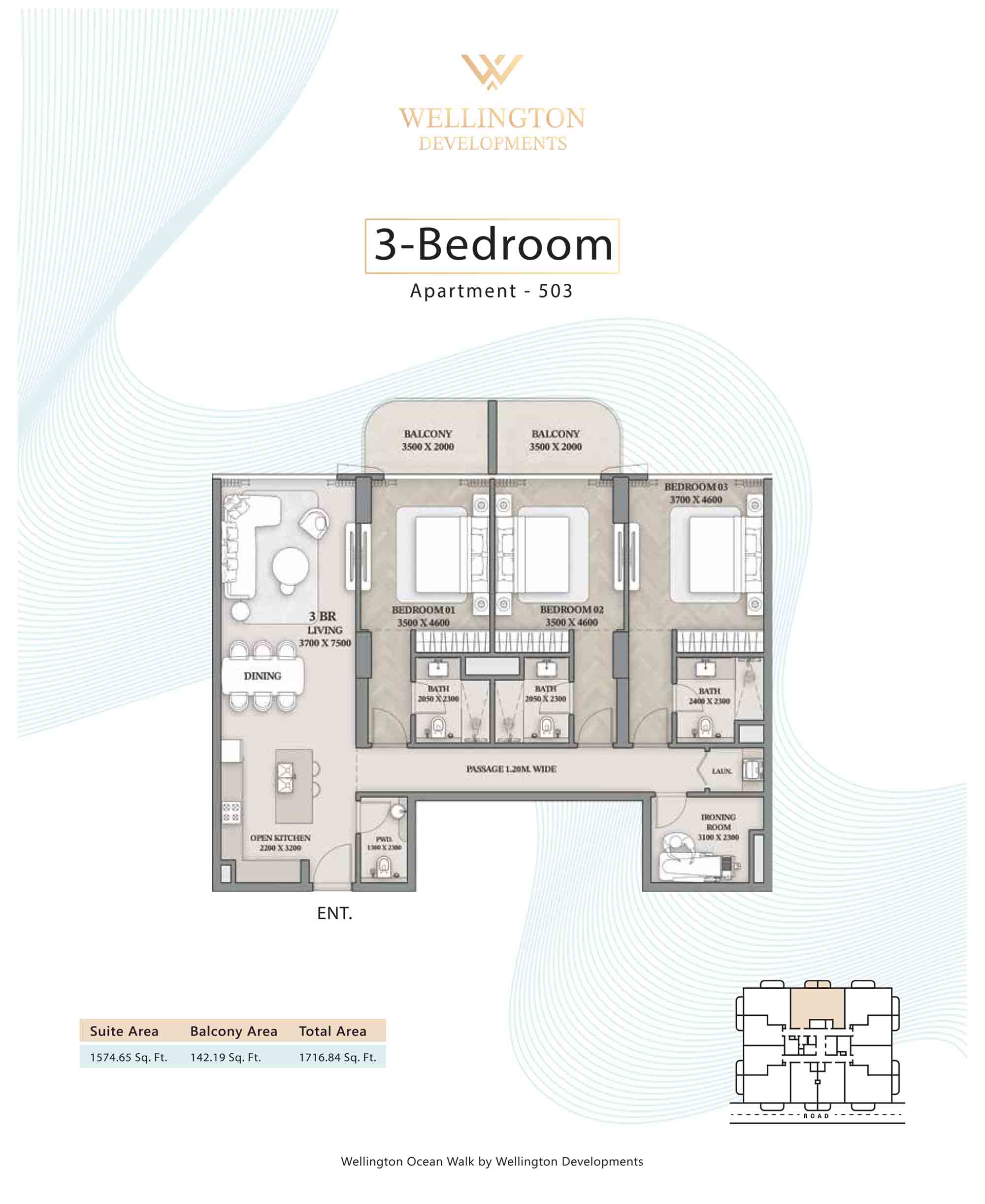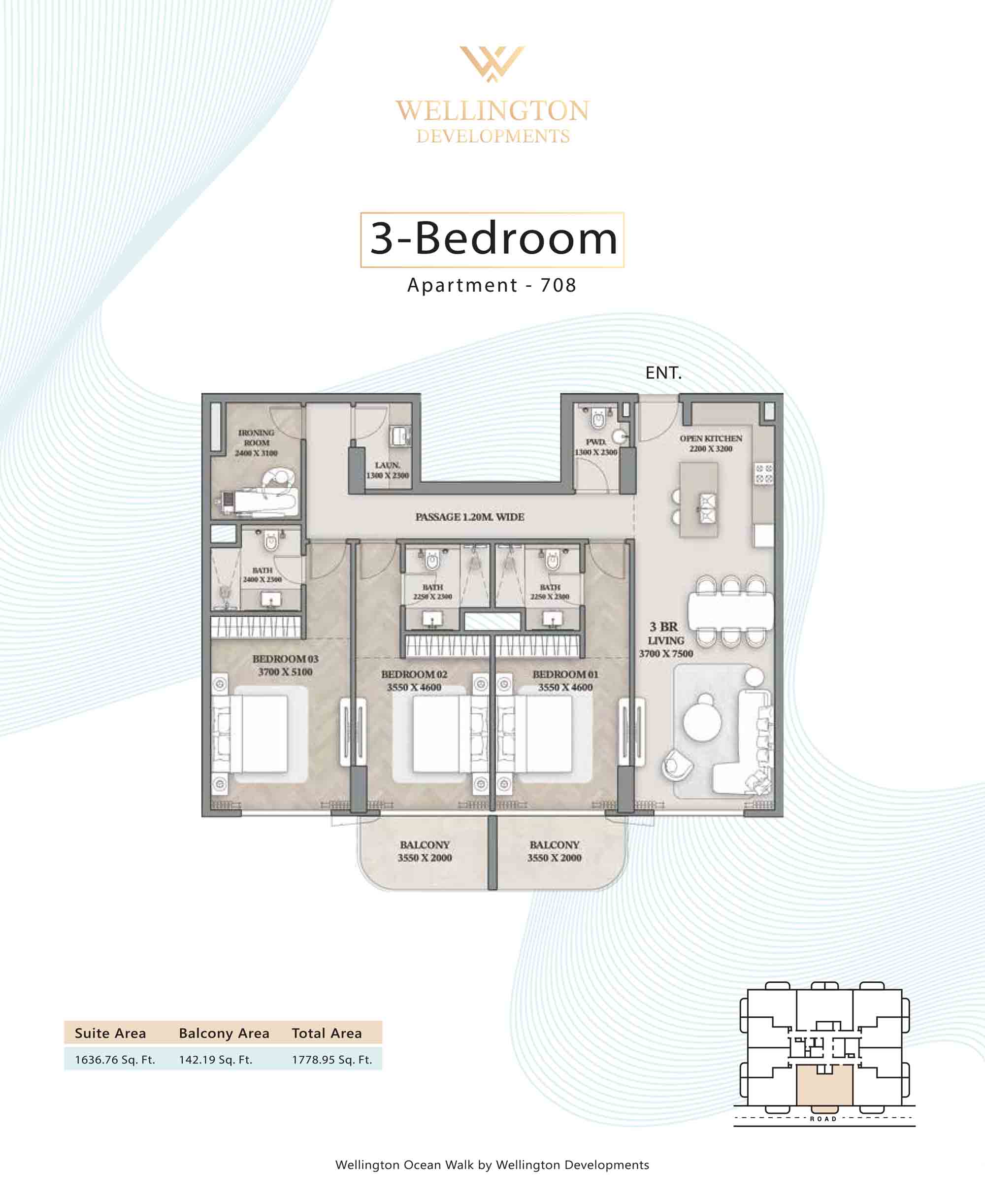 Floor plans at Wellington Ocean Walk include 1 and 2-bedroom apartments and 3-bedroom duplexes with options of either a personal jacuzzi or study room. In this 10-storey masterpiece, only 8 floors offer 79 homes. Each unit is perfect for individuals, couples, and families with vast layouts and open plan design to taste an elevated lifestyle. Here, every sanctuary is defined by high-ceiling windows and vast balconies to observe the serene waterfront and bustling island views. Insides are imagined with neutral and earthy tones, a furnished living space, including a dining zone and an open and fully equipped kitchen. Bedrooms are extremely warm and impressive with opulent lighting, tones, and quality furnishings. The interiors are crafted with meticulous attention to detail, incorporating premium finishes and high-quality materials that exude a luxurious ambience.
