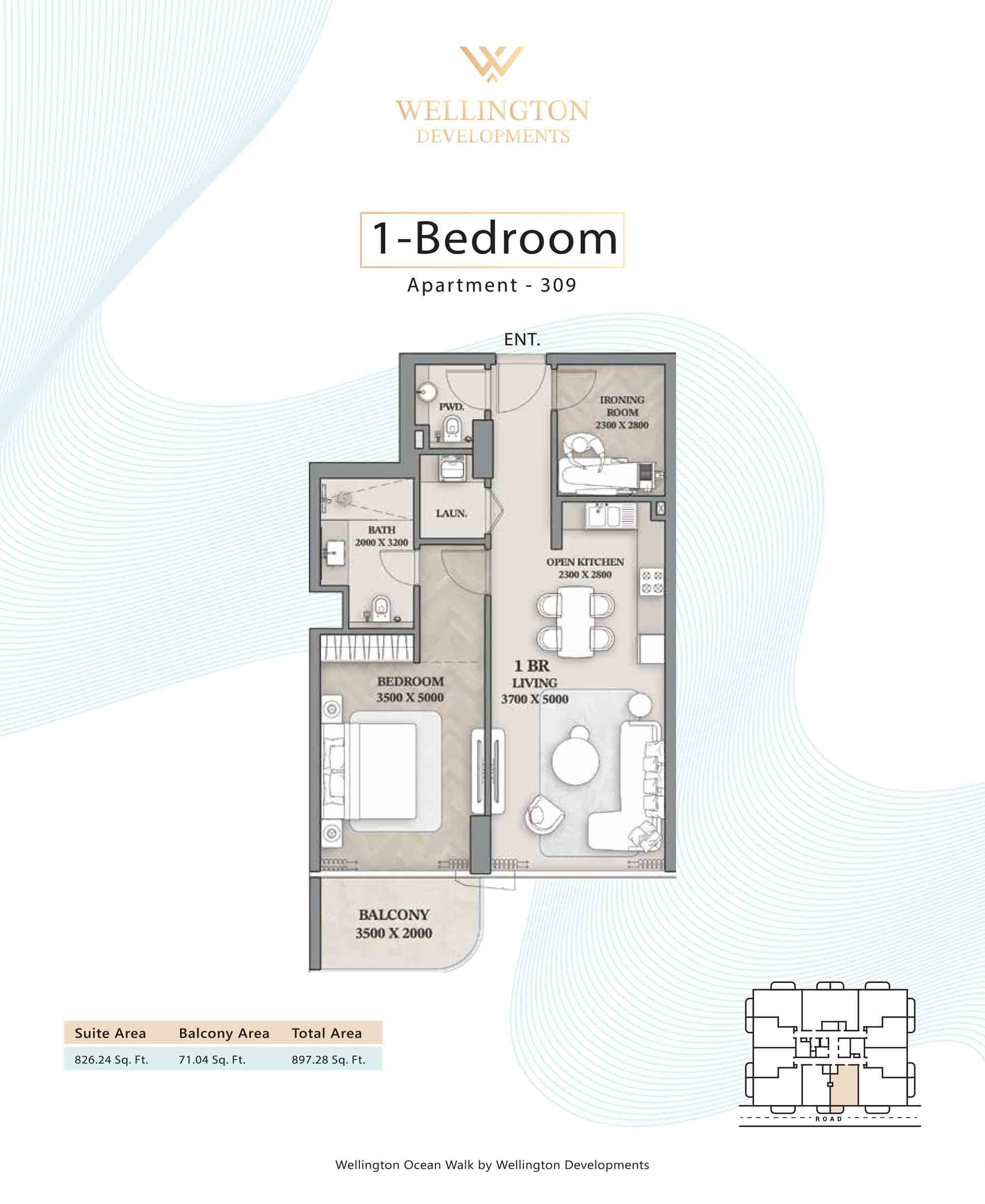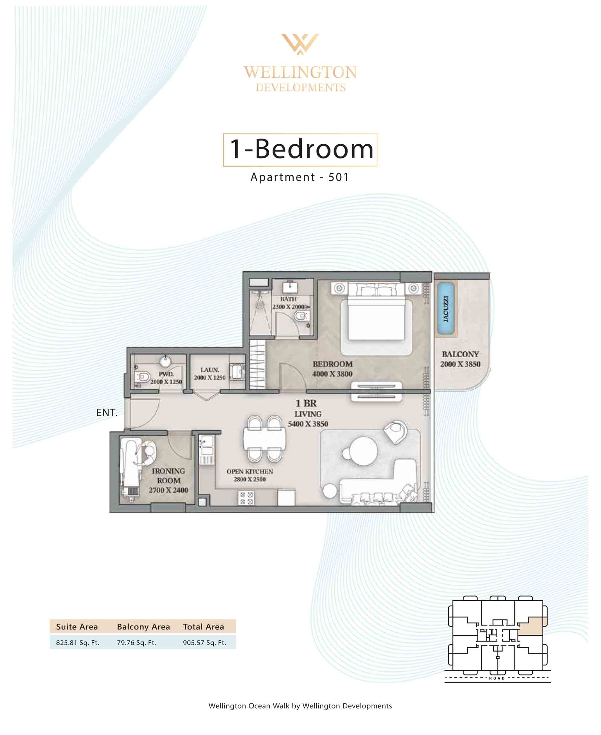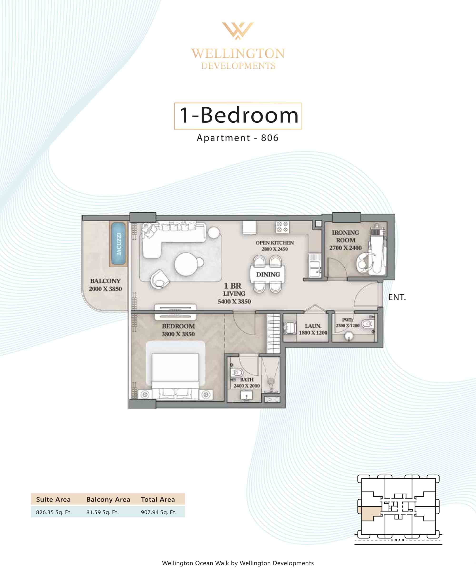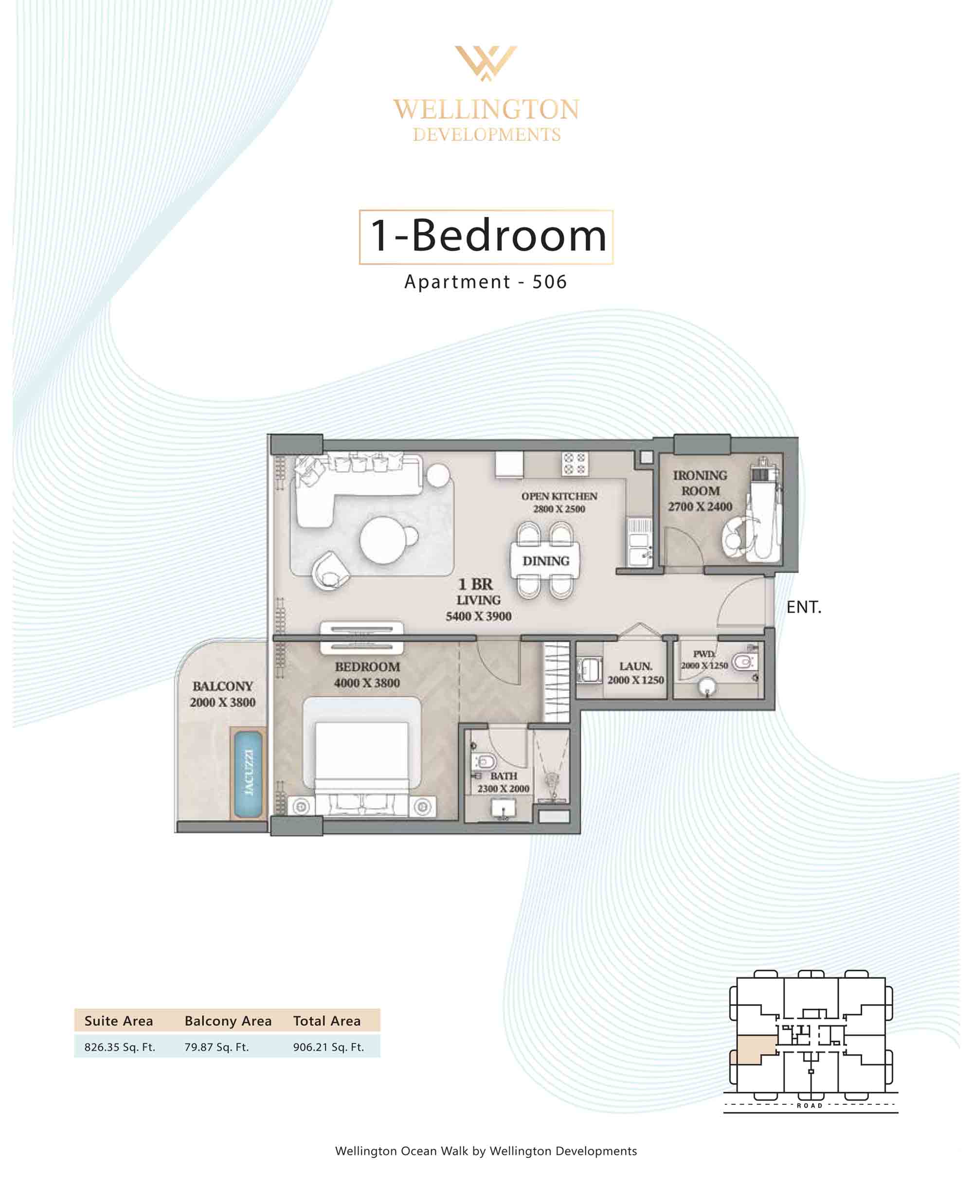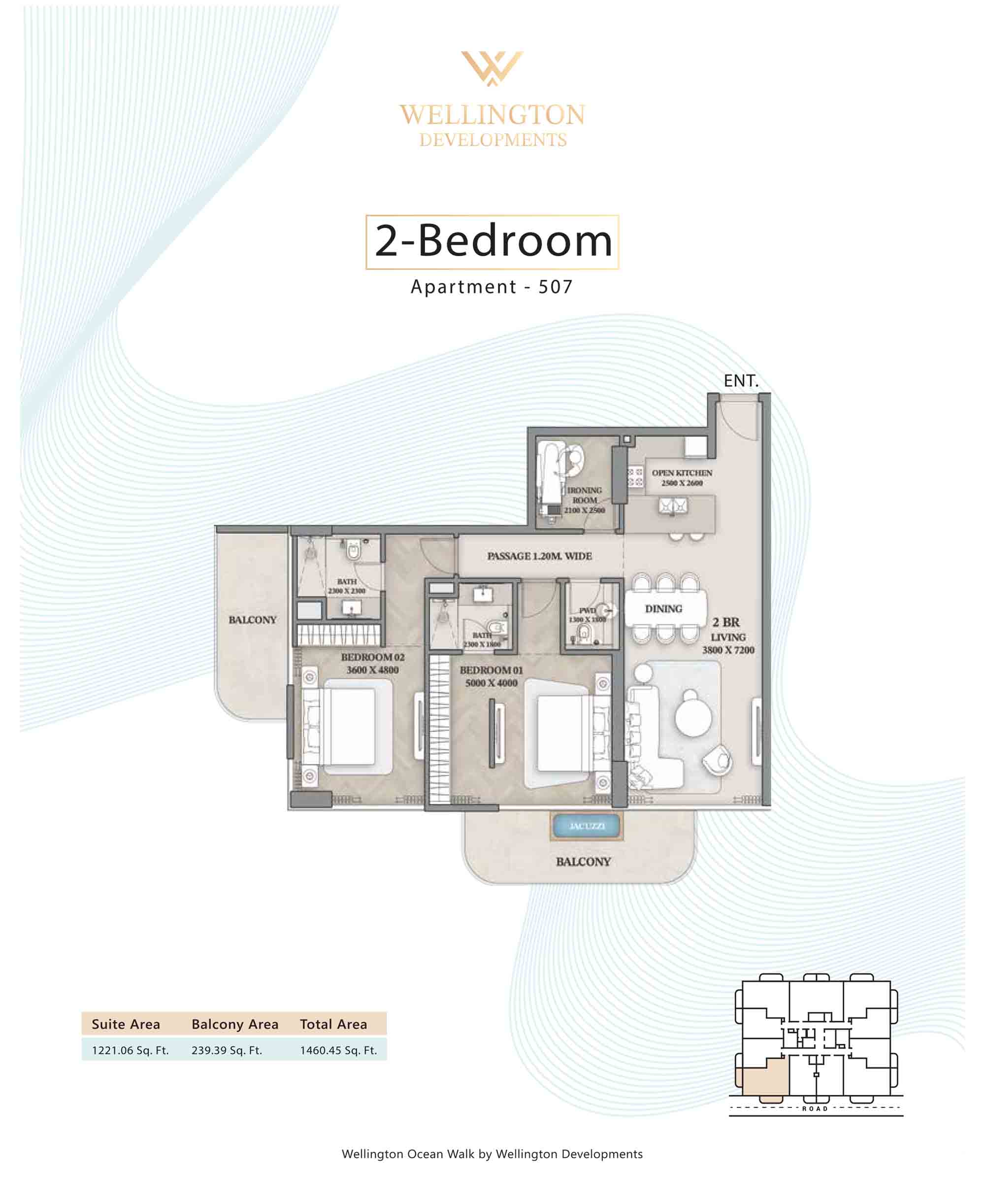Floor plans at Wellington Ocean Walk include 1 and 2-bedroom apartments and 3-bedroom duplexes with options of either a personal jacuzzi or study room. In this 10-storey masterpiece, only 8 floors offer 79 homes. Each unit is perfect for individuals, couples, and families with vast layouts and open plan design to taste an elevated lifestyle. Here, every sanctuary is defined by high-ceiling windows and vast balconies to observe the serene waterfront and bustling island views. Insides are imagined with neutral and earthy tones, a furnished living space, including a dining zone and an open and fully equipped kitchen. Bedrooms are extremely warm and impressive with opulent lighting, tones, and quality furnishings. The interiors are crafted with meticulous attention to detail, incorporating premium finishes and high-quality materials that exude a luxurious ambience.