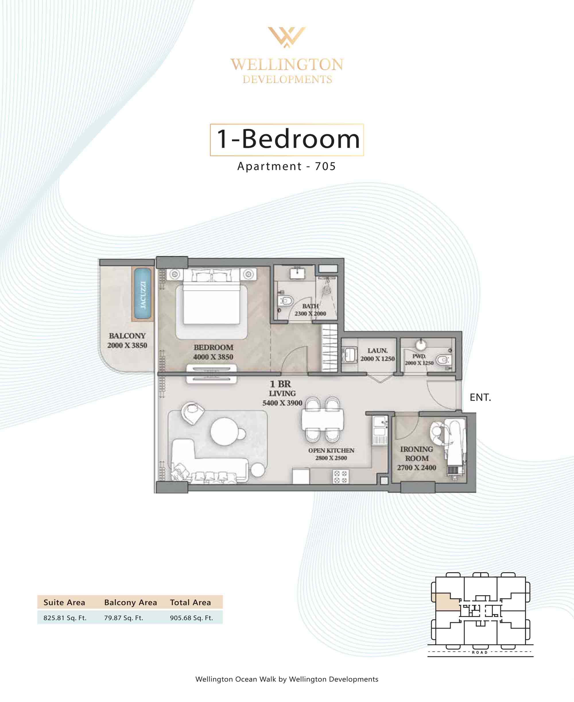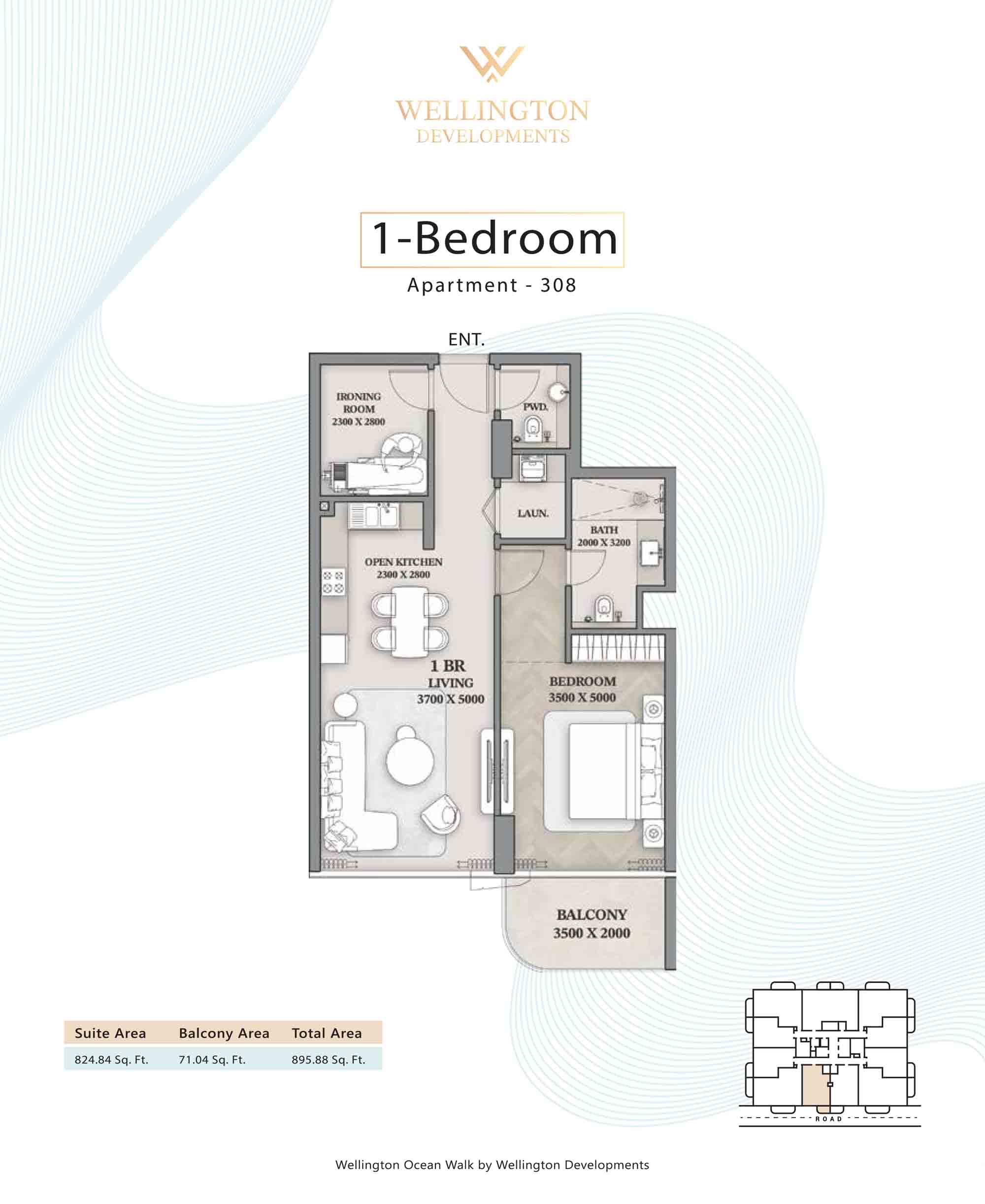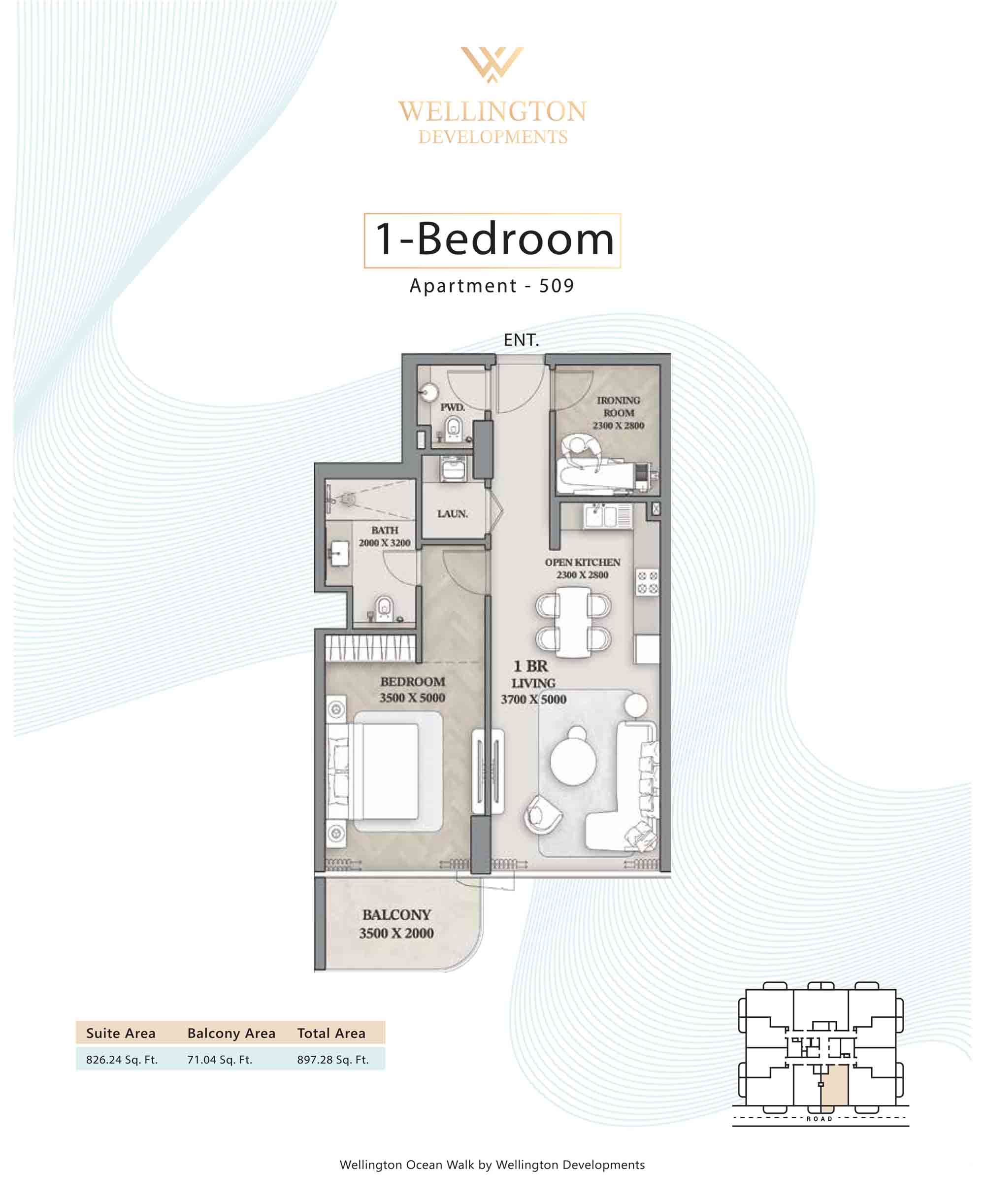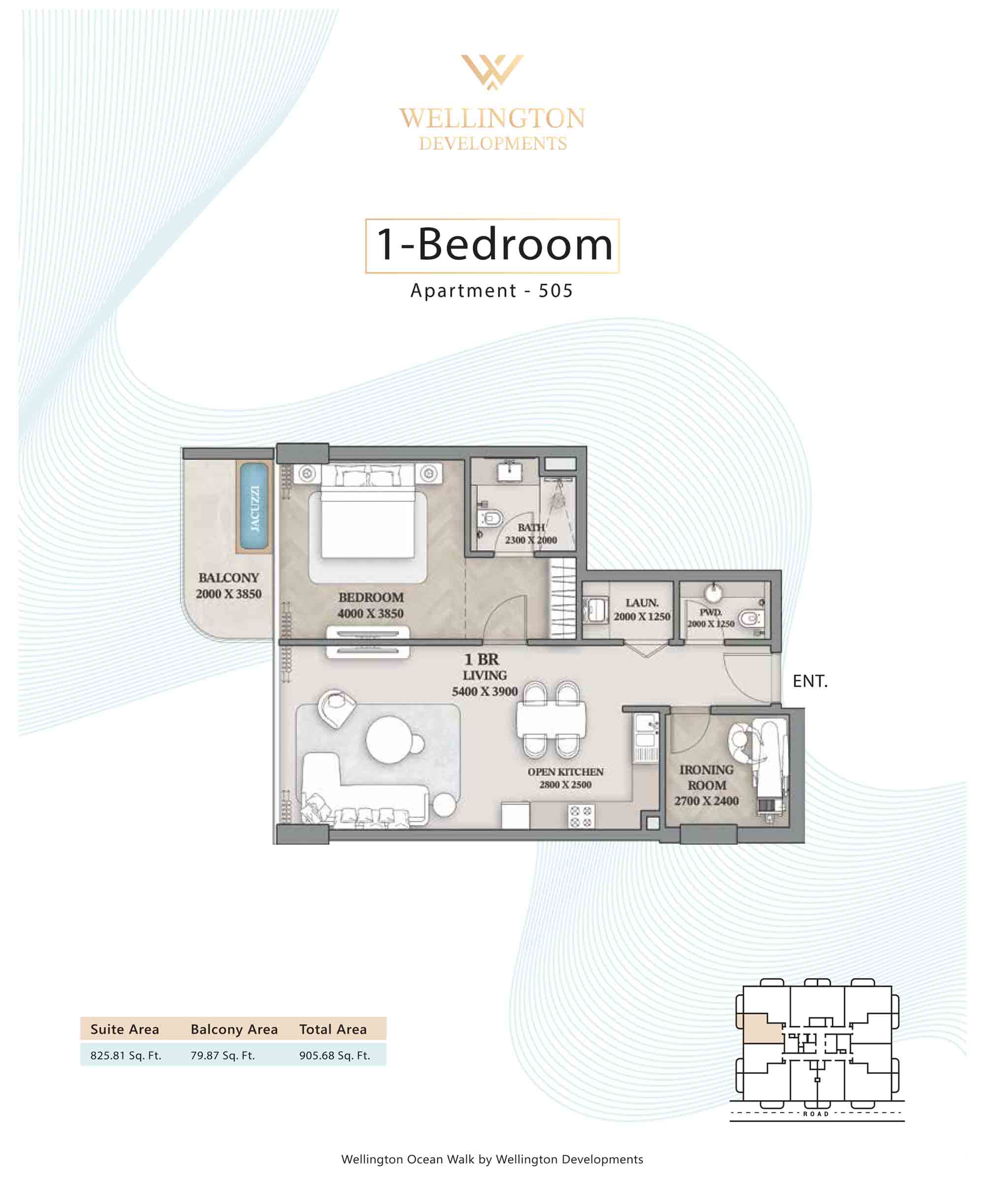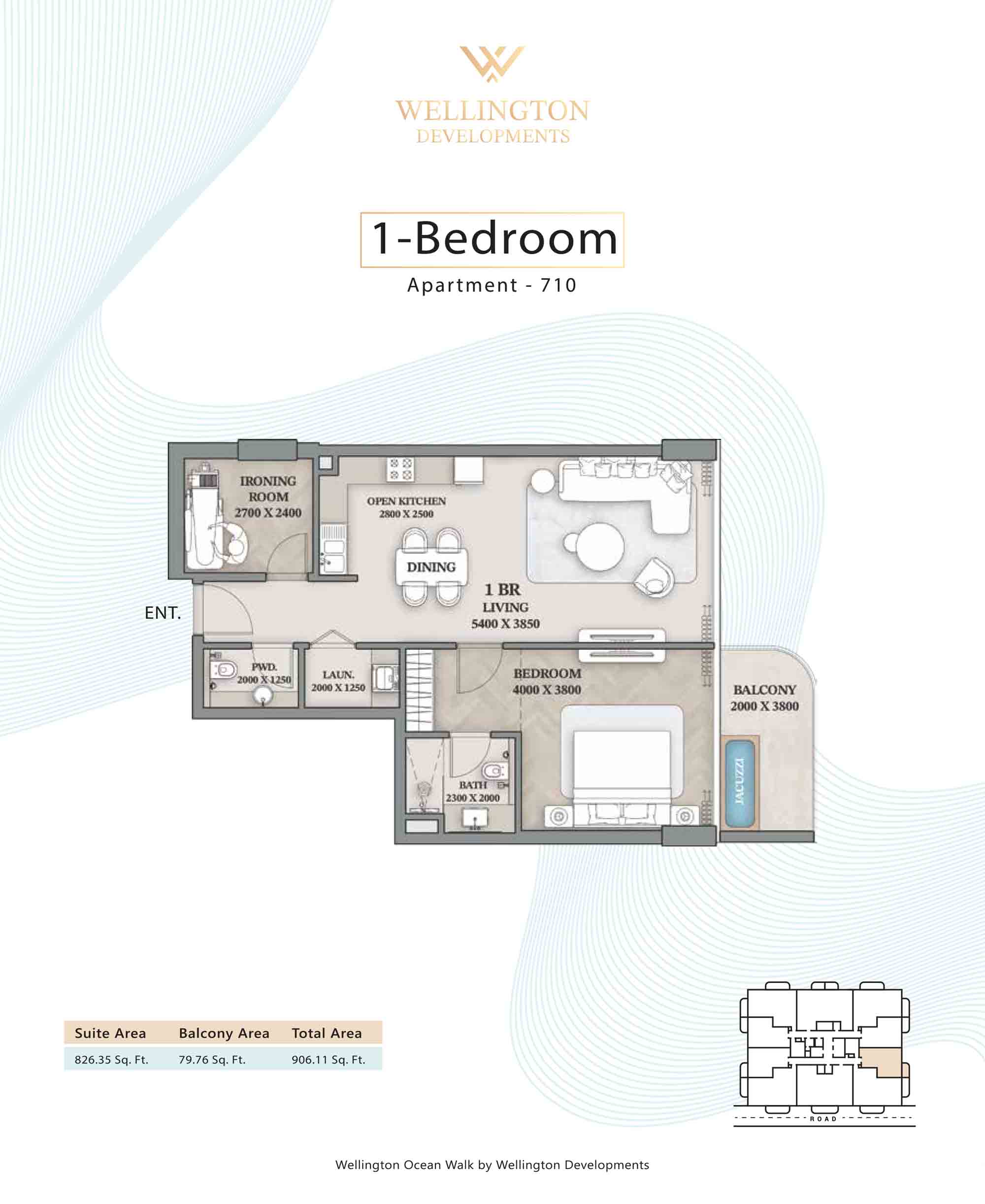Floor plans at Wellington Ocean Walk include 1 and 2-bedroom apartments and 3-bedroom duplexes with options of either a personal jacuzzi or study room. In this 10-storey masterpiece, only 8 floors offer 79 homes. Each unit is perfect for individuals, couples, and families with vast layouts and open plan design to taste an elevated lifestyle. Here, every sanctuary is defined by high-ceiling windows and vast balconies to observe the serene waterfront and bustling island views. Insides are imagined with neutral and earthy tones, a furnished living space, including a dining zone and an open and fully equipped kitchen. Bedrooms are extremely warm and impressive with opulent lighting, tones, and quality furnishings. The interiors are crafted with meticulous attention to detail, incorporating premium finishes and high-quality materials that exude a luxurious ambience.